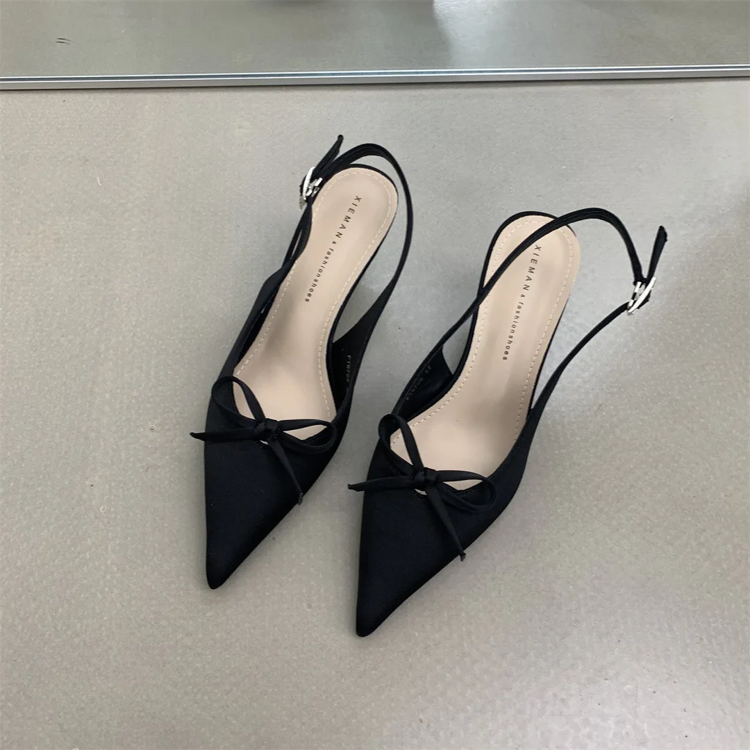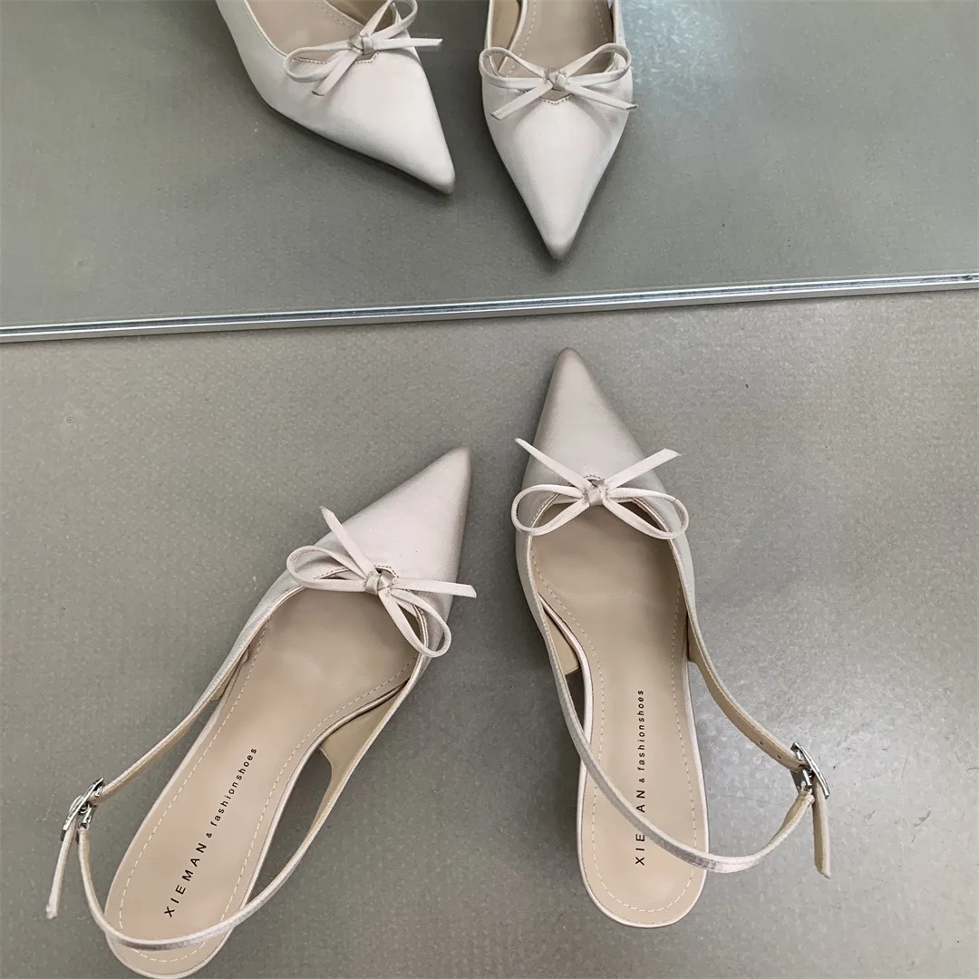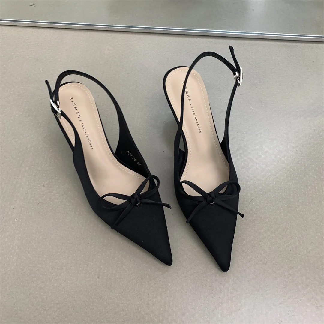 Cyflymder Pointed Heel Sandals Black Shoes for Women 2025 Summer Beige High Comfort Girls Bow Elastic Band Closed Stiletto Low New Fashi