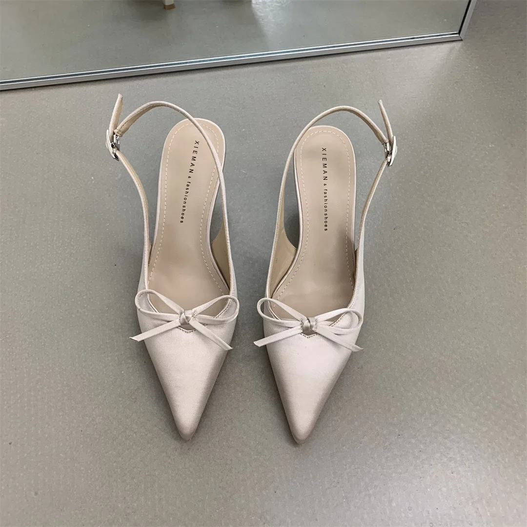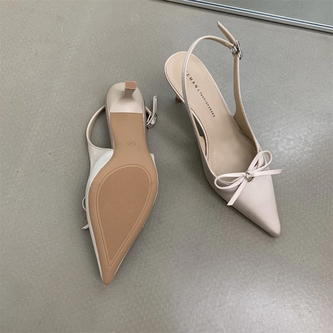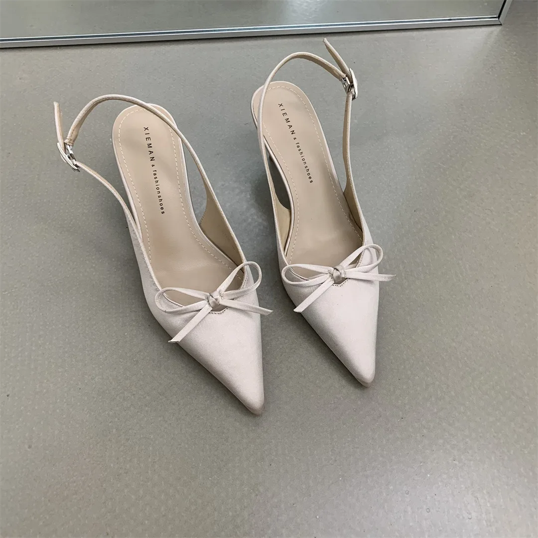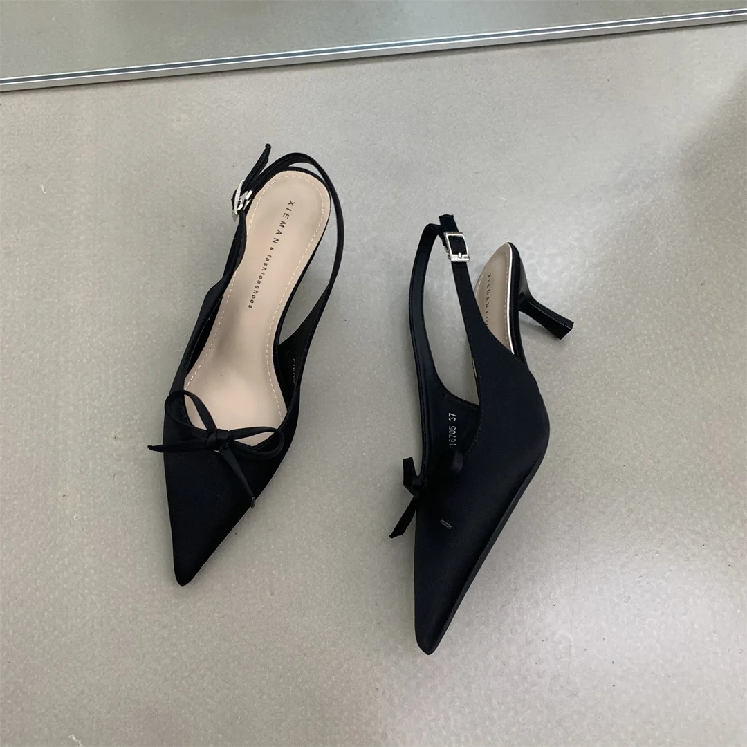 Cyflymder Pointed Heel Sandals Black Shoes for Women 2025 Summer Beige High Comfort Girls Bow Elastic Band Closed Stiletto Low New Fashi