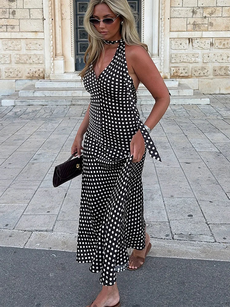 Cyflymder Polka Dot Halter Backless Long Dress Women Off Shoulder V-neck Scarf Sexy Sleeveless Dresses 2025 Summer Street Holiday Robe