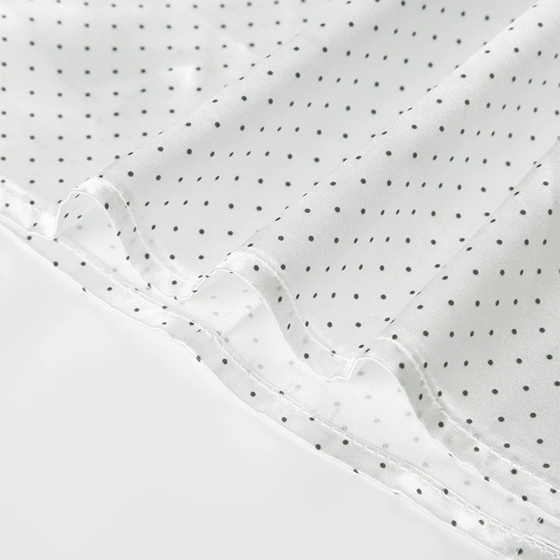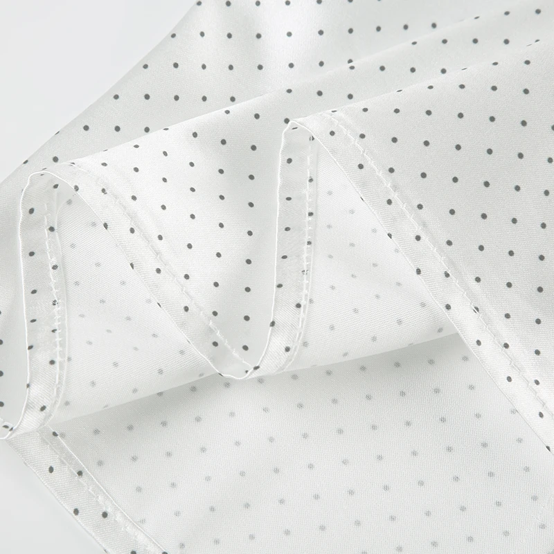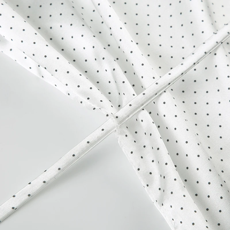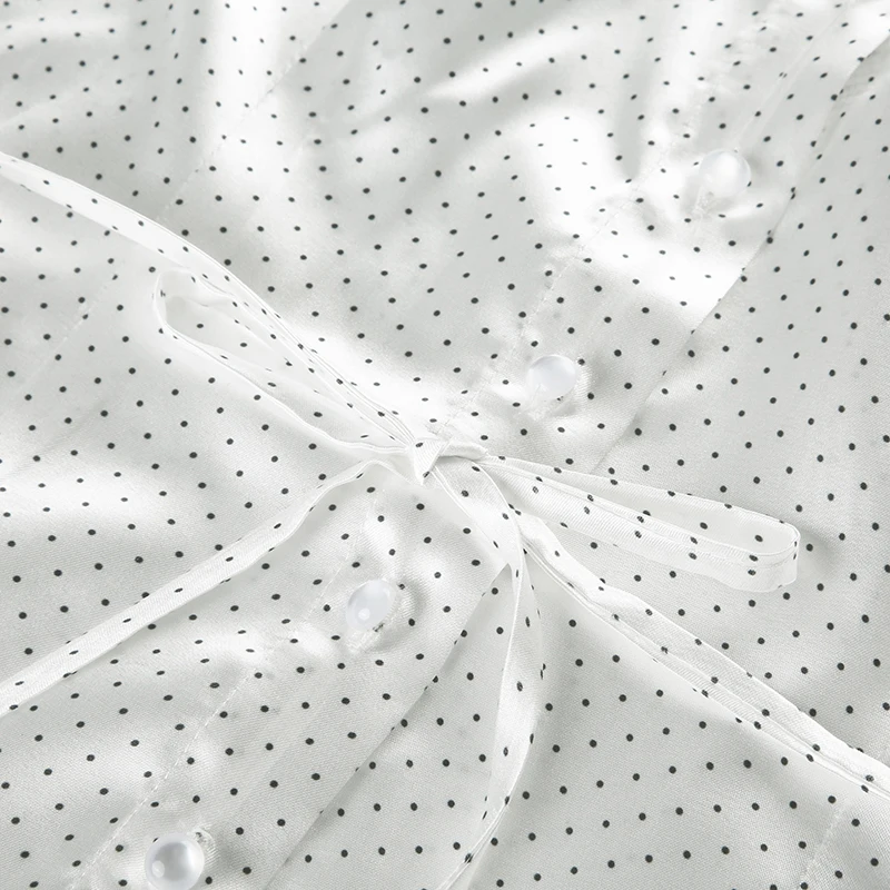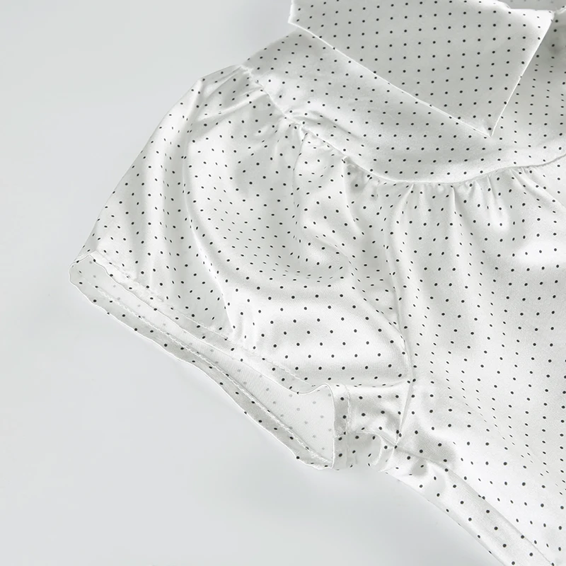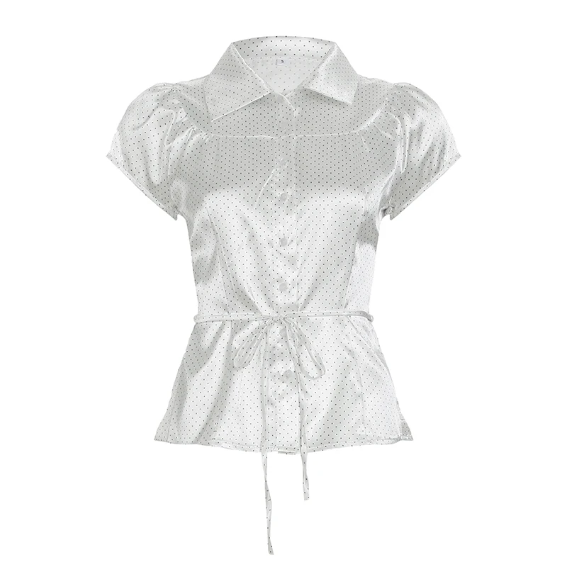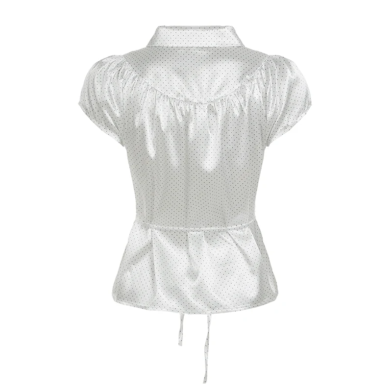 Cyflymder Polka Dot Print Satin Blouse French Style Single-breasted Short Sleeve Top Elegant Slim-fitting Back Tie-up Shirts Chic