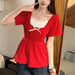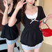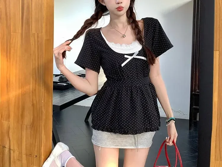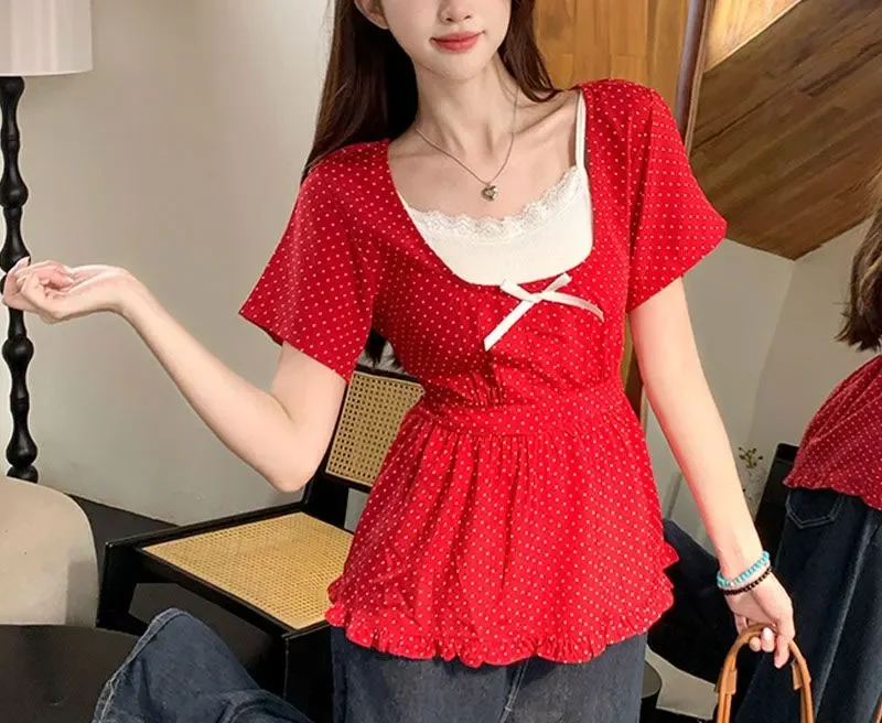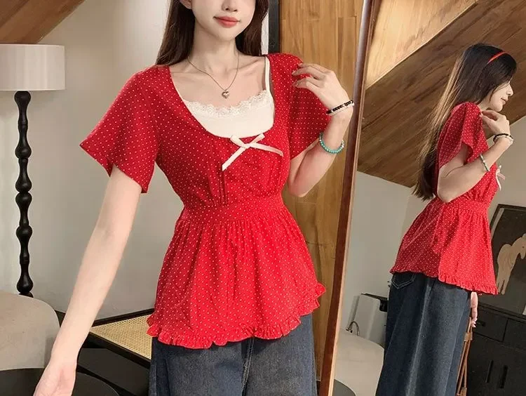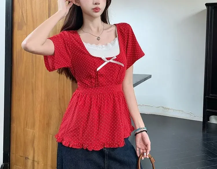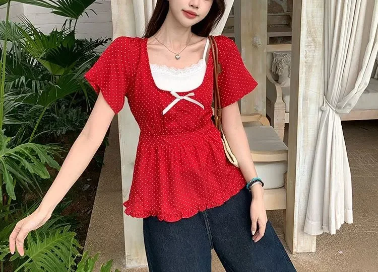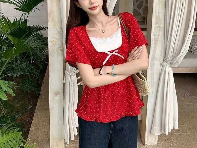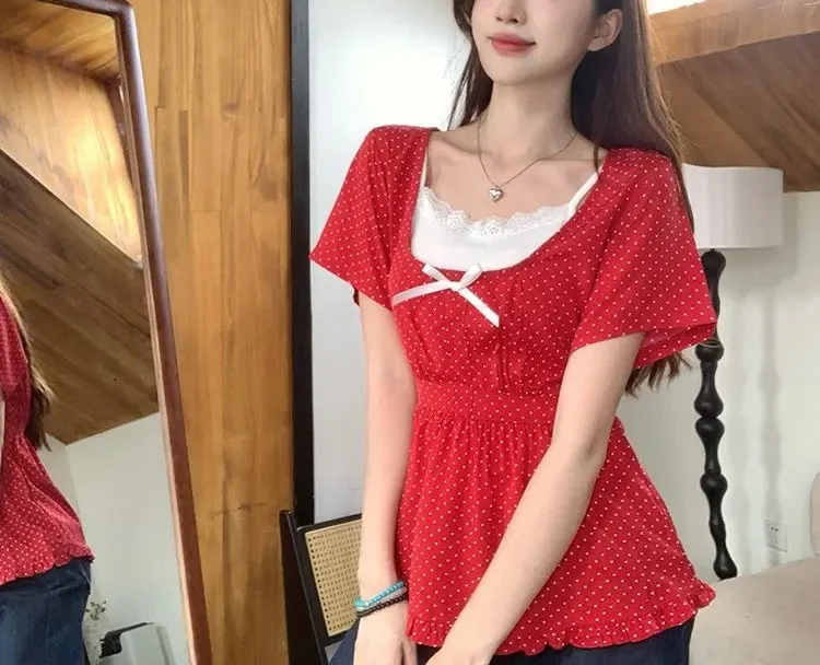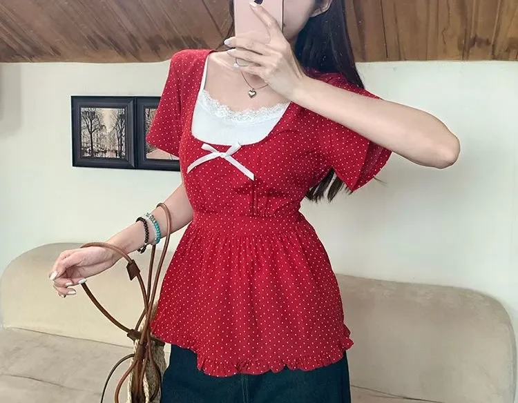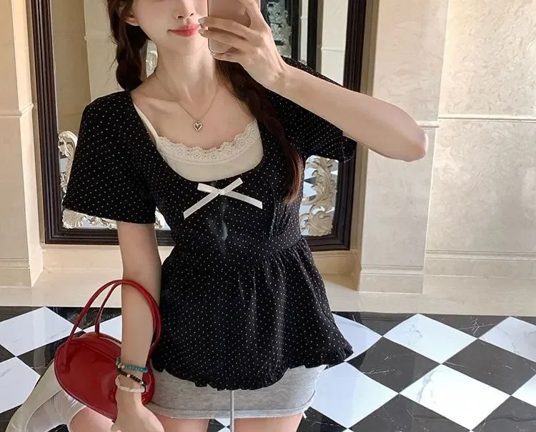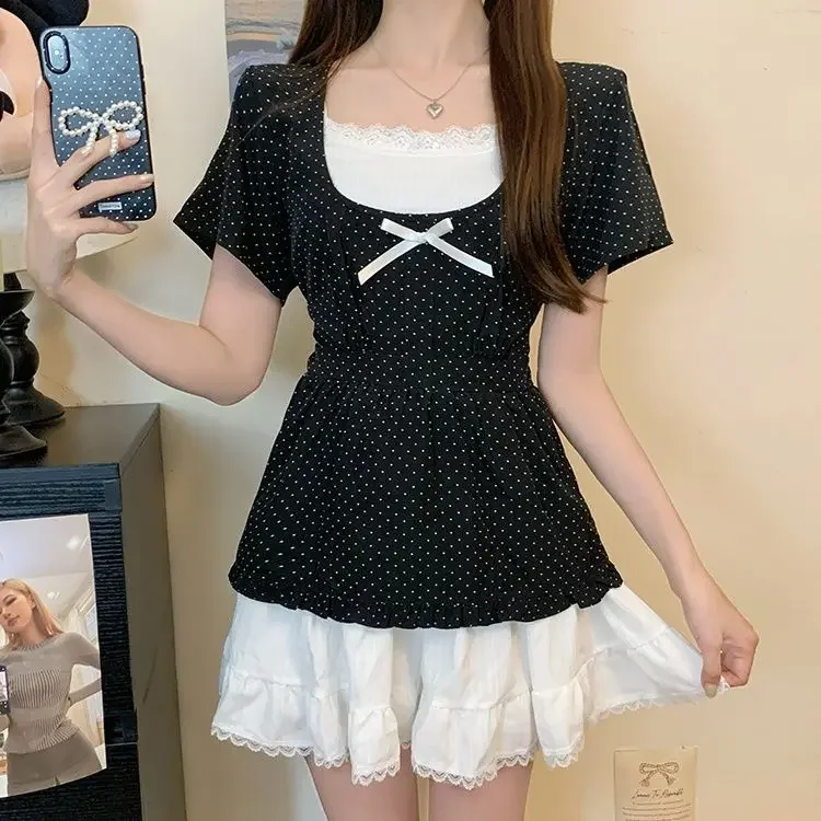 Cyflymder Polka Dot Stylish Bow Waist Shirts Female clothing Two Piece Set Summer New Square Collar Vintage Short Sleeve Lace Folds Blouse