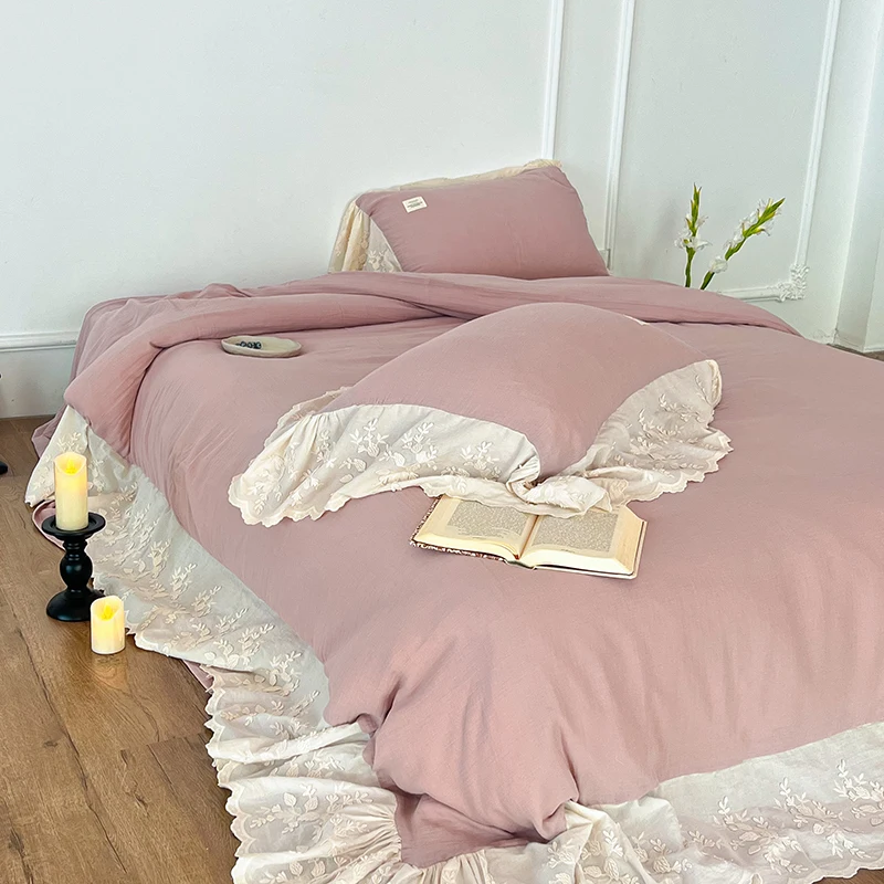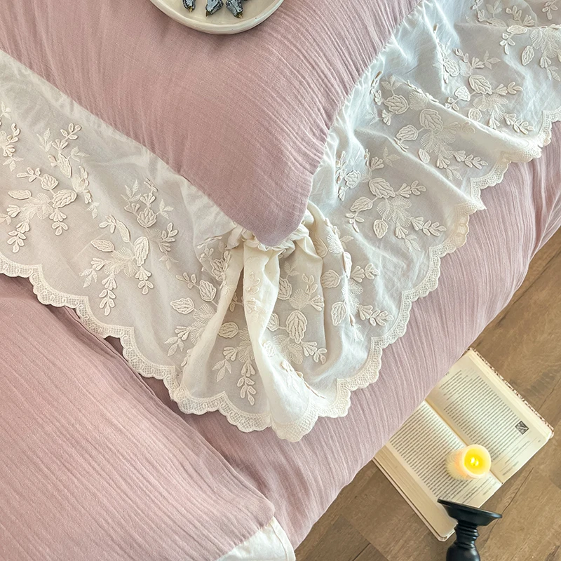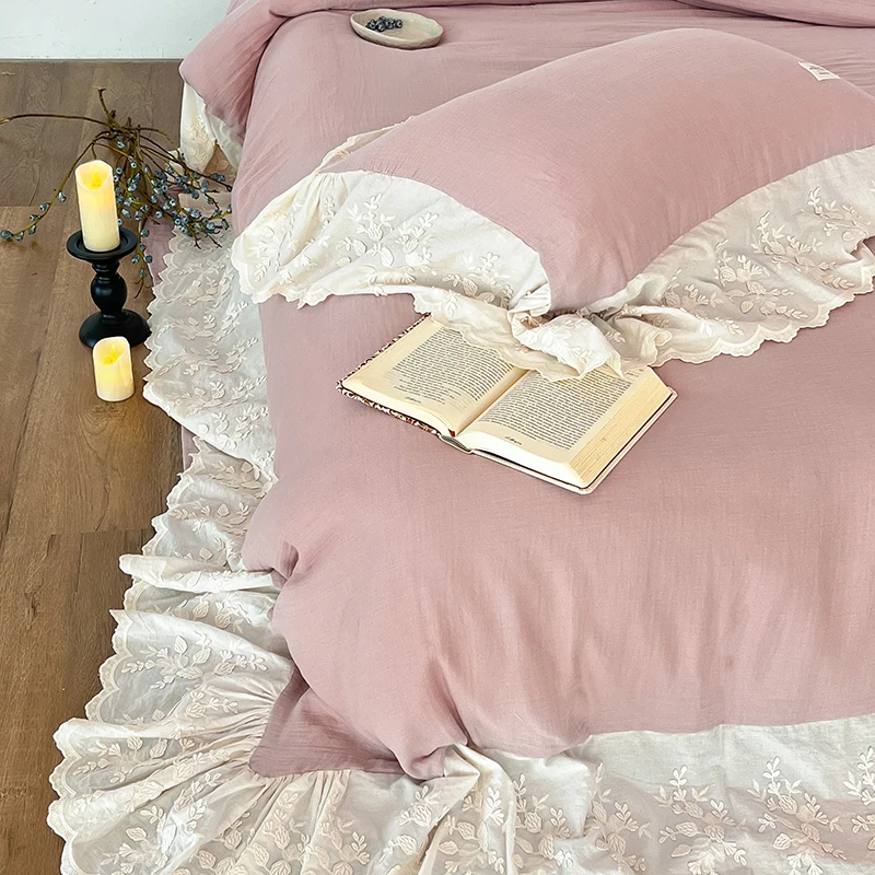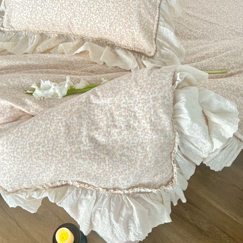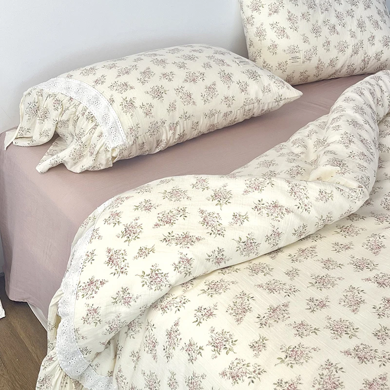 Cyflymder Premium 100% Gauze Cotton Farmhouse Floral Large Ruffles Bedding Set Soft Crepe Duvet Cover Bed Sheet/Fitted Sheet Pillowcases