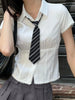 Cyflymder Prepppy Style Casual Solid Lace Trim Blouse Slim Turn Down Collar Short Sleeve Shirts Women Summer Fashion Ladies