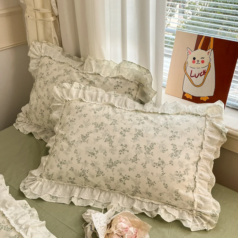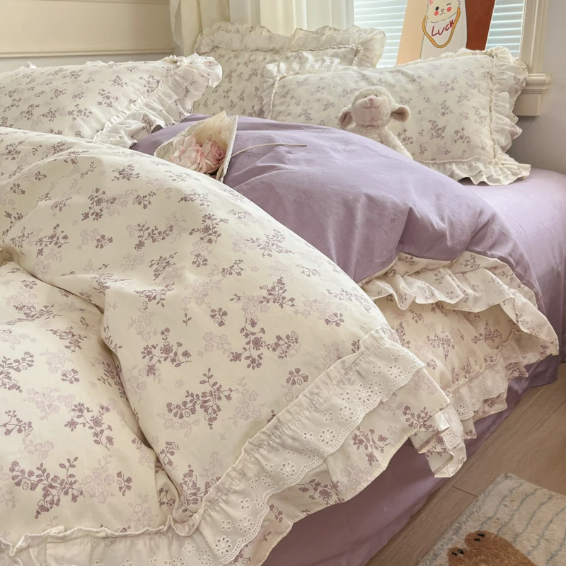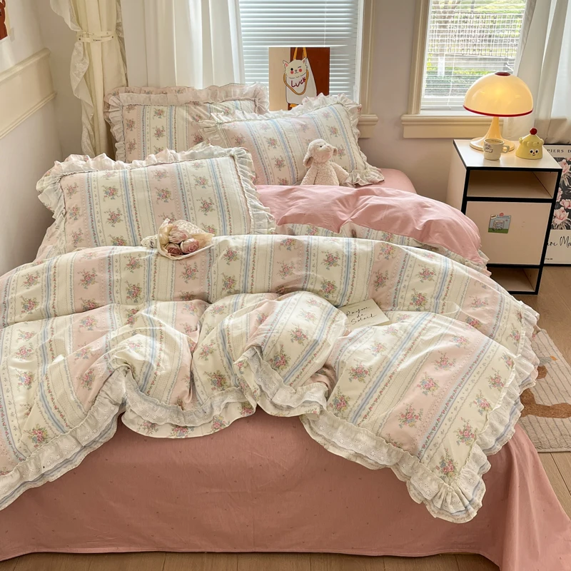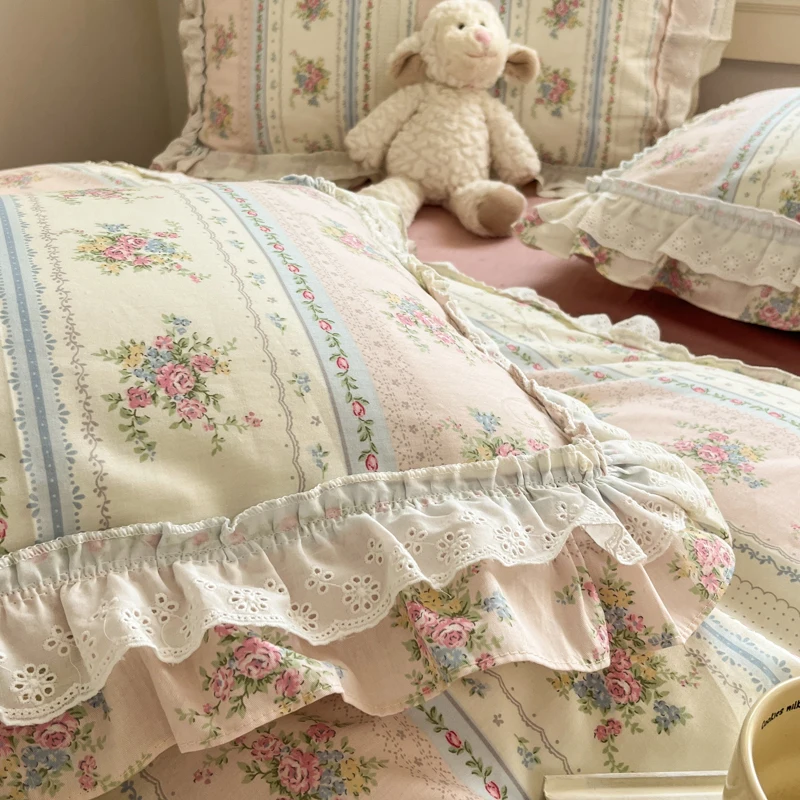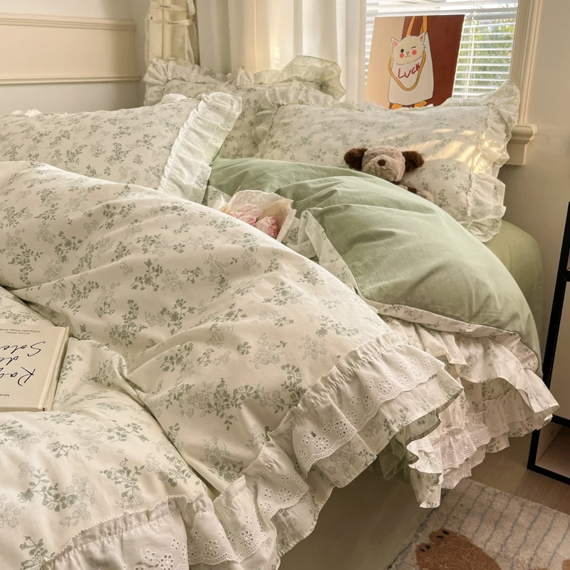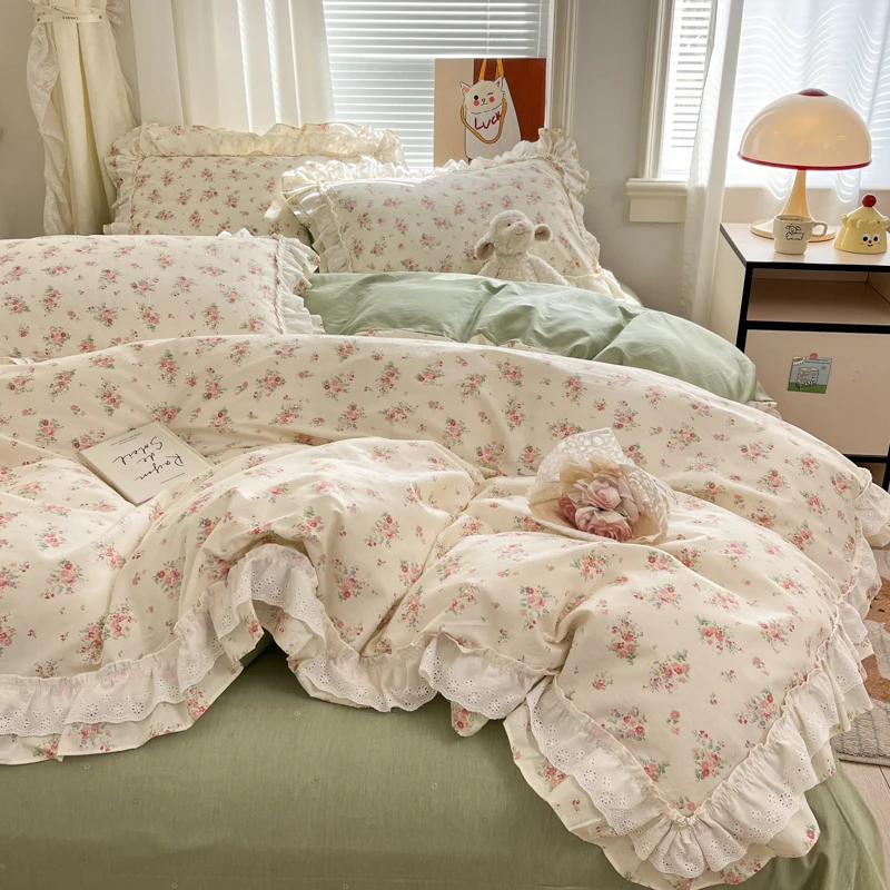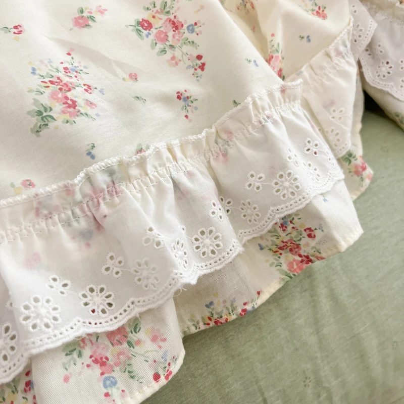 Cyflymder Princess Style Lace Ruffles 100% Cotton Bedding Set Floral Pastoral Style Duvet Cover Flat/Fitted Bed Sheet Pillowcases 3/4Pcs