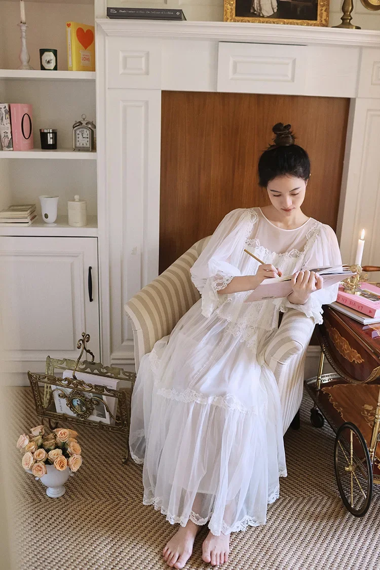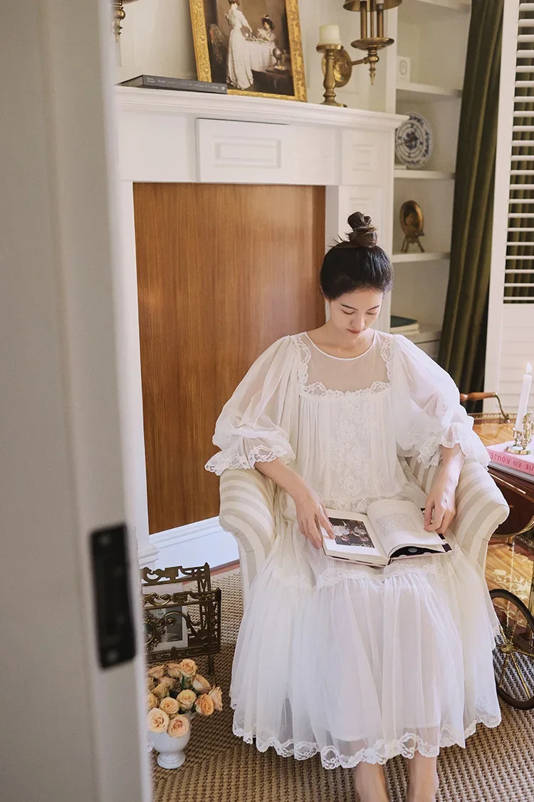 Cyflymder Princess White Vintage Long Nightgowns Gauze Round Neck Puff Long Sleeves Cotton Nightie Loose Design Embroidery Nightdress New