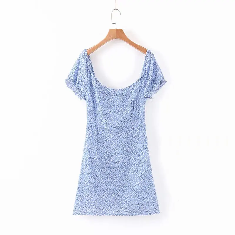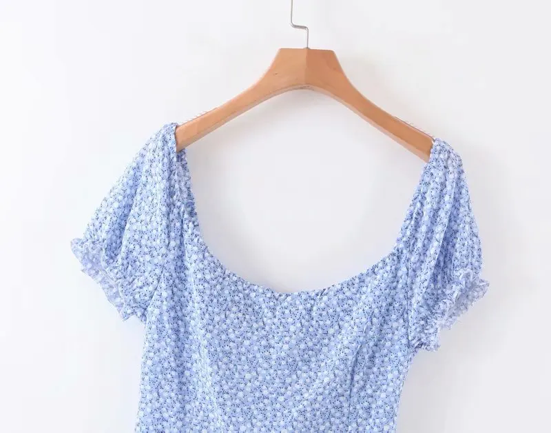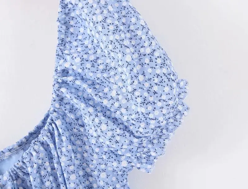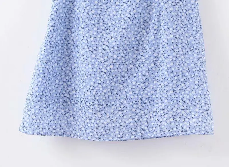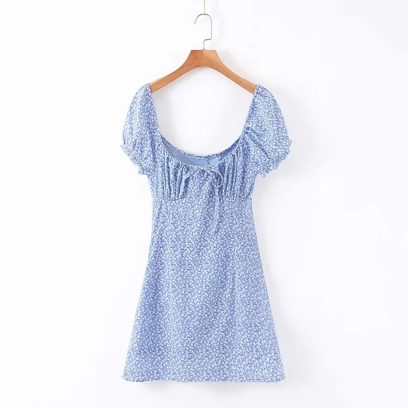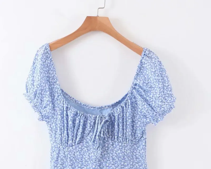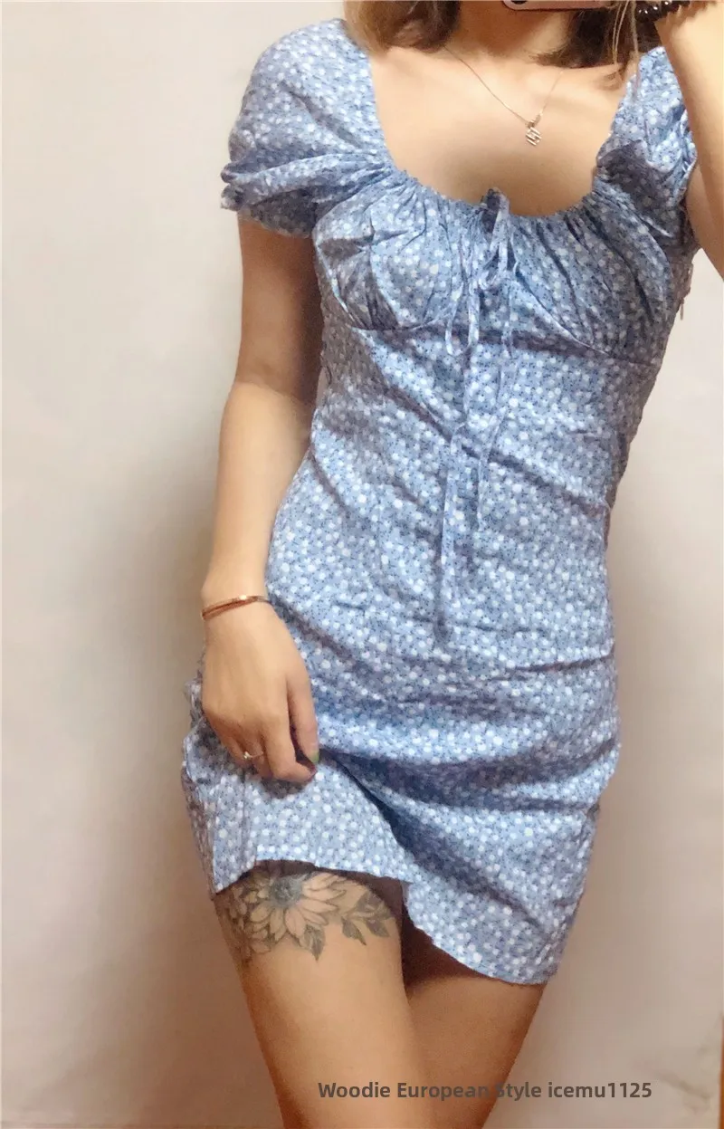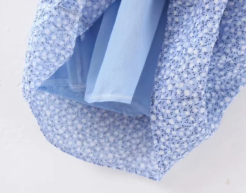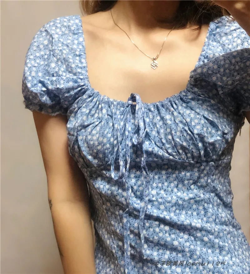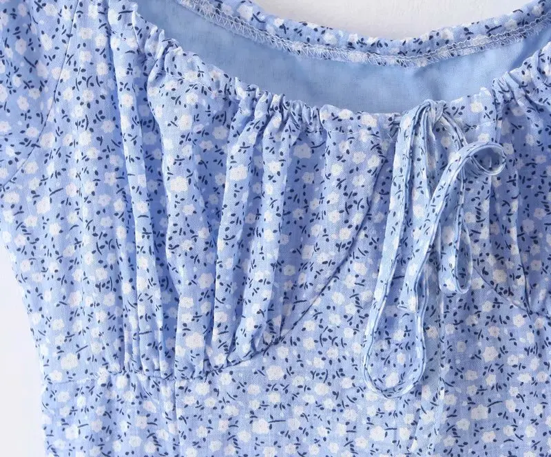 Cyflymder Retro Blue Floral Print Dr Sweet Front Bow Large Collar ort Sve Waist Cinched Street Sle Summer Dr for Women