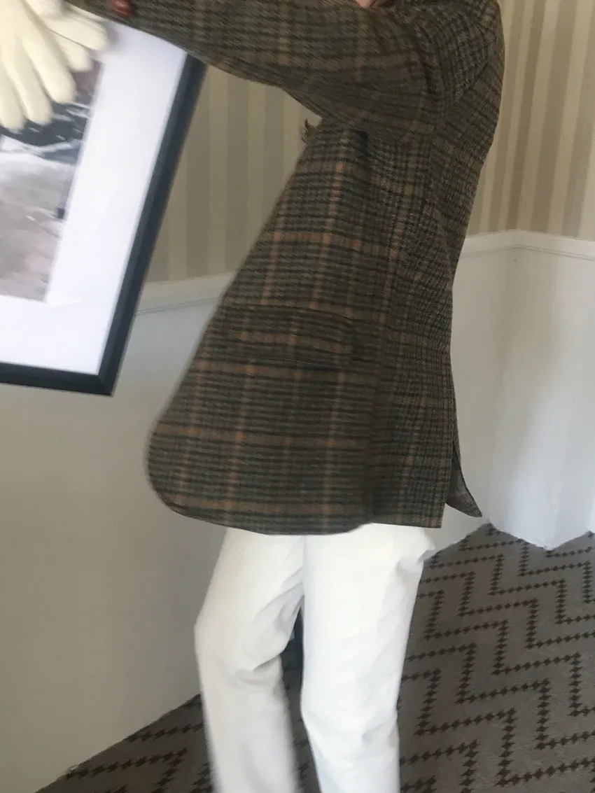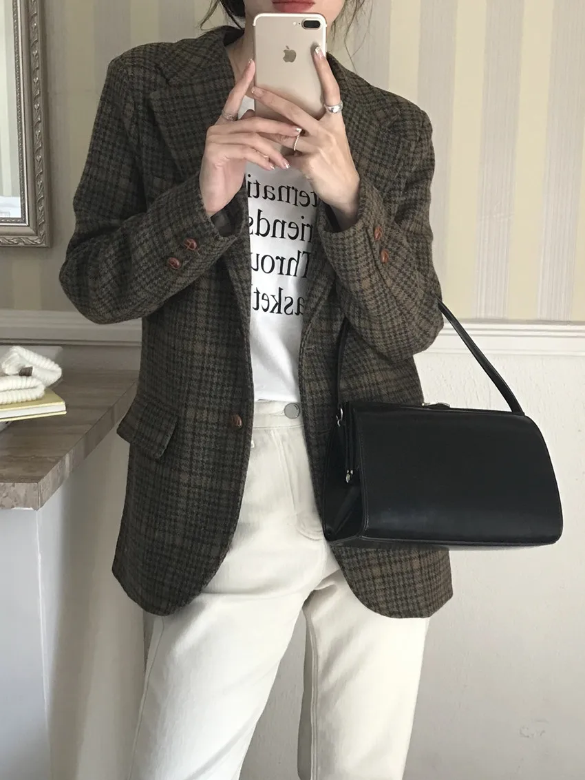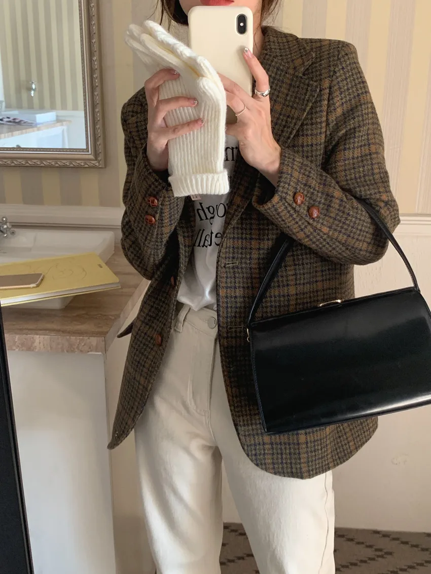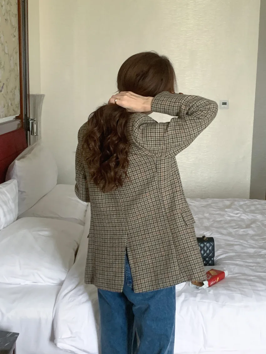 Cyflymder Retro Briti Sle Plaid Woolen Coat Women's Chic Lapel Single Button Suit Jaet Trendy Mid-Length Long Sve Busin Wear