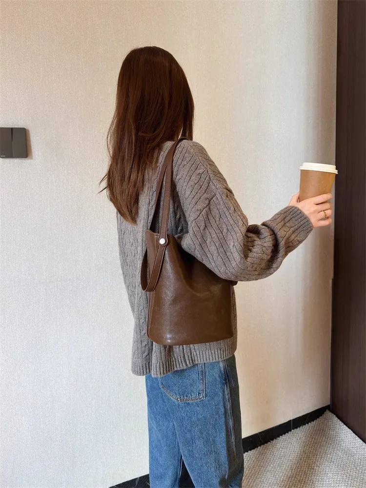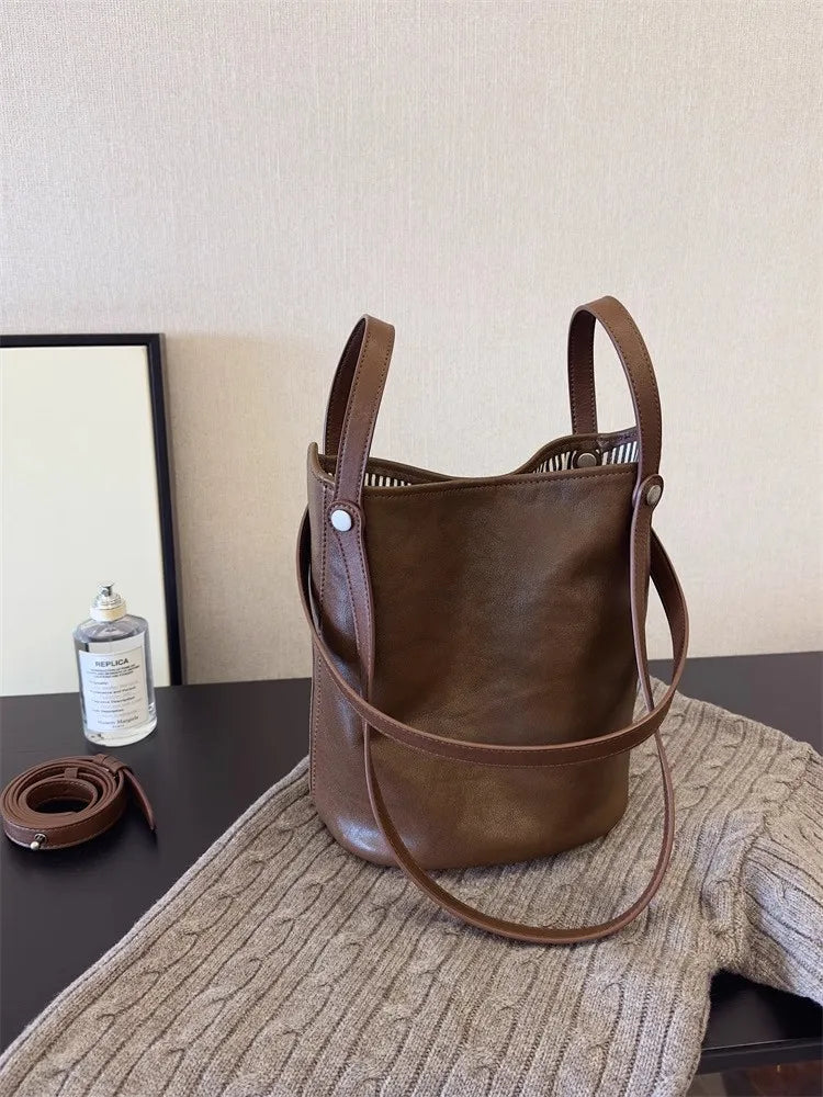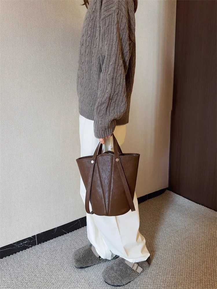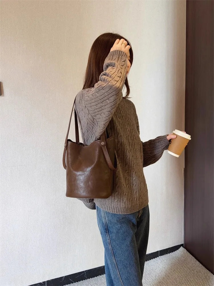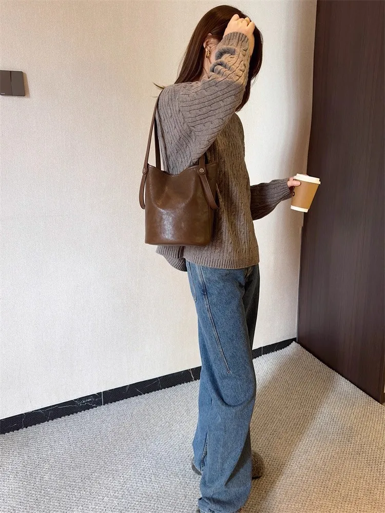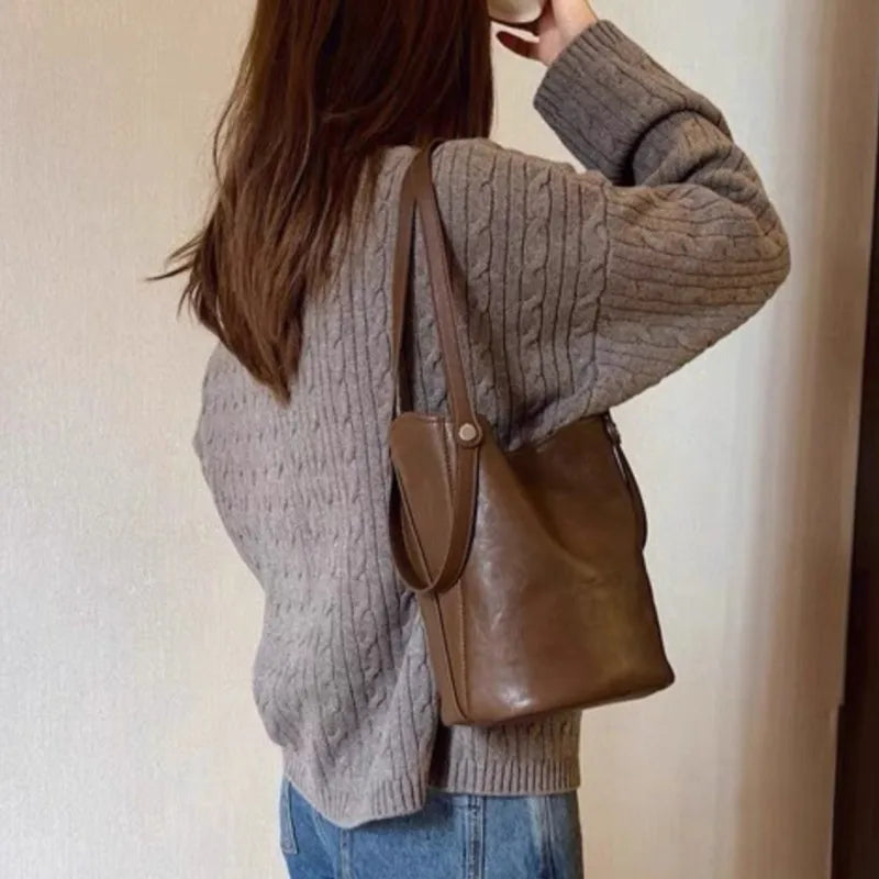 Cyflymder Retro Brown PU Leather Bucket Bags Women Autumn Winter New Large Capacity Underarm Bag Ladies Fashion Versatile Commuter Handbag