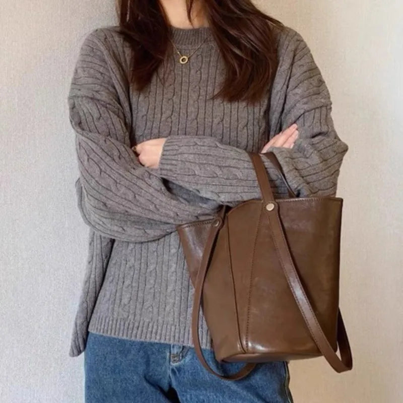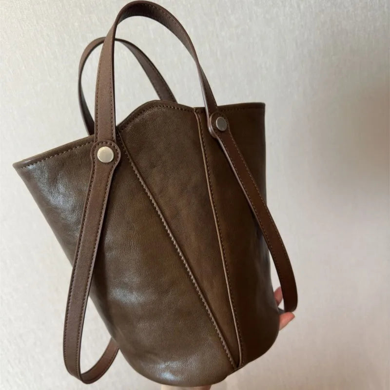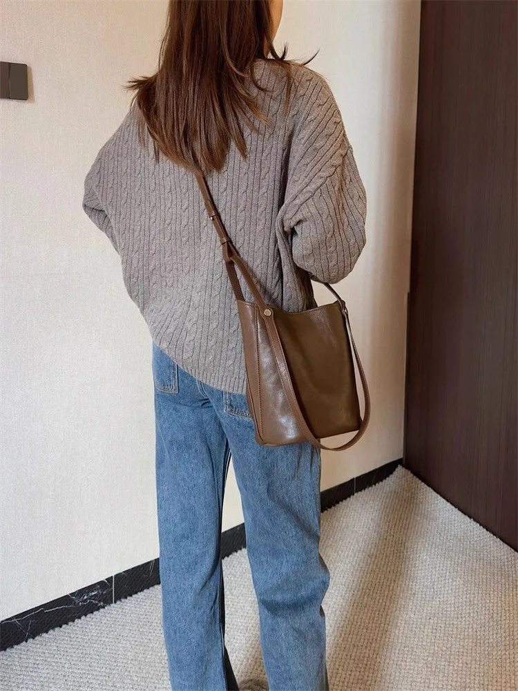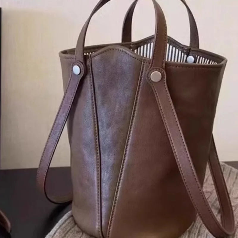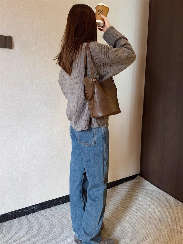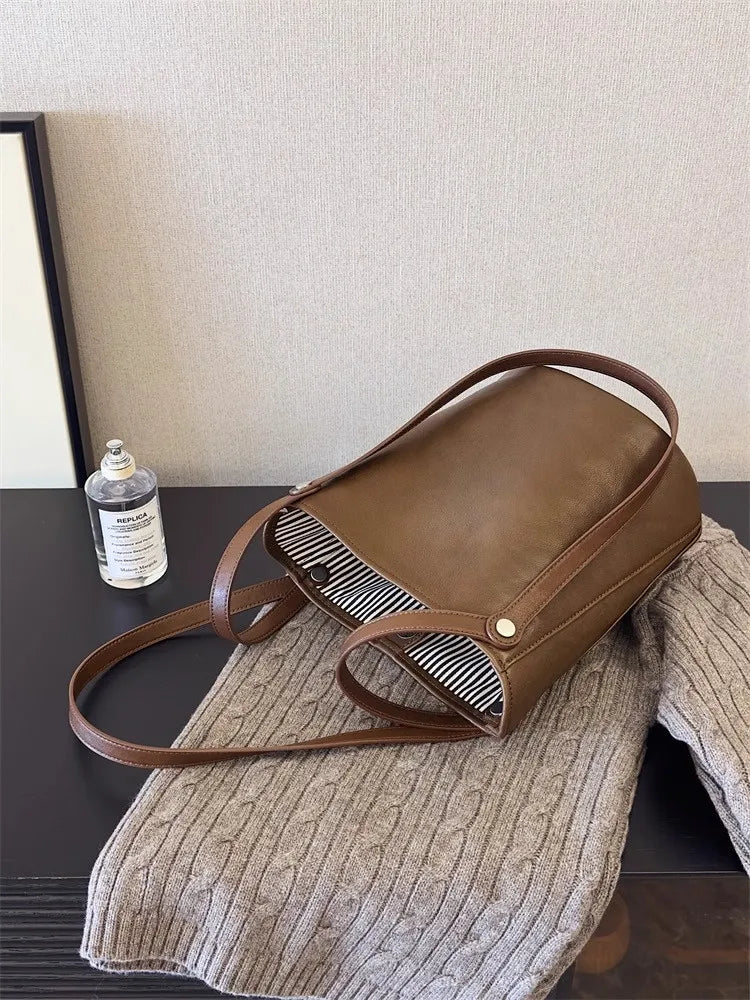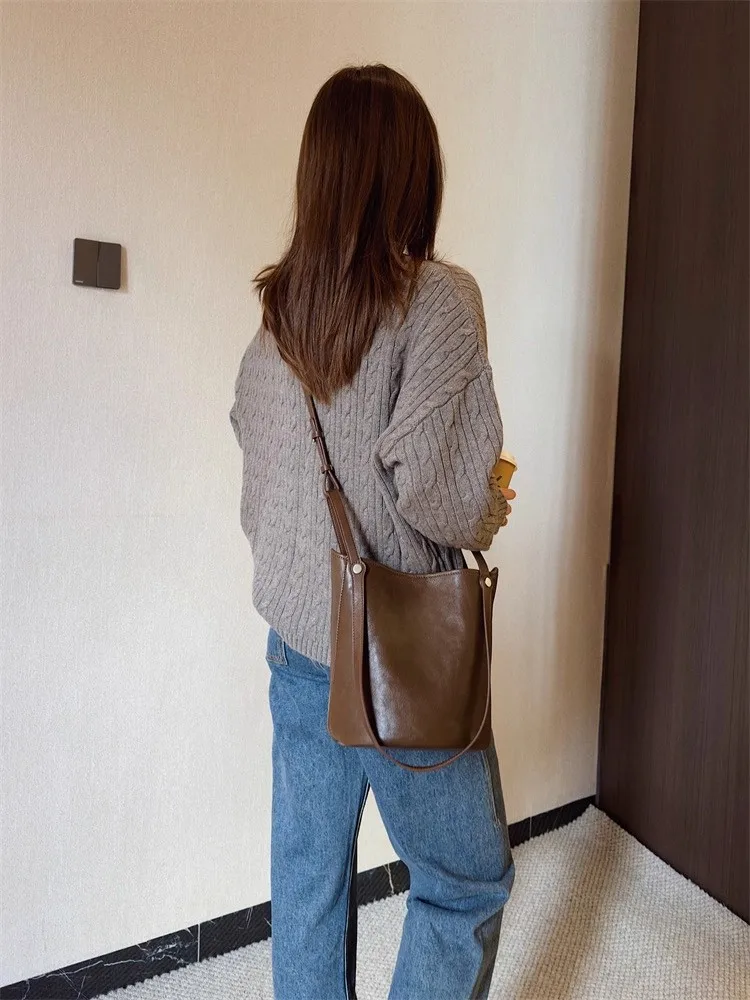 Cyflymder Retro Brown PU Leather Bucket Bags Women Autumn Winter New Large Capacity Underarm Bag Ladies Fashion Versatile Commuter Handbag