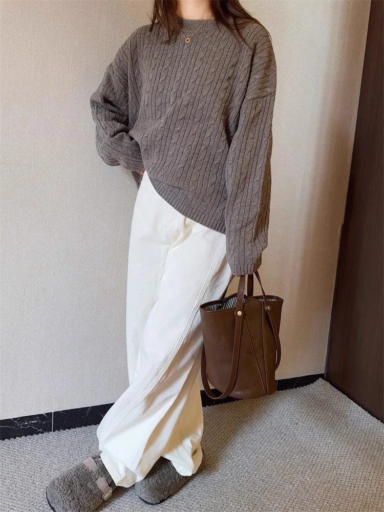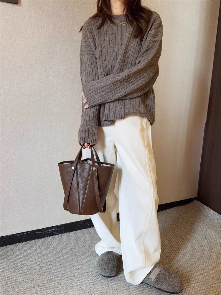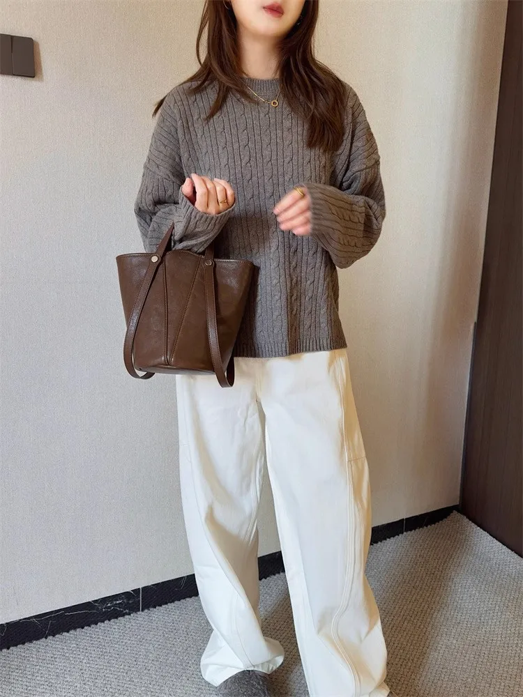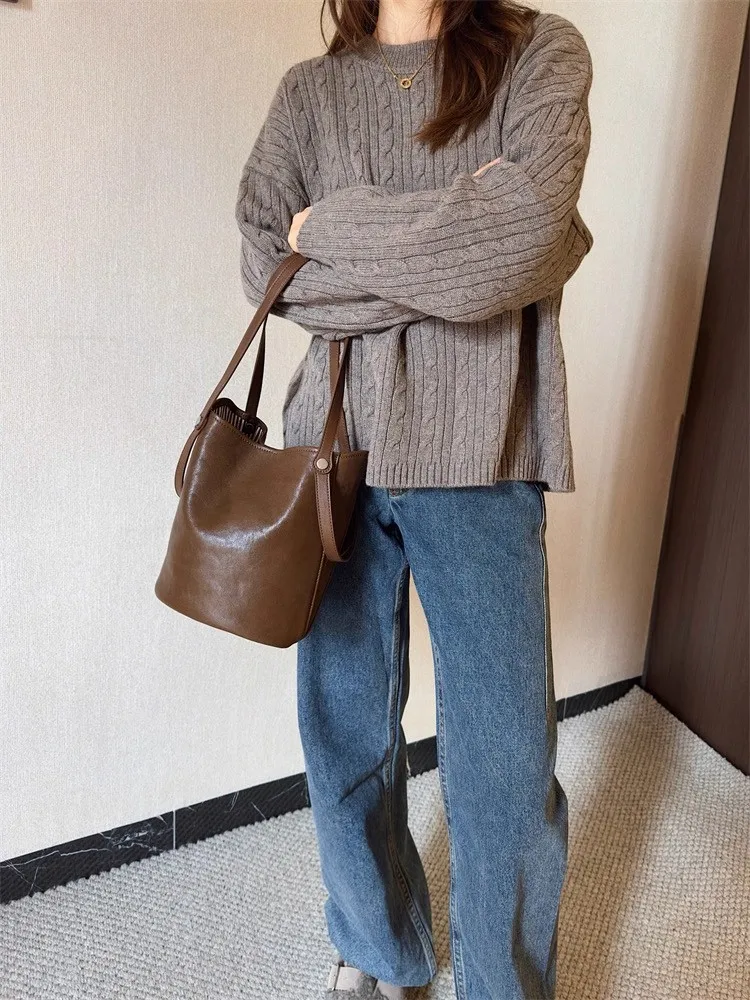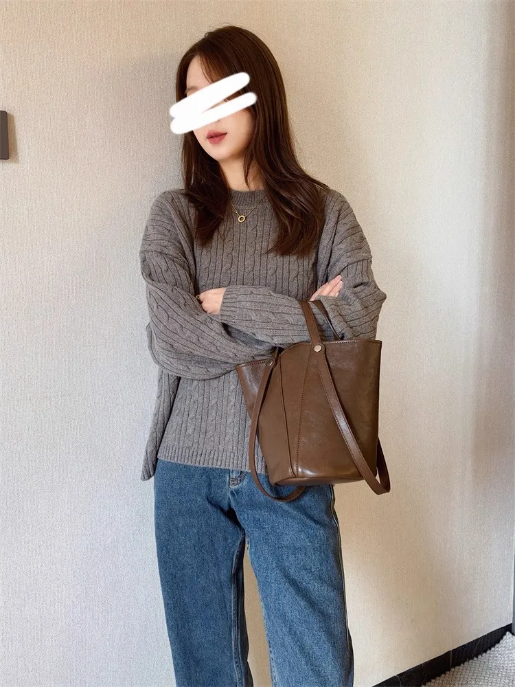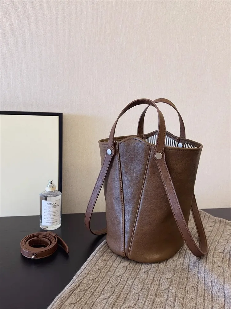 Cyflymder Retro Brown PU Leather Bucket Bags Women Autumn Winter New Large Capacity Underarm Bag Ladies Fashion Versatile Commuter Handbag