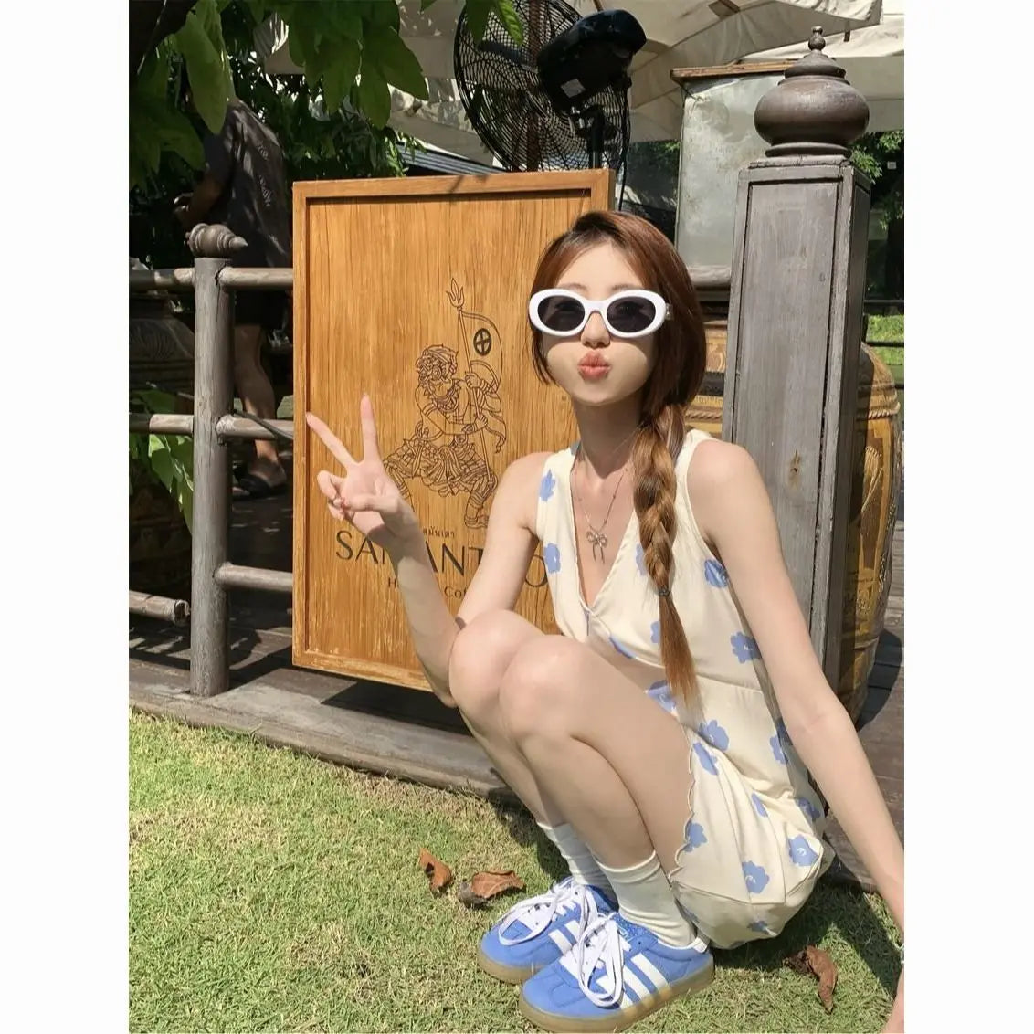 Cyflymder Retro Flower V-neck Sleeveless Vest Dress for Women Summer New Sweet Waist-hugging A-line Skirt