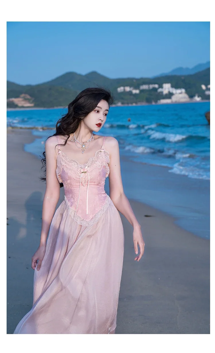 Cyflymder Retro French Style Pink Dress For Slim Lady Summer Jacquard Lace Spaghttti Strap Sexy Long Dresses Party Night Robe Rose Vestido