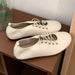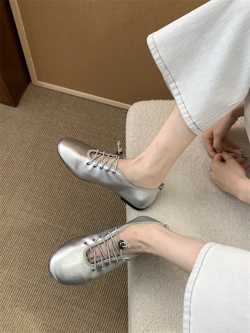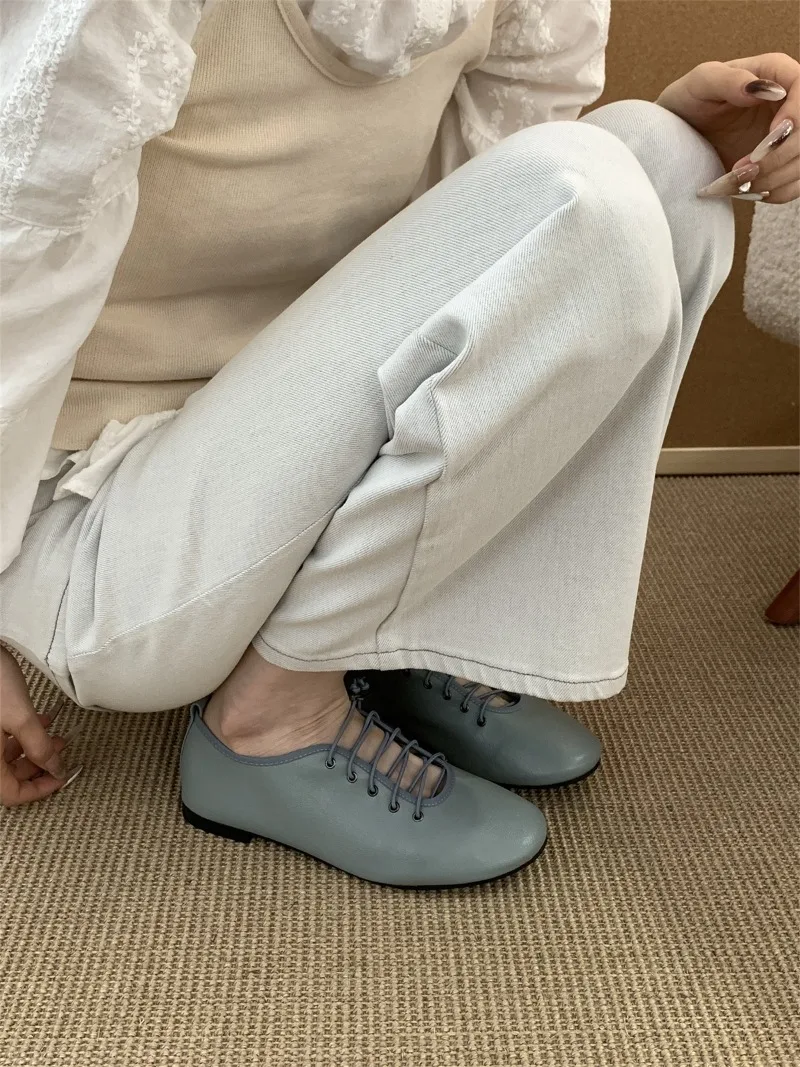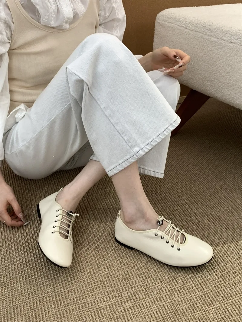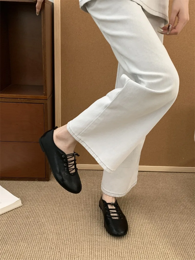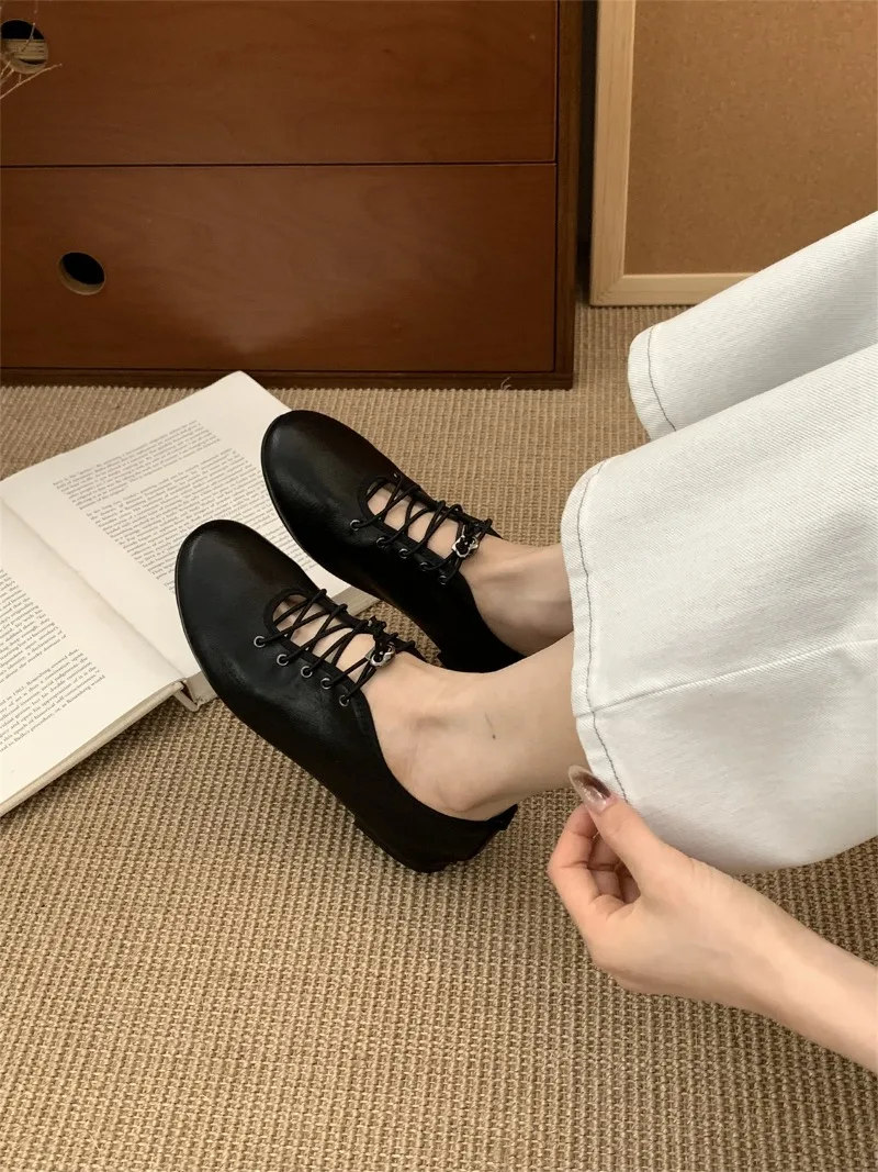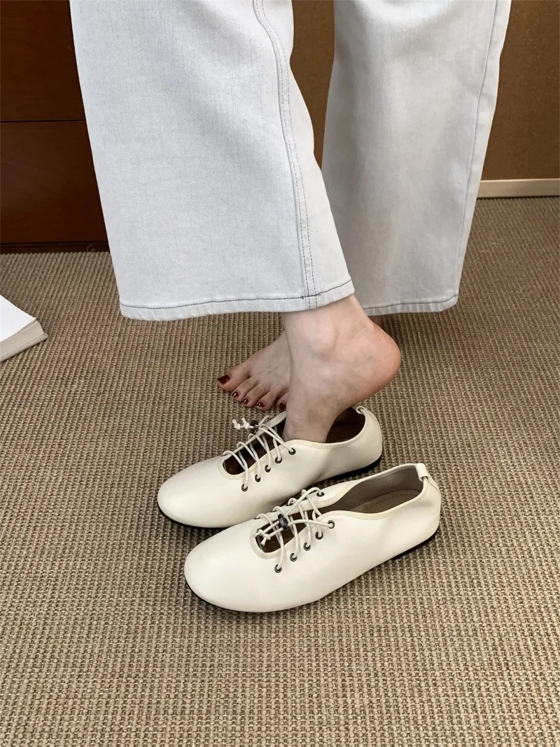Cyflymder Retro Lace Soft Leather Women Flats Cozy Round Toe Ballet Style Outdoor Walking Casual Shoes Ladies Fashion Brand Designer Pumps