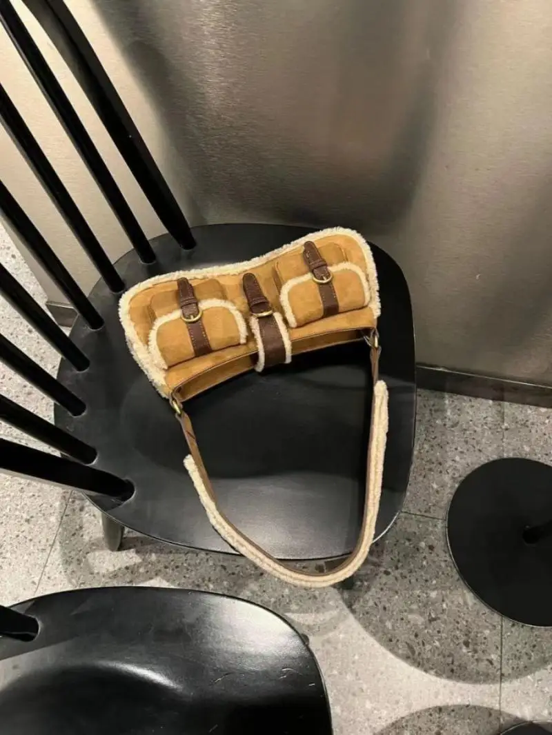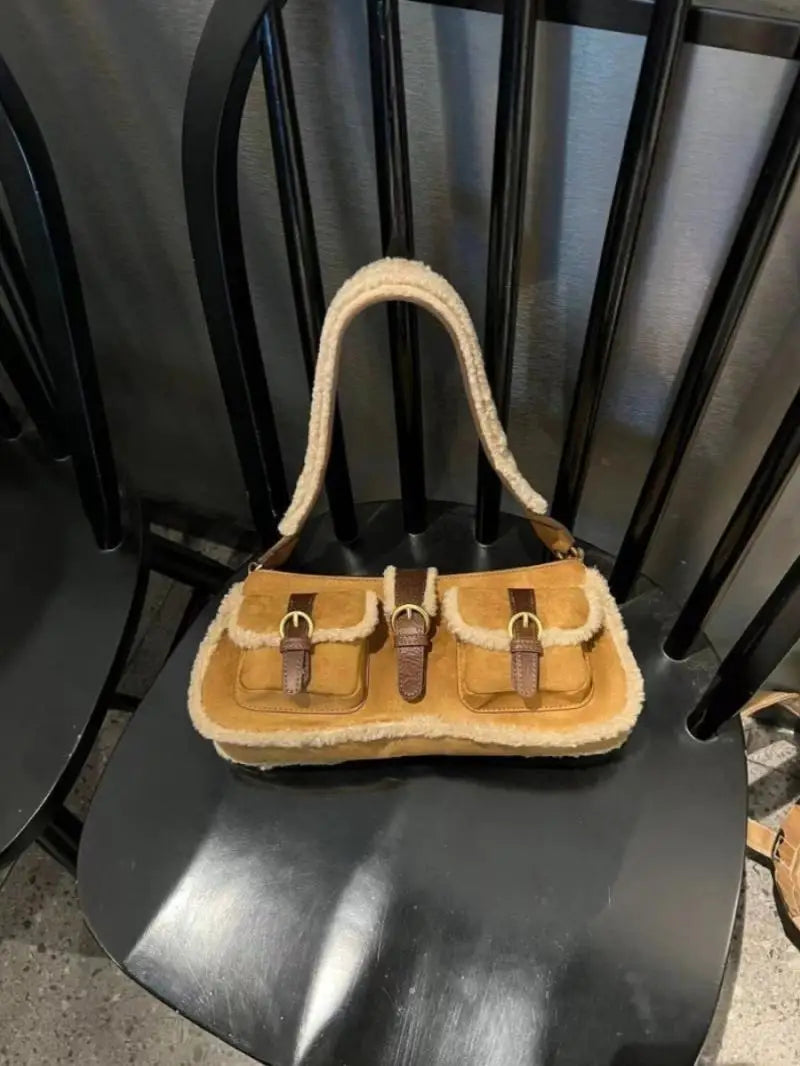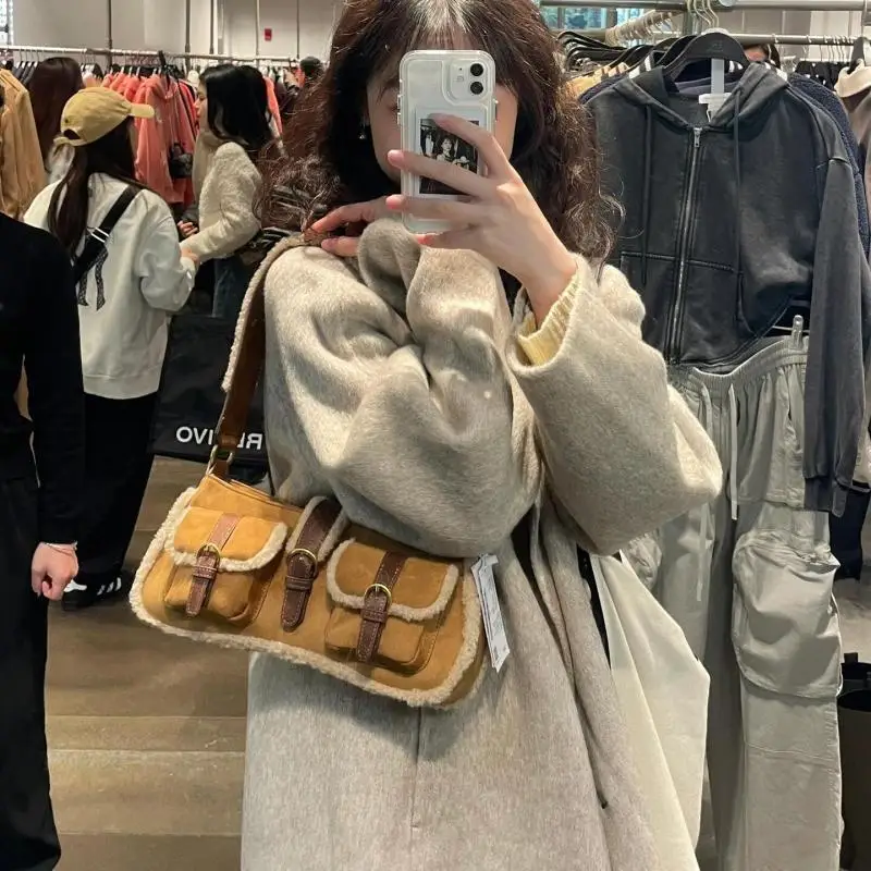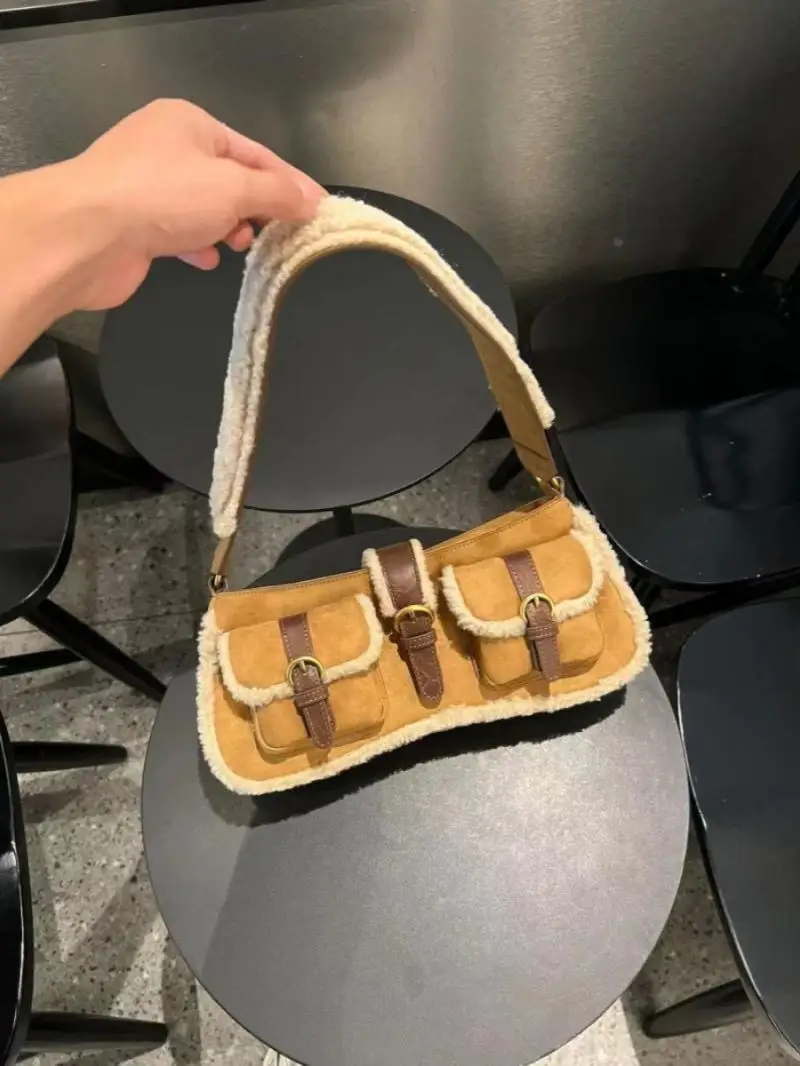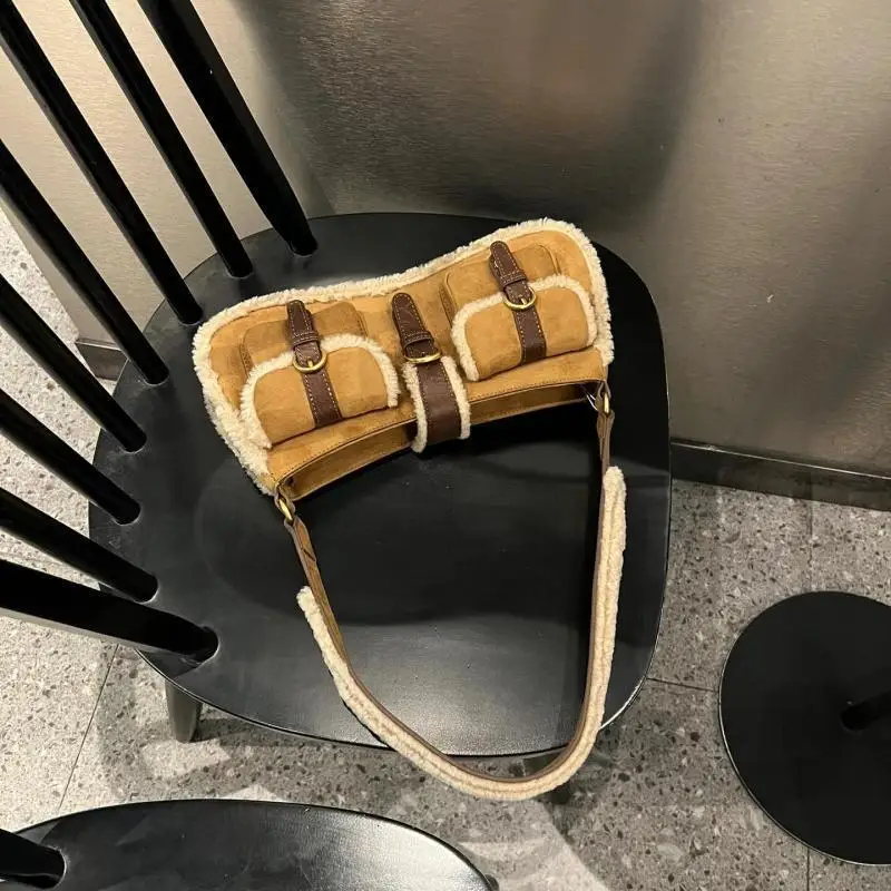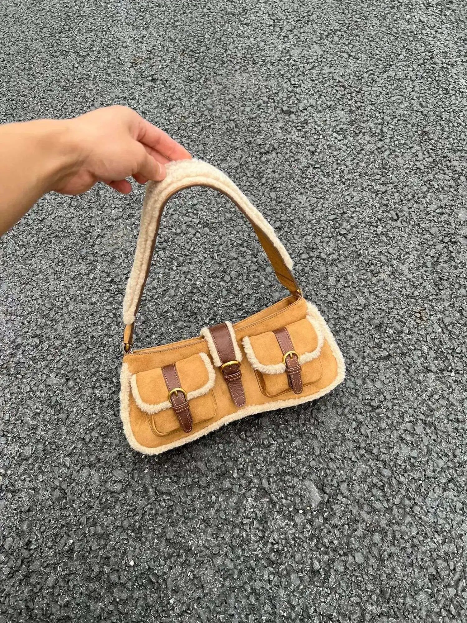 Cyflymder Retro Lamb Patchwork Brown Shoulder Bag Women Vintage Pocket Chic Y2k Handbag Female Hot Girls Casual Underarm Bag 2025