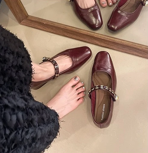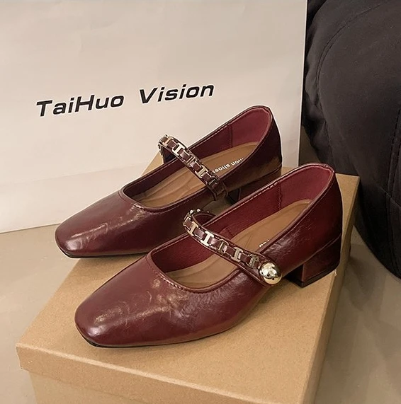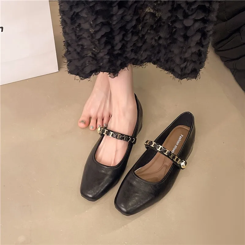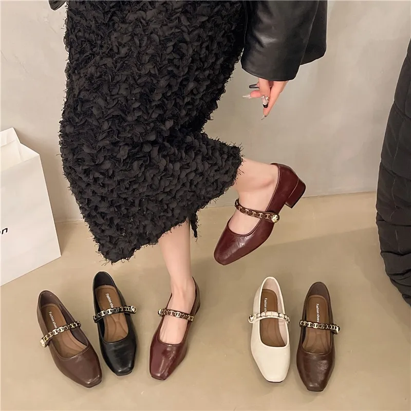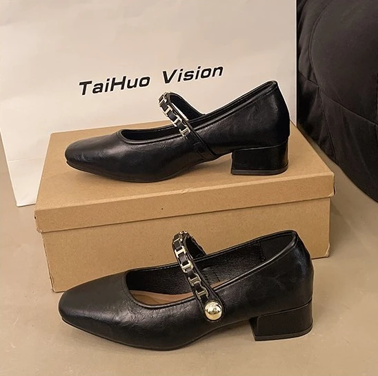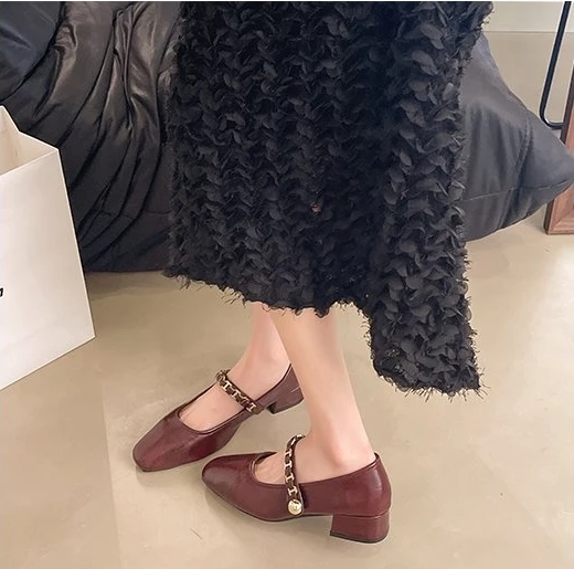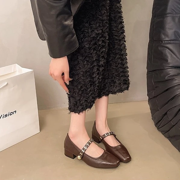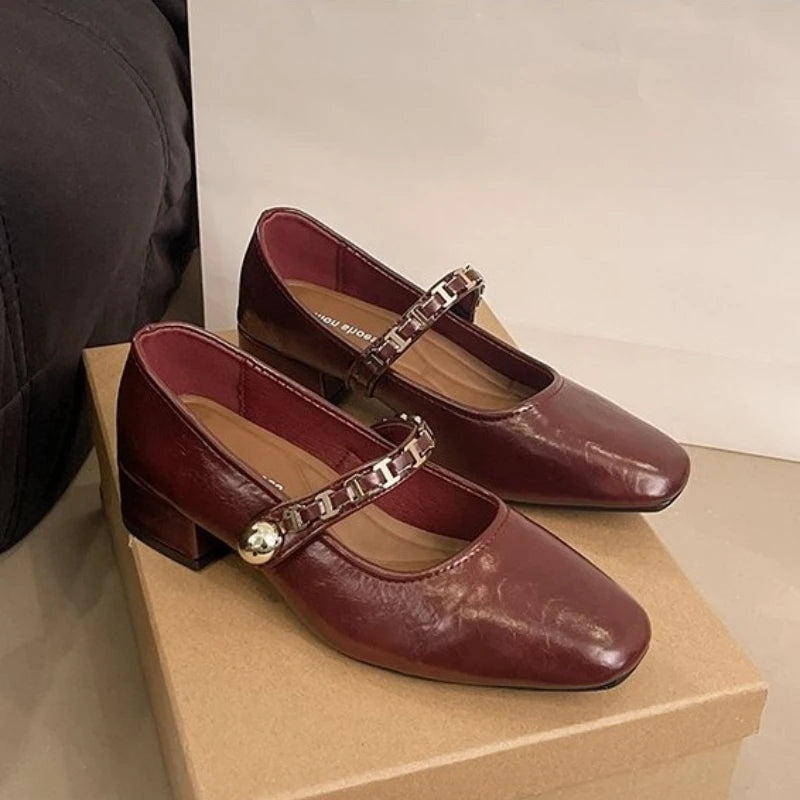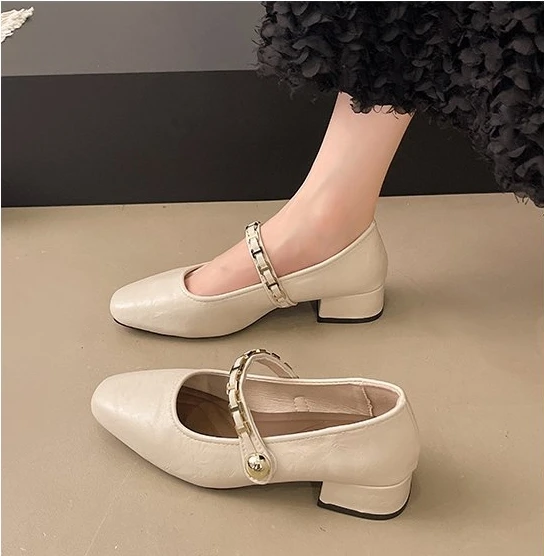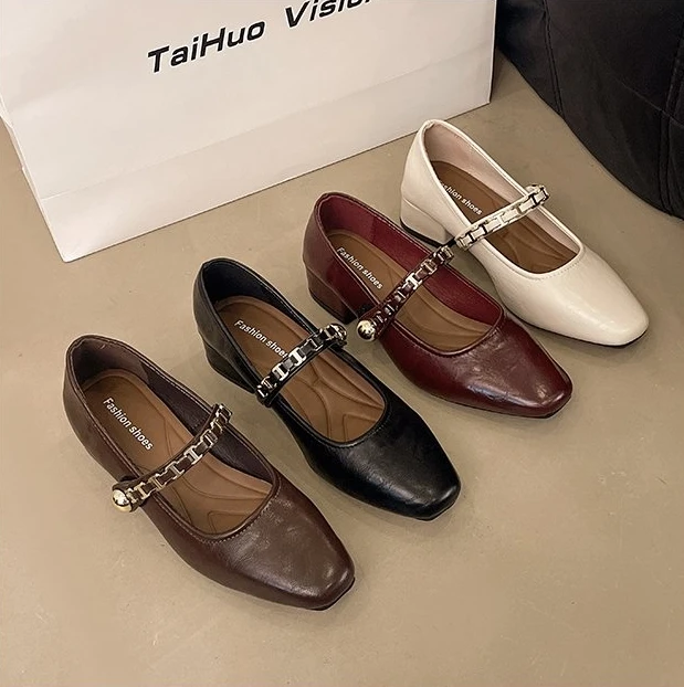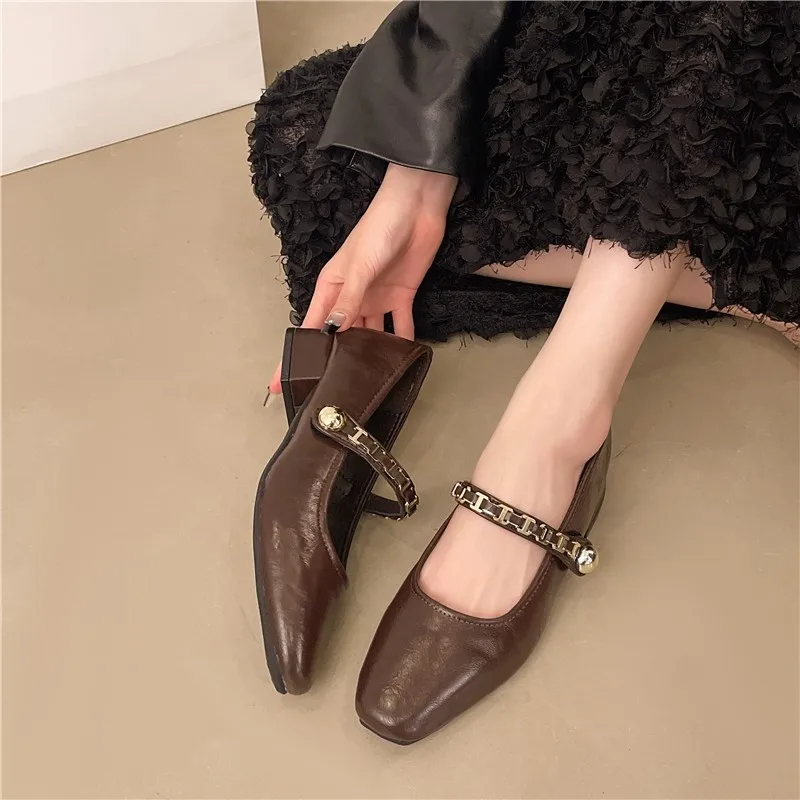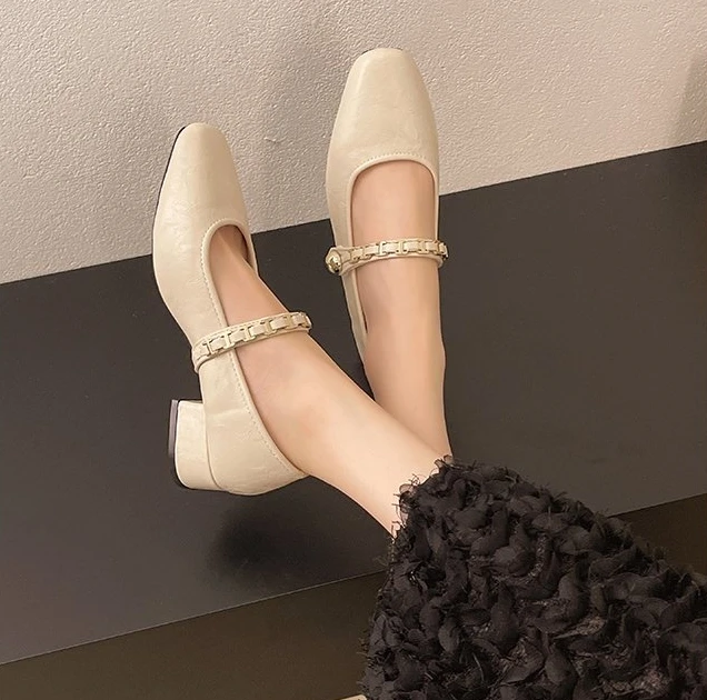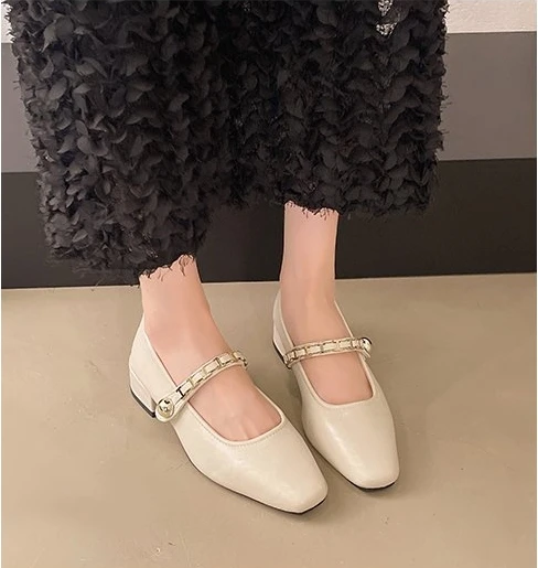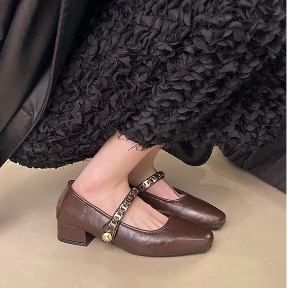 Cyflymder Retro low-heeled single shoes for women, new summer fashion gold buckle square toe comfortable high-heeled leather shoes