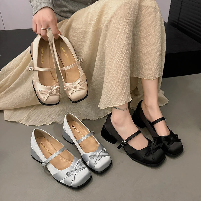 Cyflymder Retro Women Shoes Beige High Heels 2025 Square Toe Chunky Sandals Footwear Mary Jane 12cm Latest Block Bow African 3cm Lolita