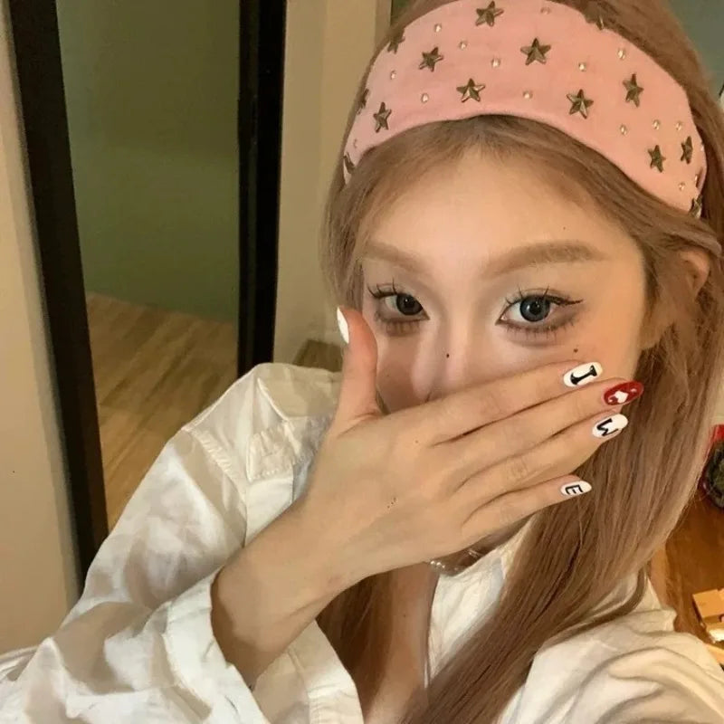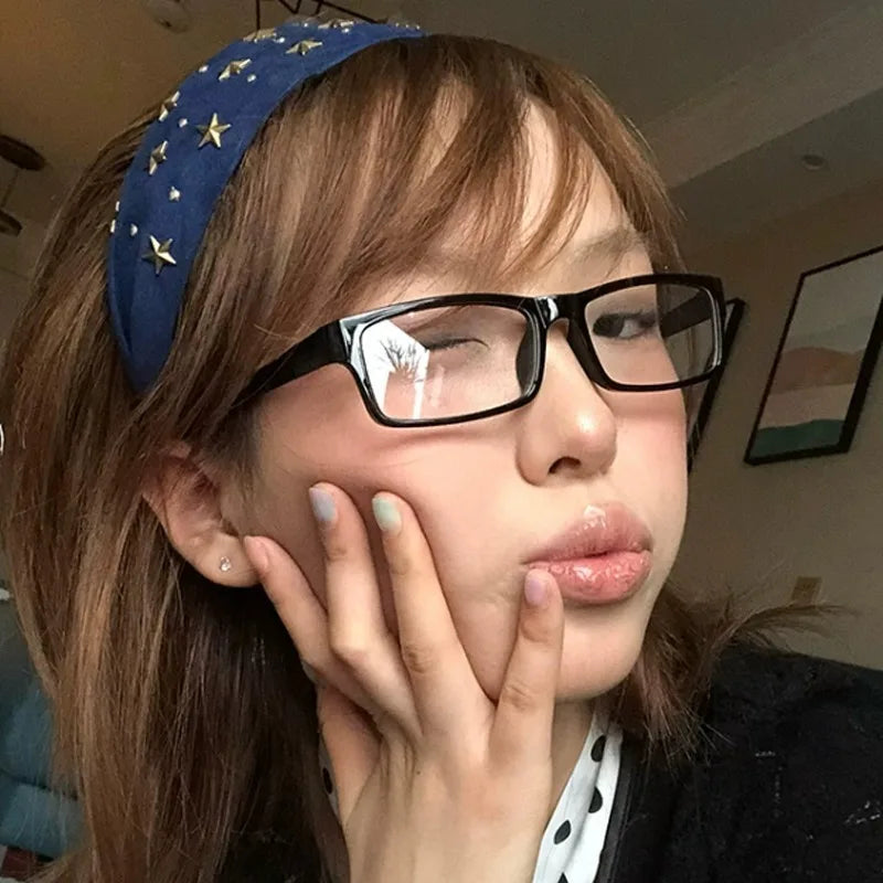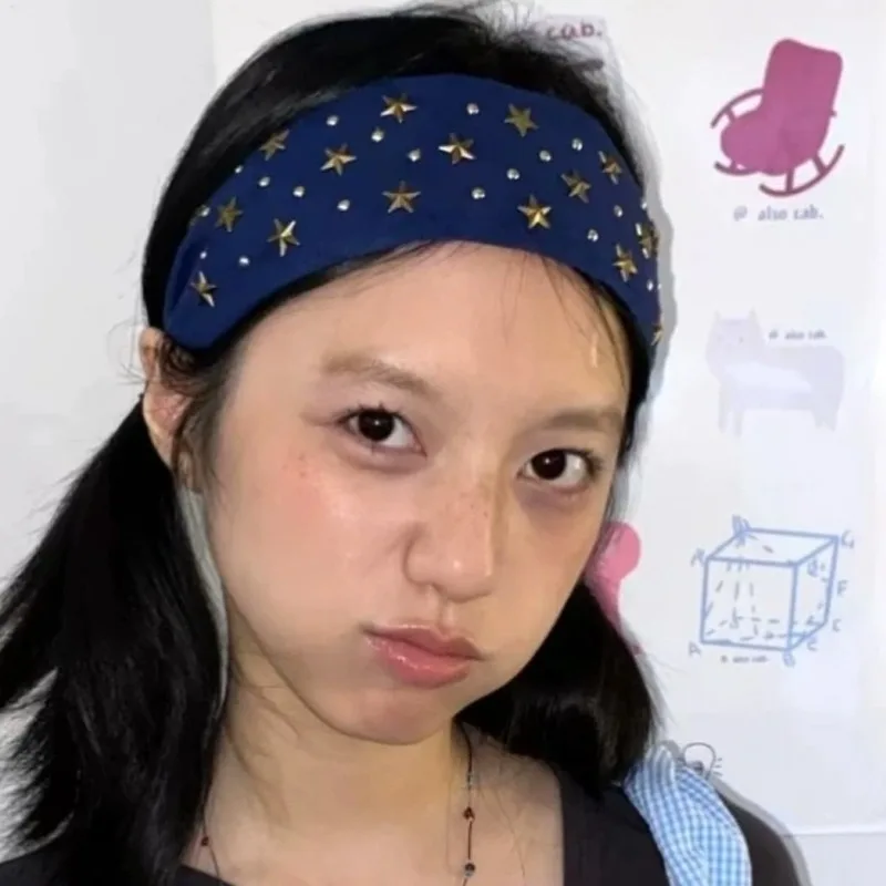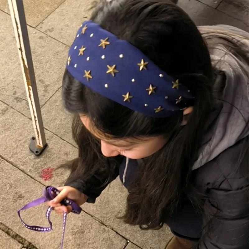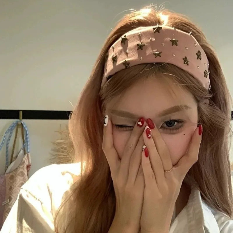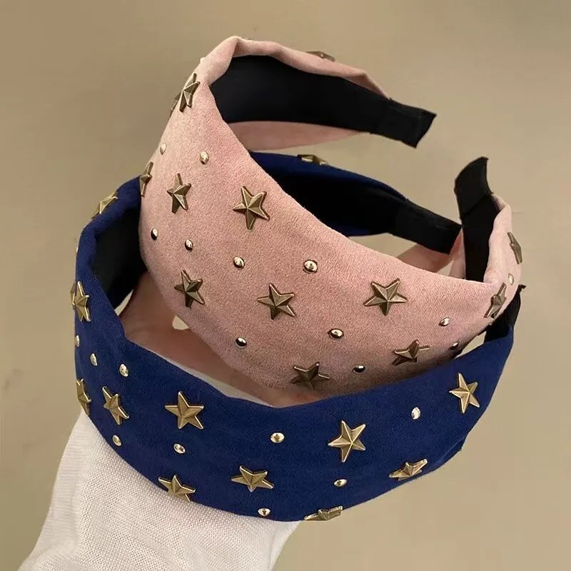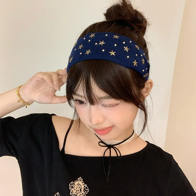 Product Details: Product Name: Retro Hottie Personalized Star Rivet Wide Brim Headband Material: Cloth + Alloy Style: Star Rivet Size: The edge width is about 6cm Color: Dark Blue, Pink Style: Y2K Retro Hottie Style, Ins Korean Style![]()