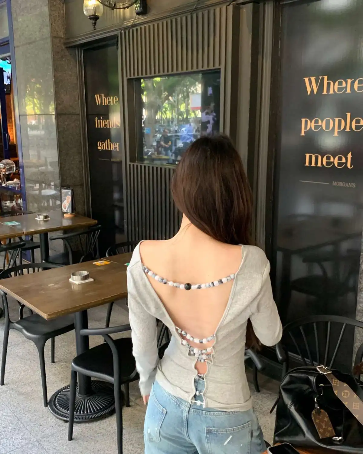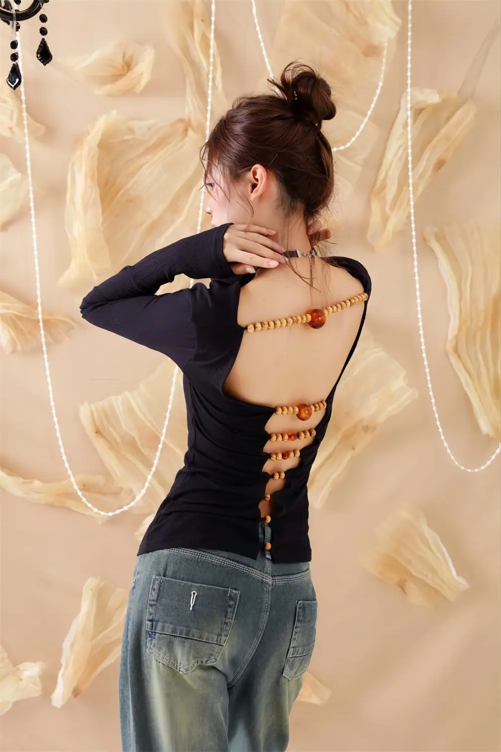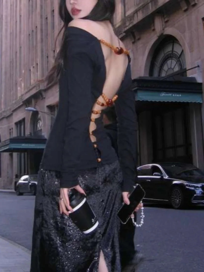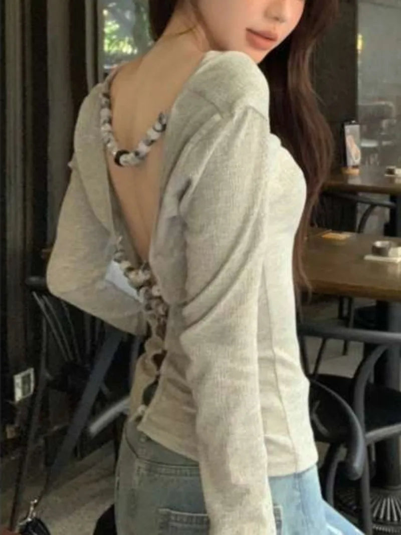 Cyflymder Reversible Long Sleeve T Shirt Women Beaded Cut Out Backless Top Y2k Autumn Clothing Sexy Hollow Out Aesthetic Streetwear Female