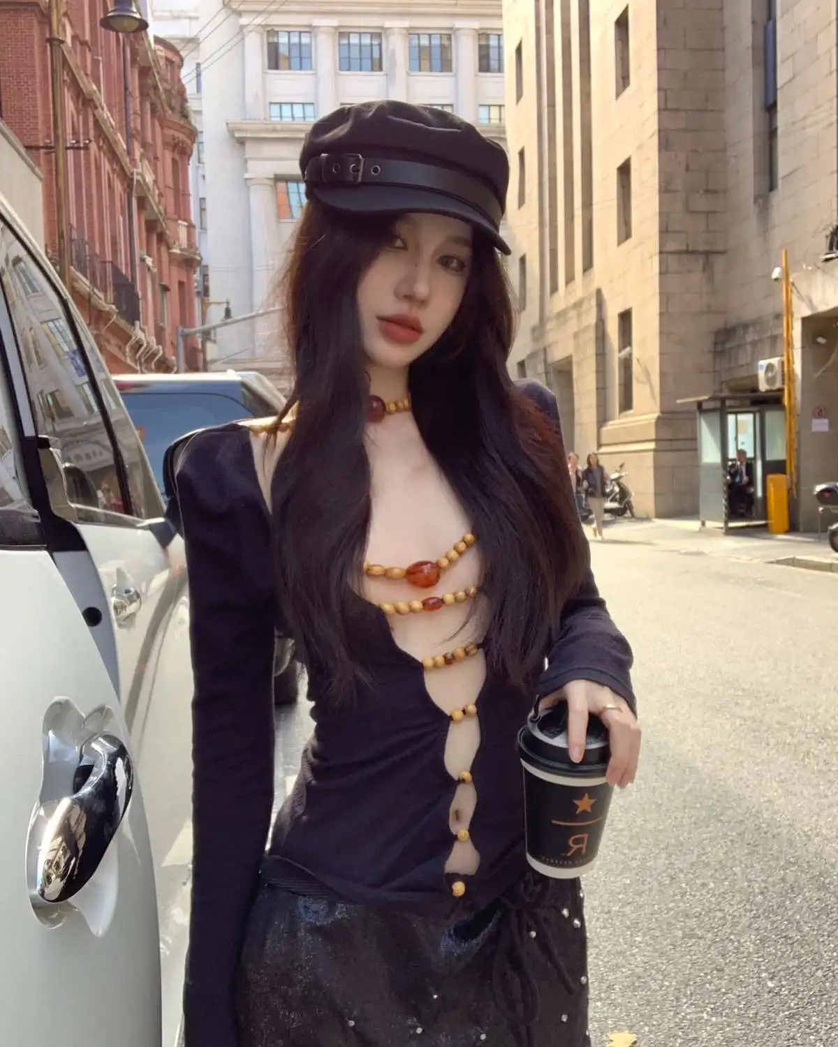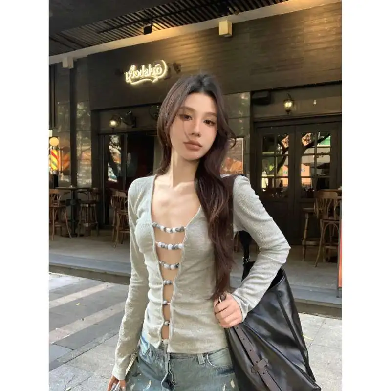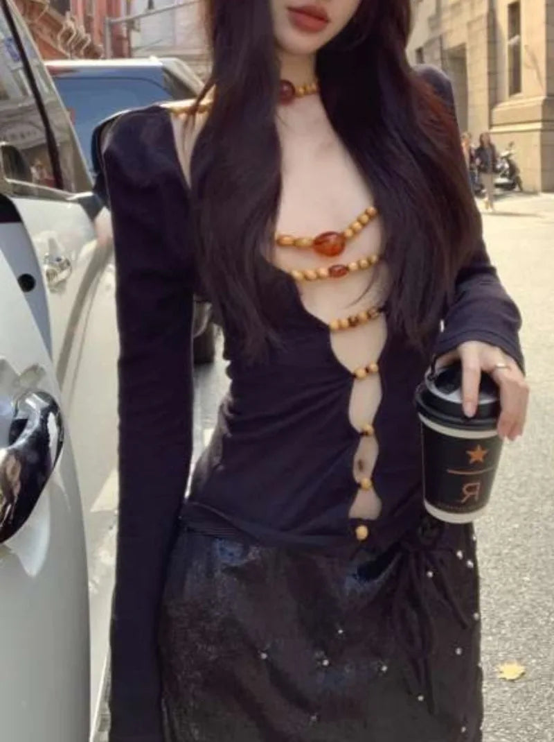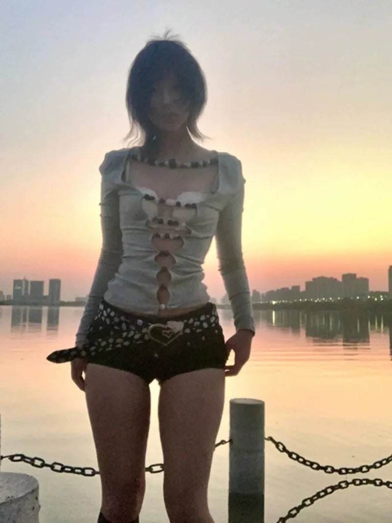 Cyflymder Reversible Long Sleeve T Shirt Women Beaded Cut Out Backless Top Y2k Autumn Clothing Sexy Hollow Out Aesthetic Streetwear Female
