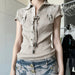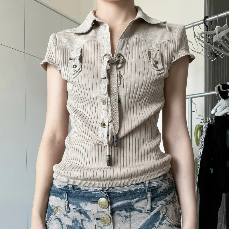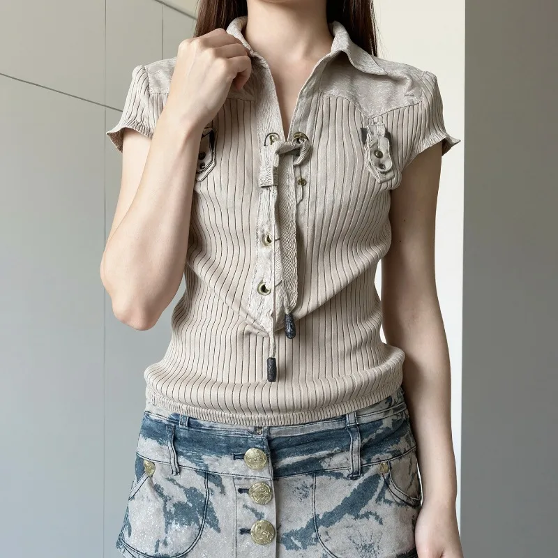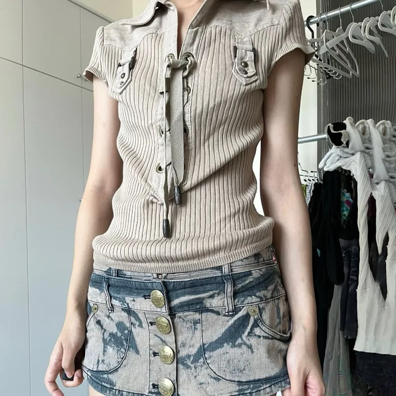 Cyflymder Safari Style Vintage Turn Down Collar Short Sleev Women Shirts Y2k Cross Lace Up Design Harajuku Knitted Clothes Street Punk Top