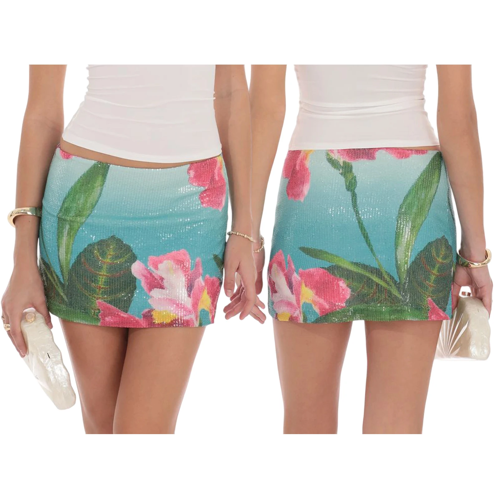 Cyflymder Sequined Mini Skirt y2k Women Summer Stylish Flower Print Low Rise Bodycon Short Skirts Evening Party Skirt Streetwear