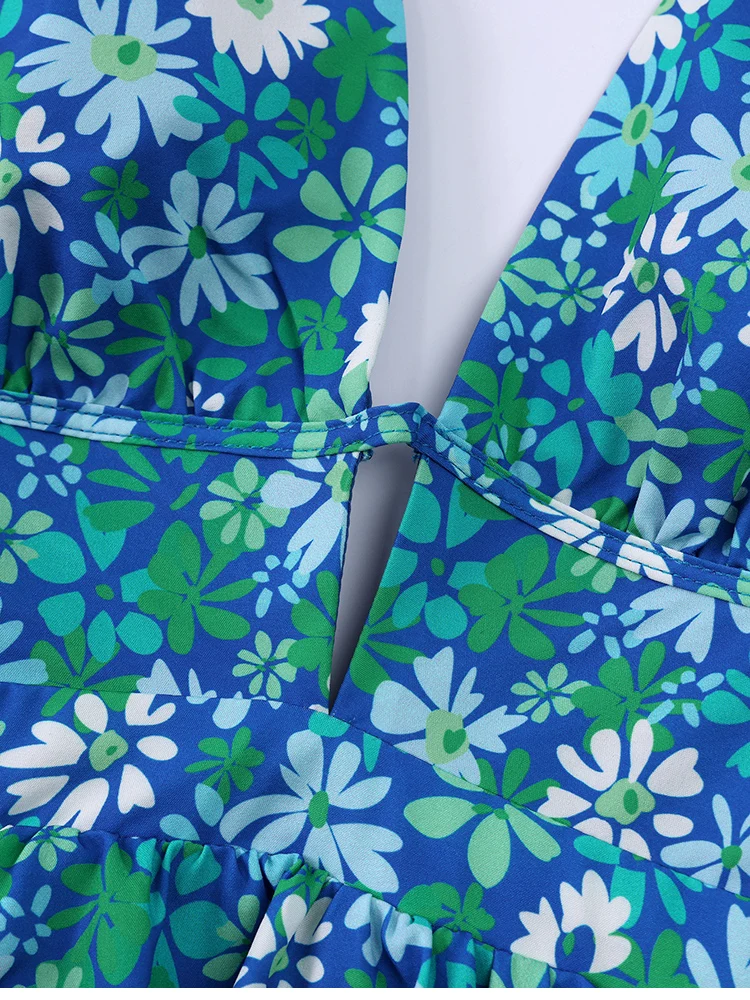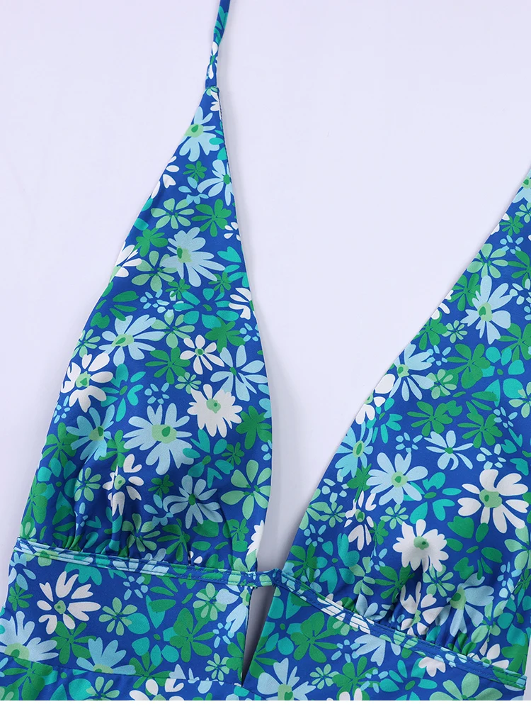 Cyflymder Sexy Bohemian Floral Print Halter Neck Dress Deep V-Neck Backless with Ribbon Summer Mini Dress for Women Beach Holiday