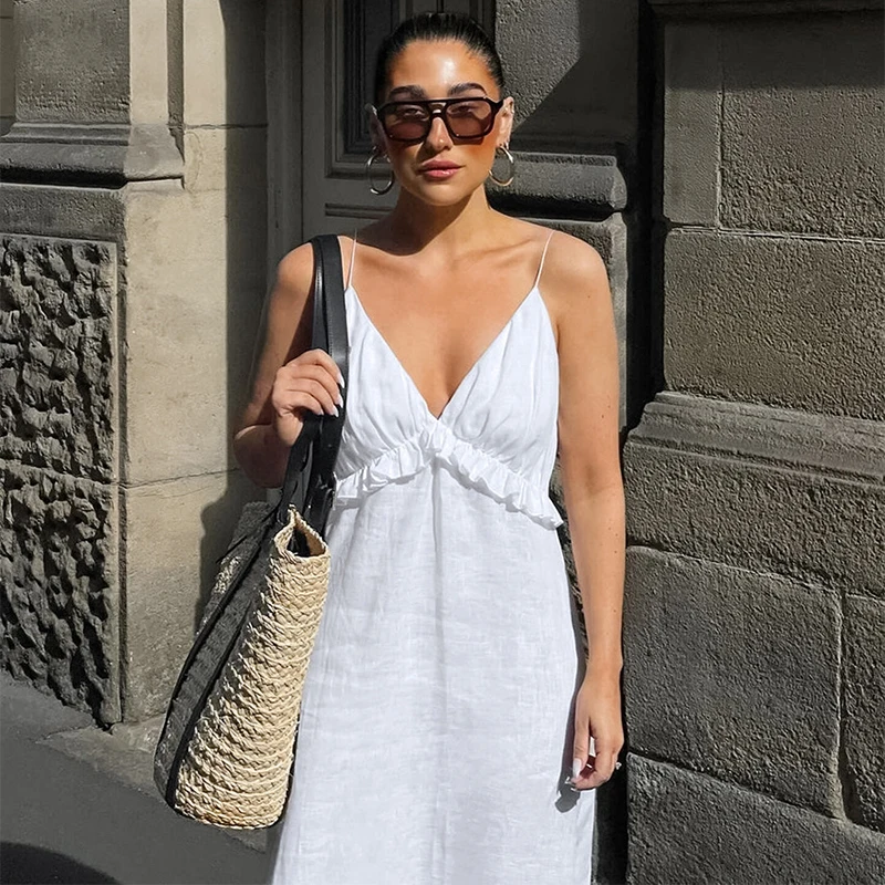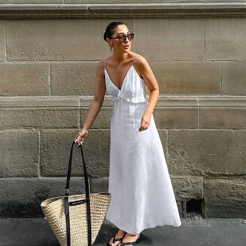 Cyflymder Sexy Deep V-Neck White Suspender Dress Women Fashion Ruffle Folds Long Robe Spring Summer New Beach Holiday Casual Loose Dress