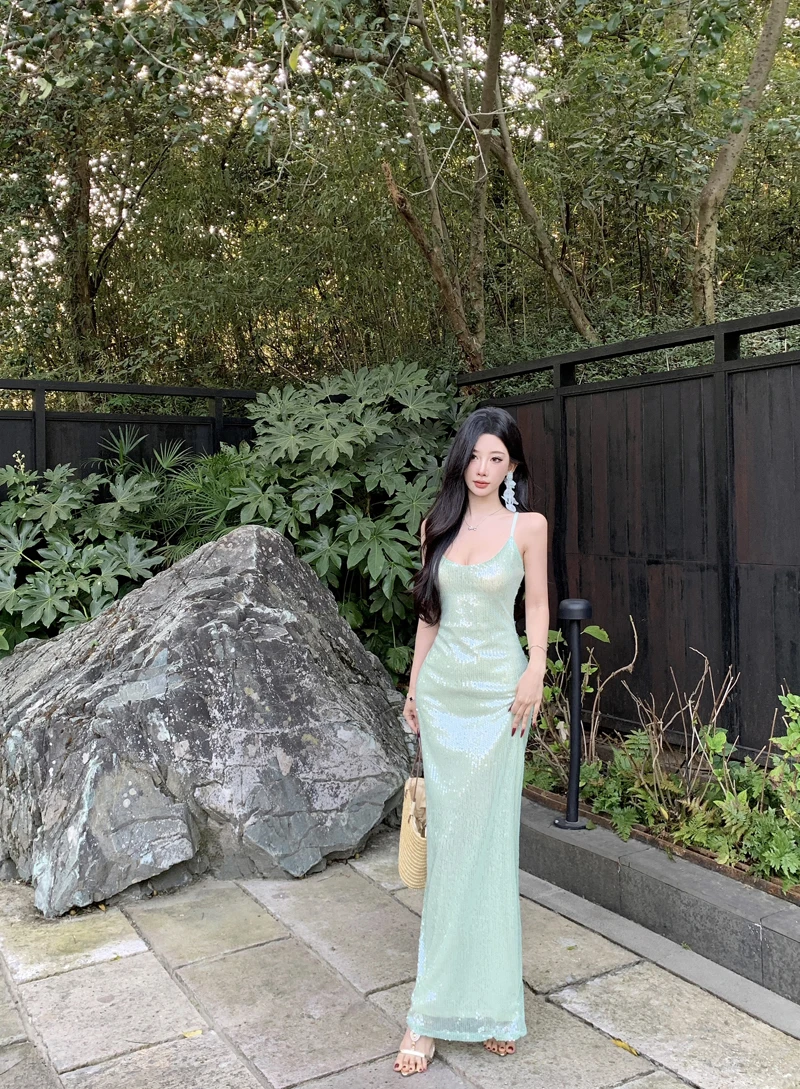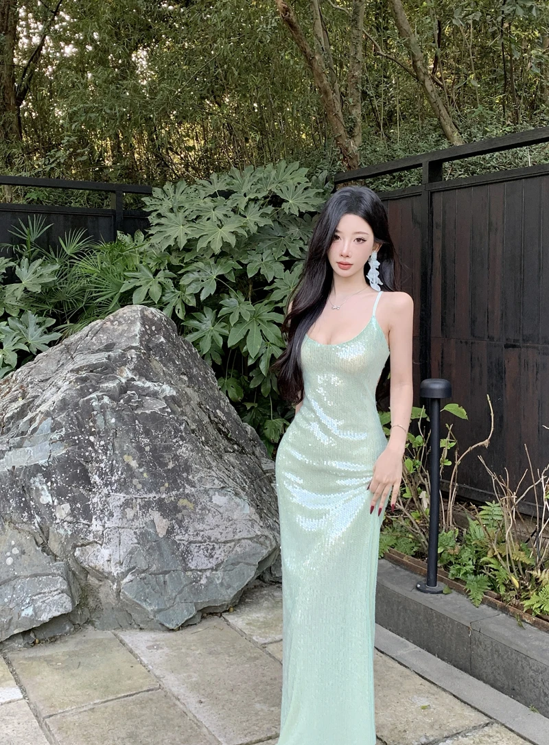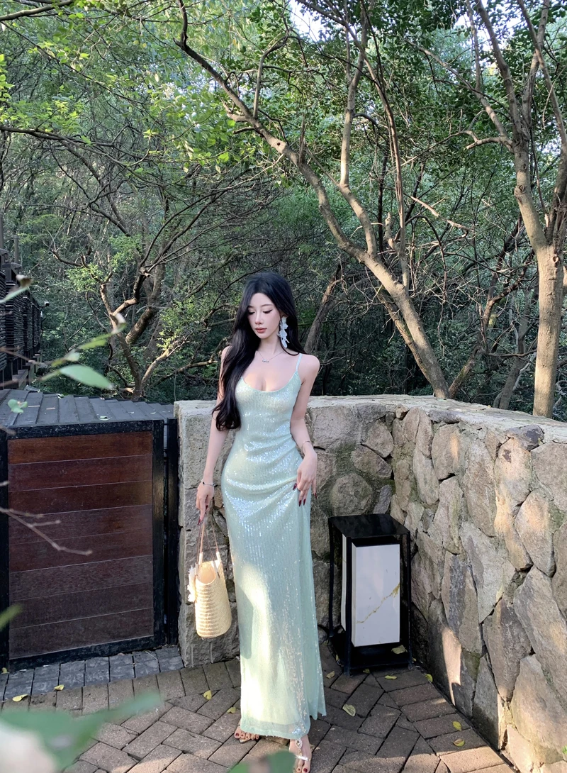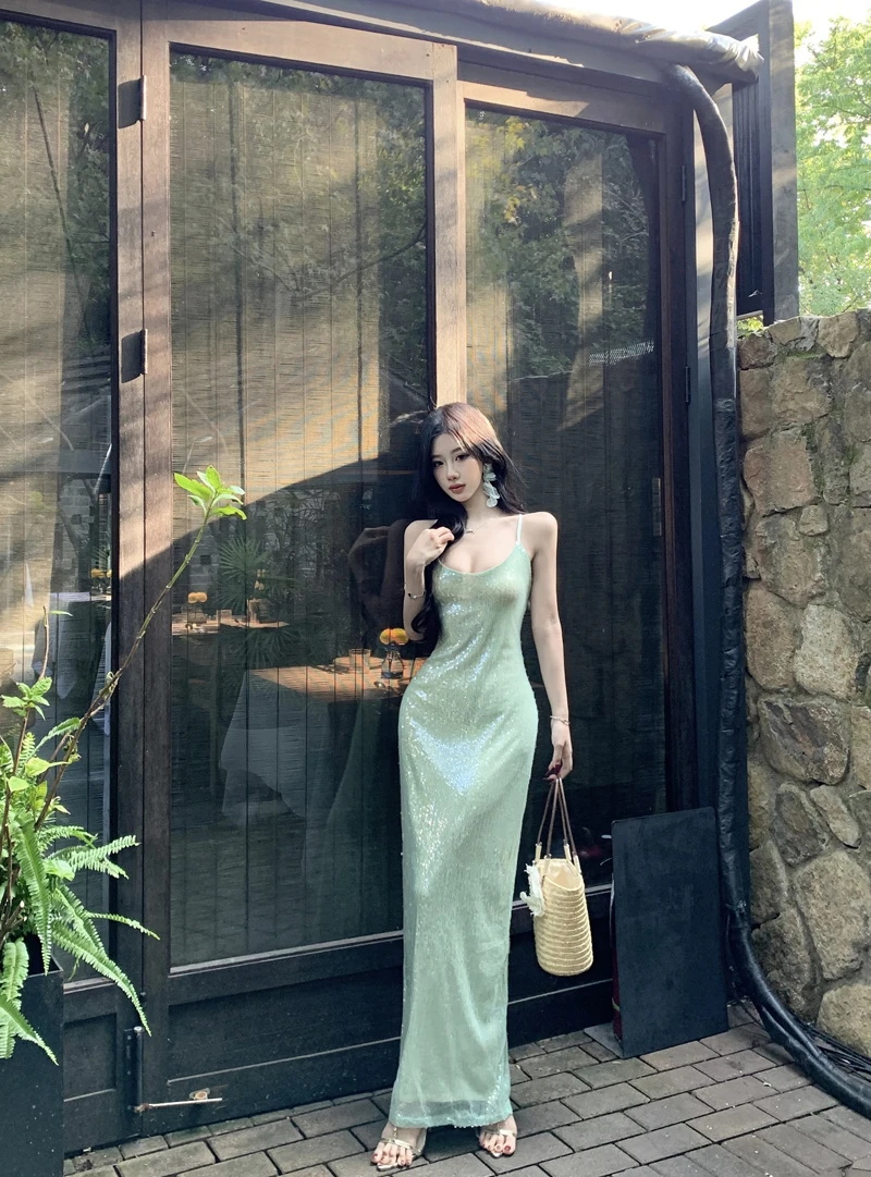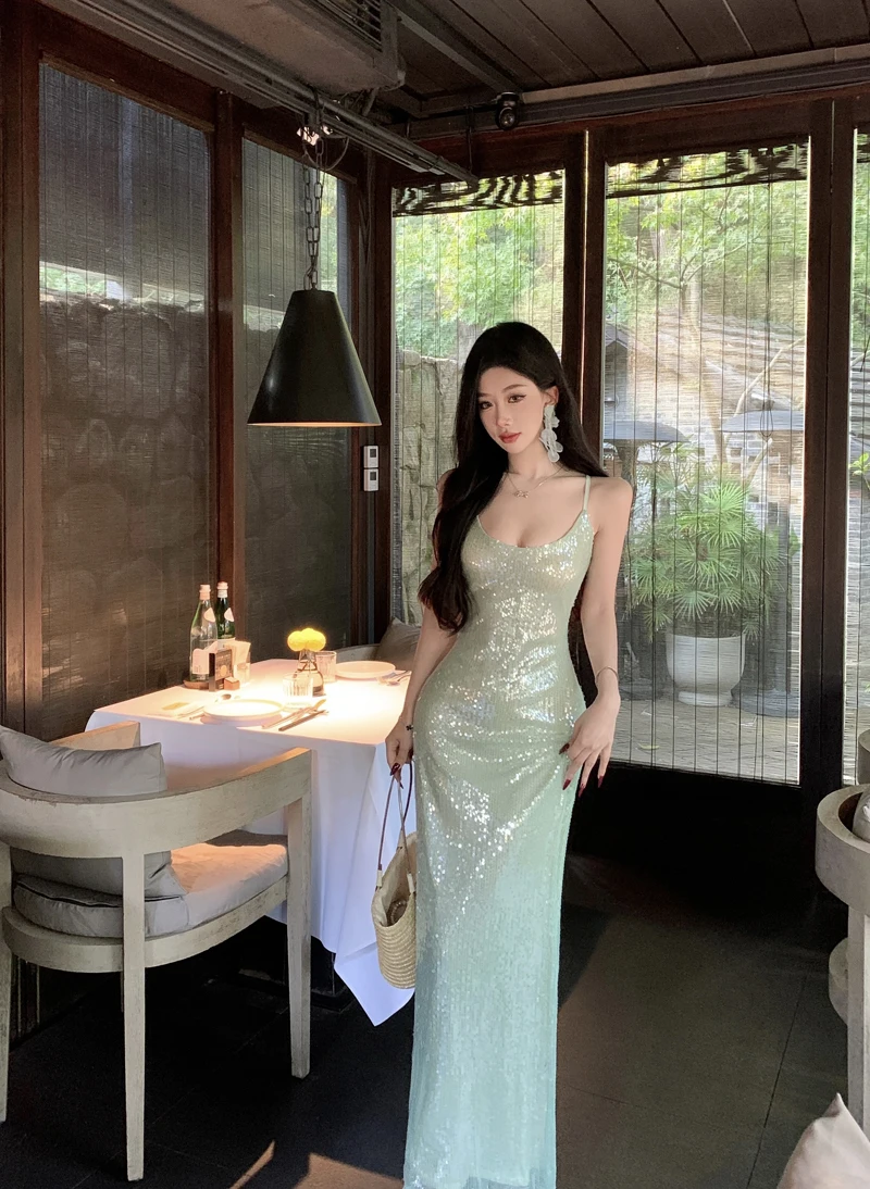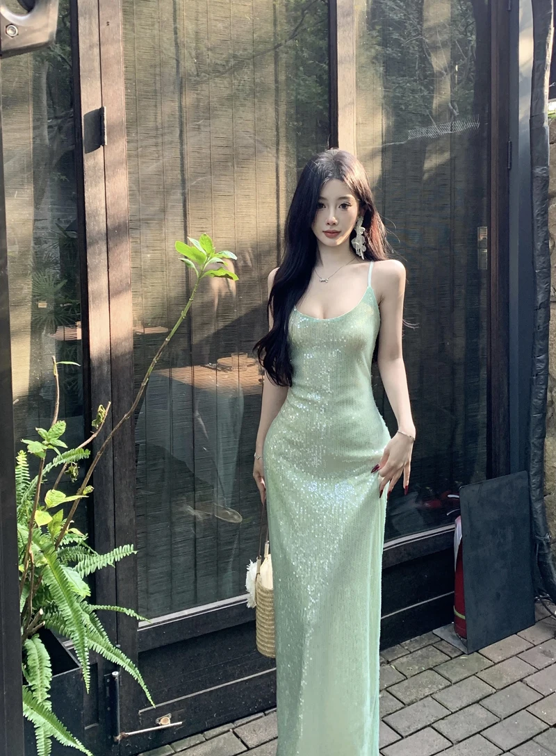 Cyflymder Sexy Green Spaghetti Strap Evening Dresses Elegant Backless Sleeveless Slim Party Prom Casual Vestidos Long Robe Female Clothing