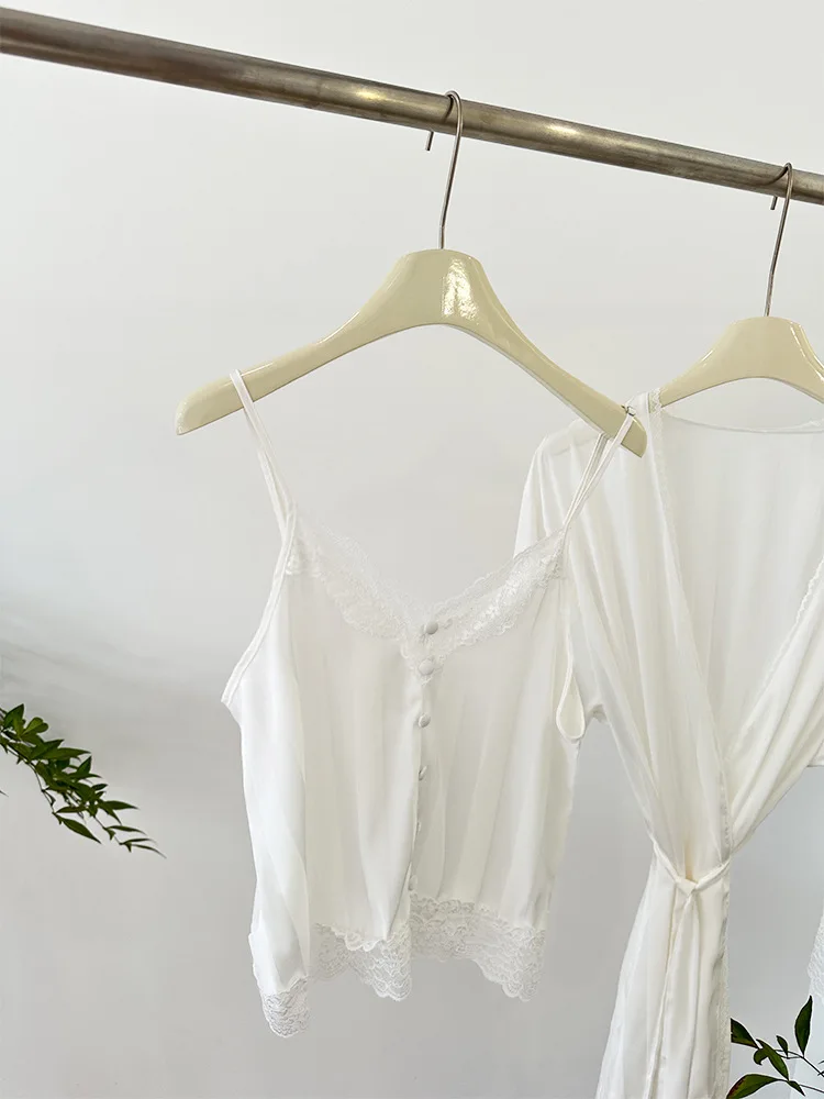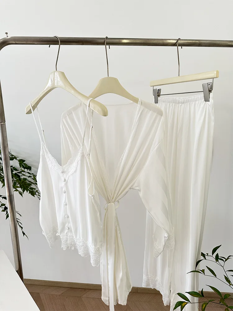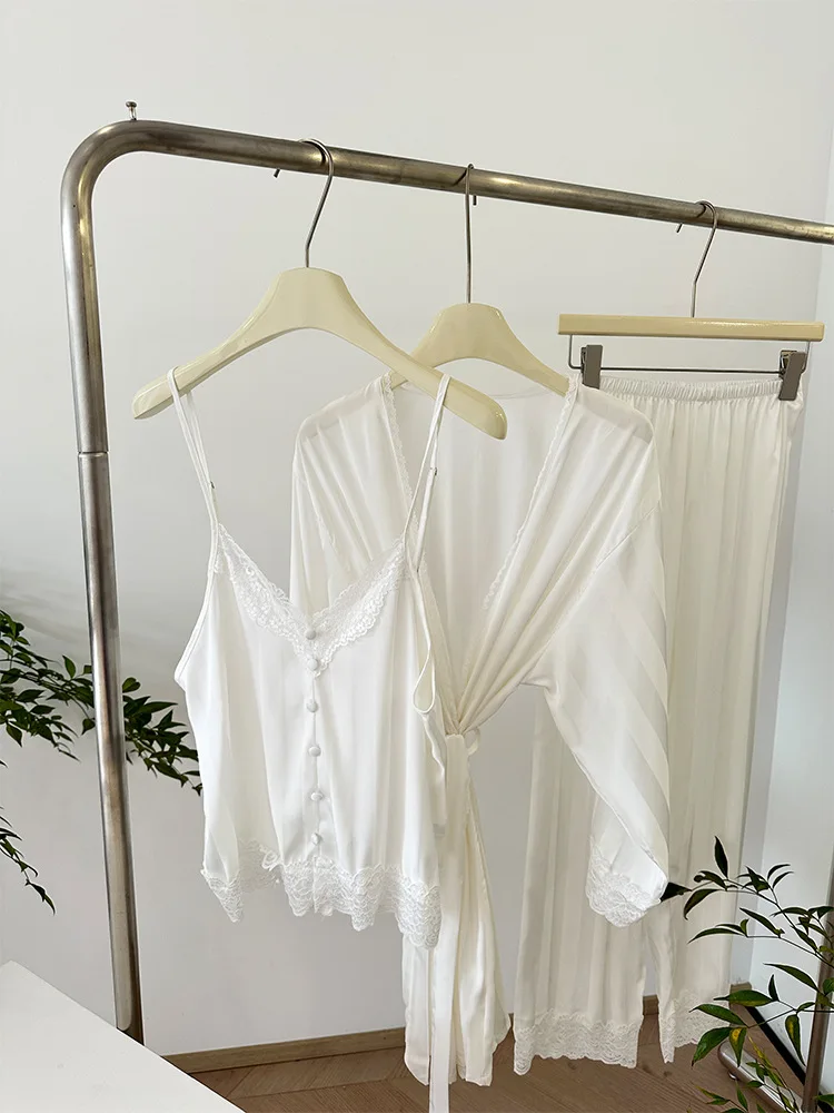 Cyflymder Sexy Lace Trim Women Pajama Set 3PCS Faux Silk Robe Sleeveless Top Long Pant HomeWear Spring Summer Nightwear Elegant Loungewear
