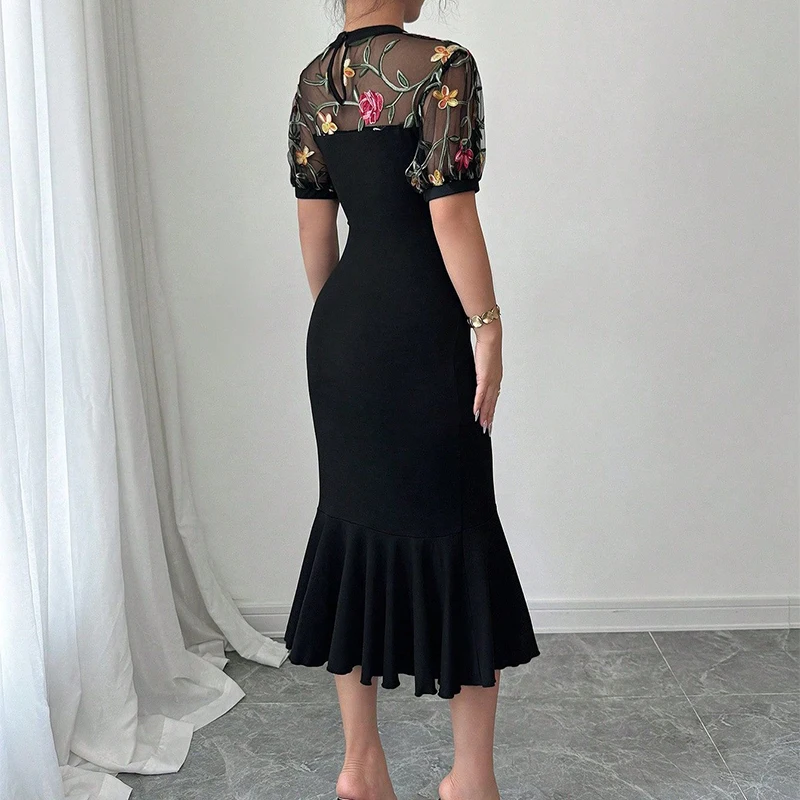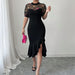 Cyflymder Sexy Mesh Spliced Women Fishtail Dress 2025 Stylish Jacquard Irregular Hem Midi Vestidos Evening Party Female Black O-Neck Dress
