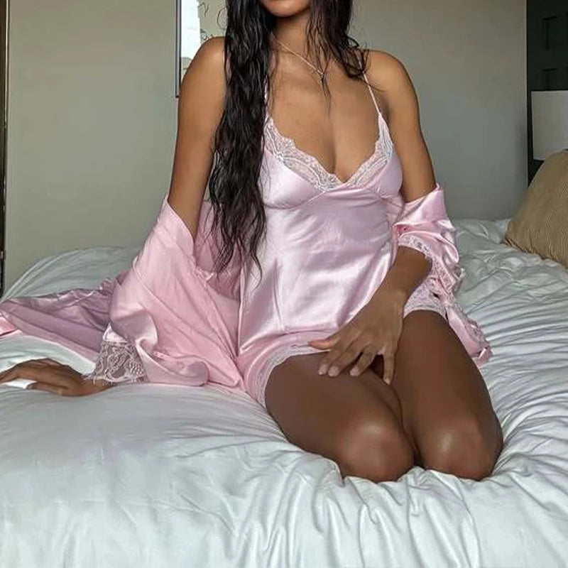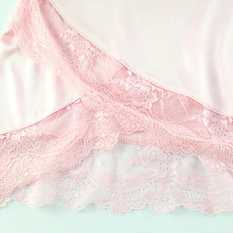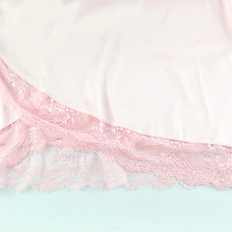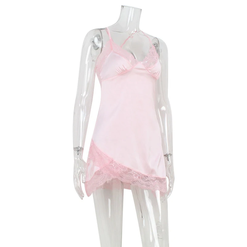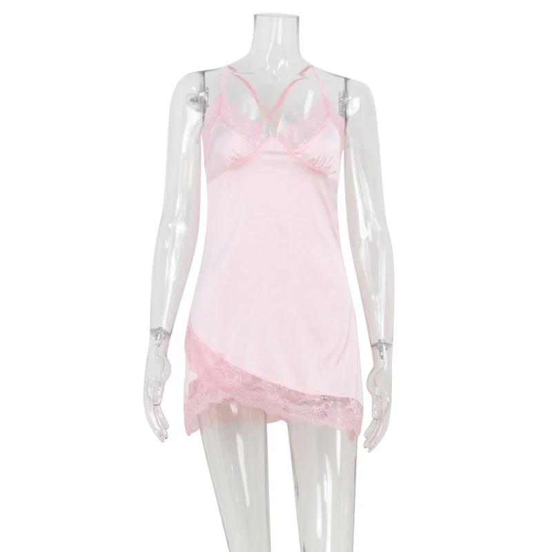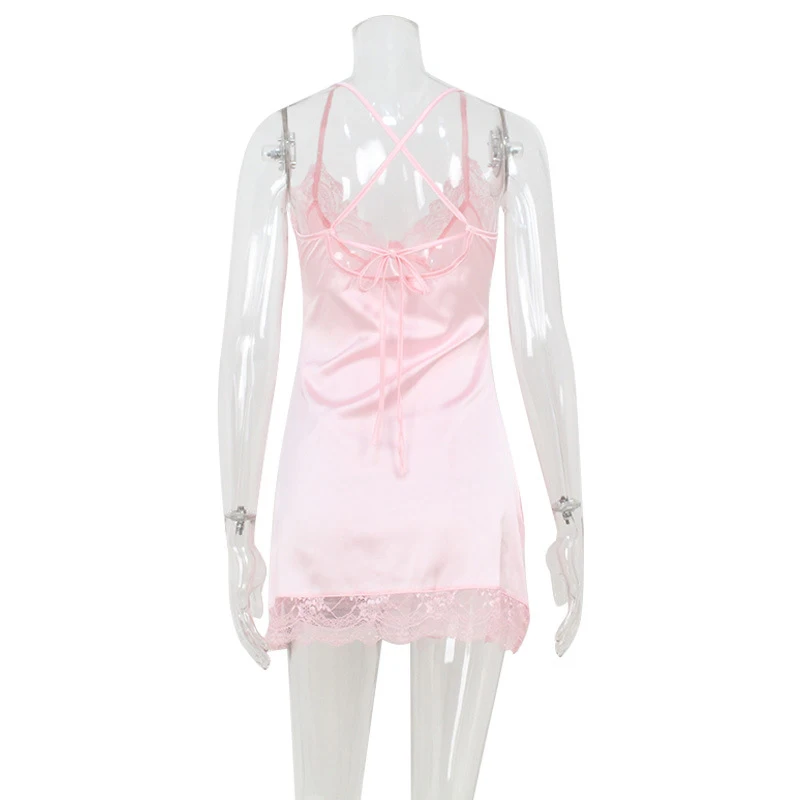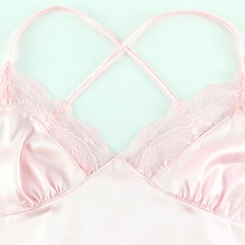 Cyflymder Sexy Pink Lace Patchwork Suspender Nightgown Criss-cross Backless V-neck Satin Comfort Solid Color Women's Sweet Nightdress