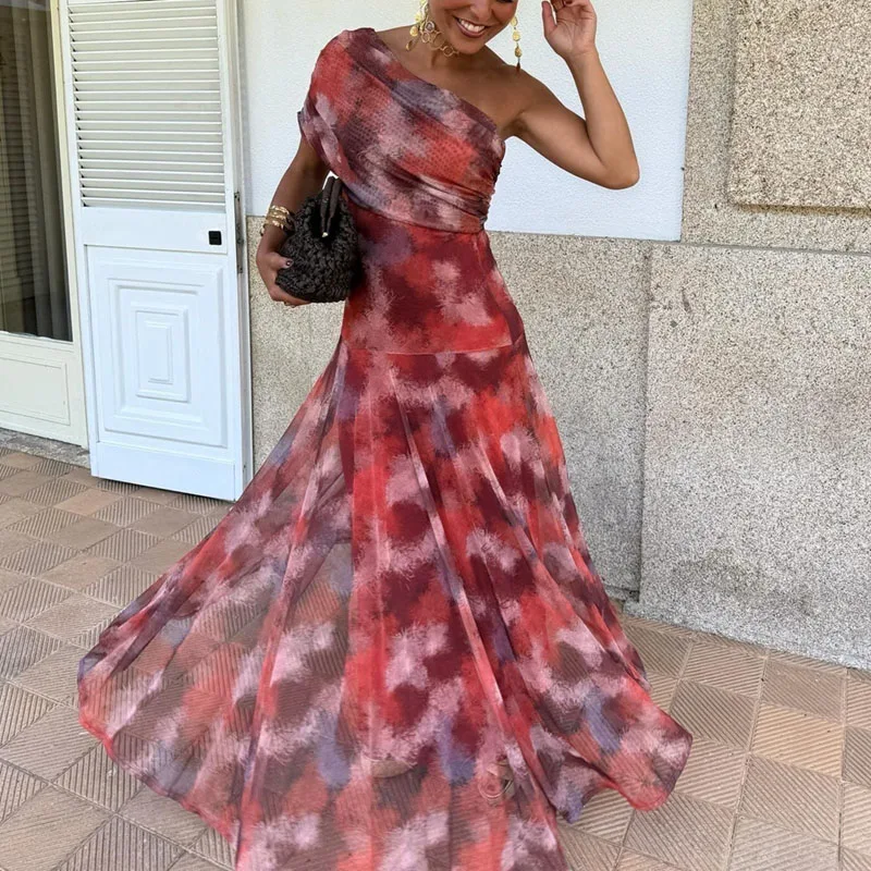 Cyflymder Sexy Skew Collar Draped Swing Long Dress Woman Elegant Print Pleated Party Dress Summer Backless Hollow Out Maxi Dresses Vestido