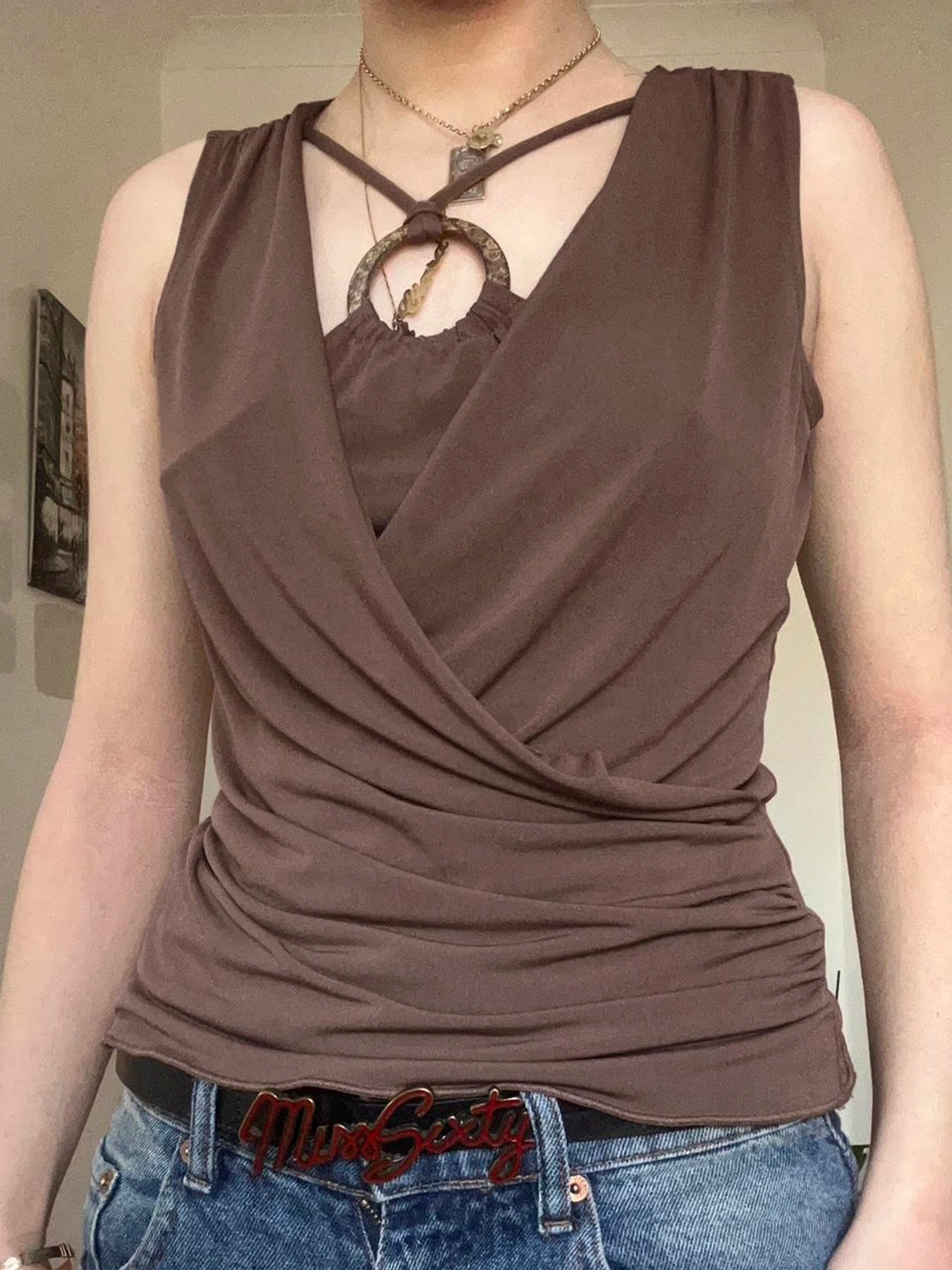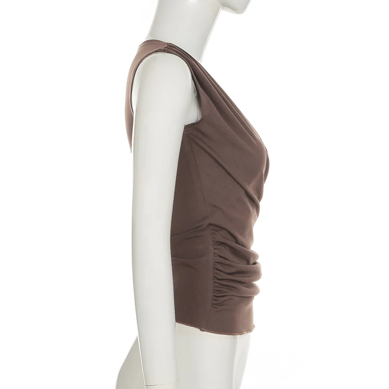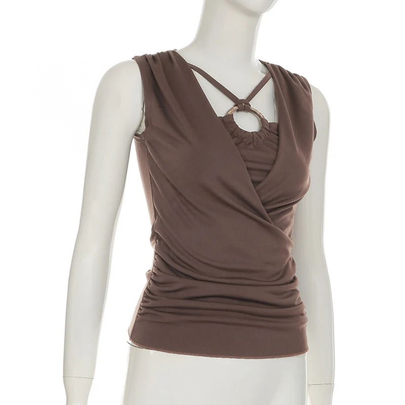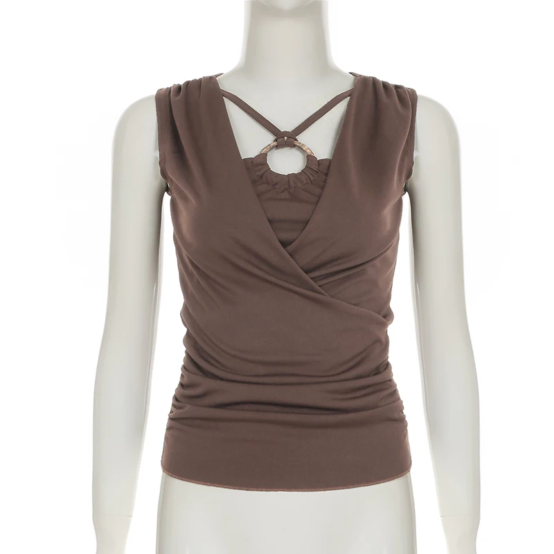 Cyflymder Sexy Slim Folds Tank Tops Fake 2 Piece Elegant Bandage Hollow Out V-Neck Sleeveless Tops Women Summer Fashion Lady