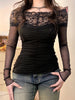 Cyflymder Sexy Slim Lace Trim Mesh T Shirt See Through Casual Slash Neck Long Sleeve Tees Women Autumn Spring Streetwear Lady