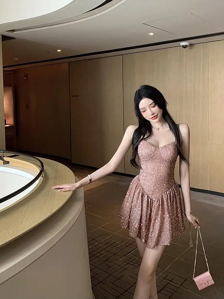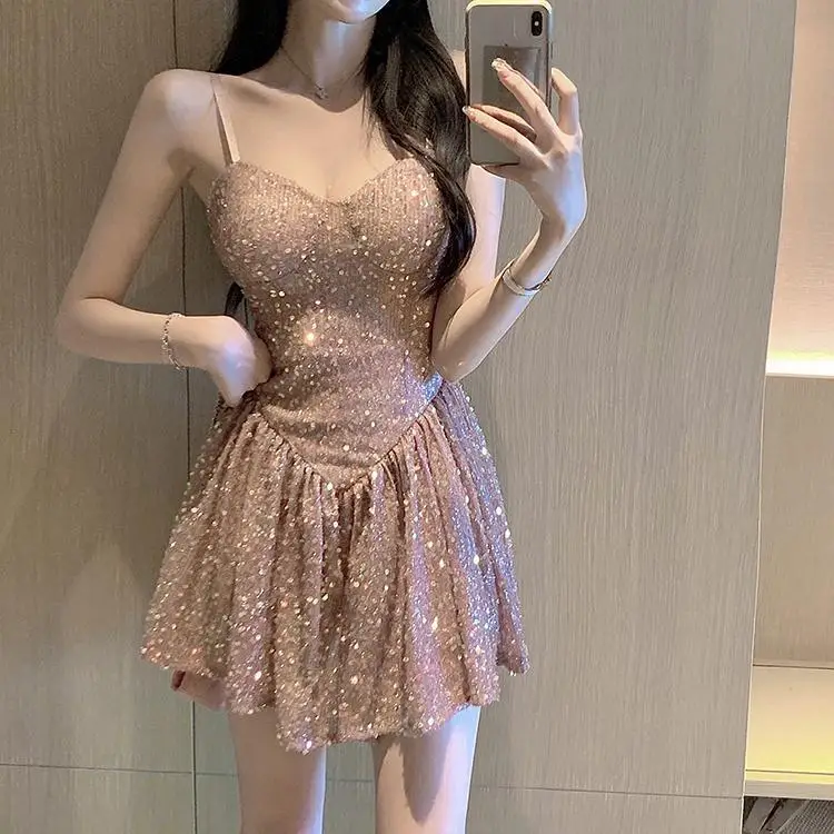 Cyflymder Sexy Suspender Shiny Sequin Skirt Waist Slimming and Pleated Dress