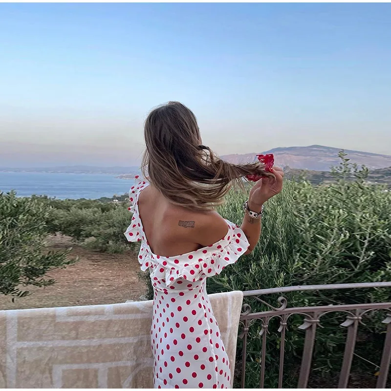 Cyflymder Slash Neck Polka Dot Printed Dress Women Color Blocking Design Elegant Fashion Casual Robe Versatile Off Shoulder Flounce Dress