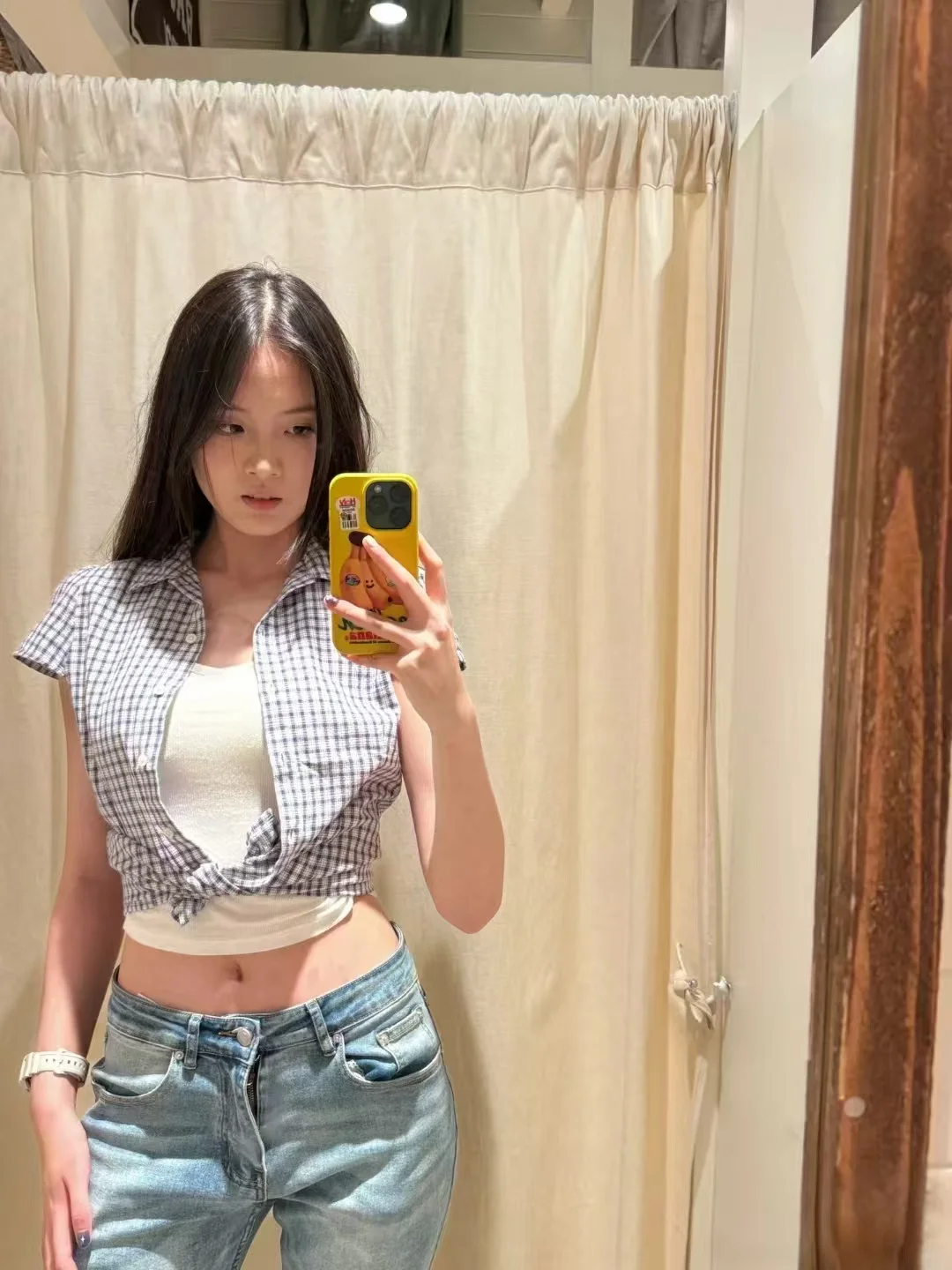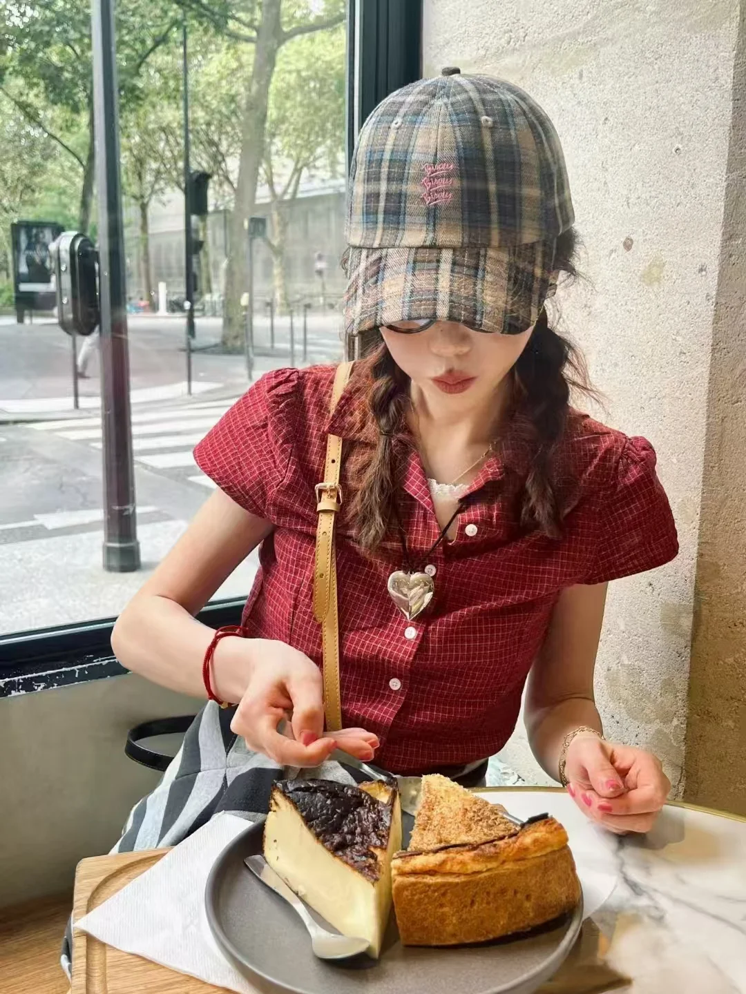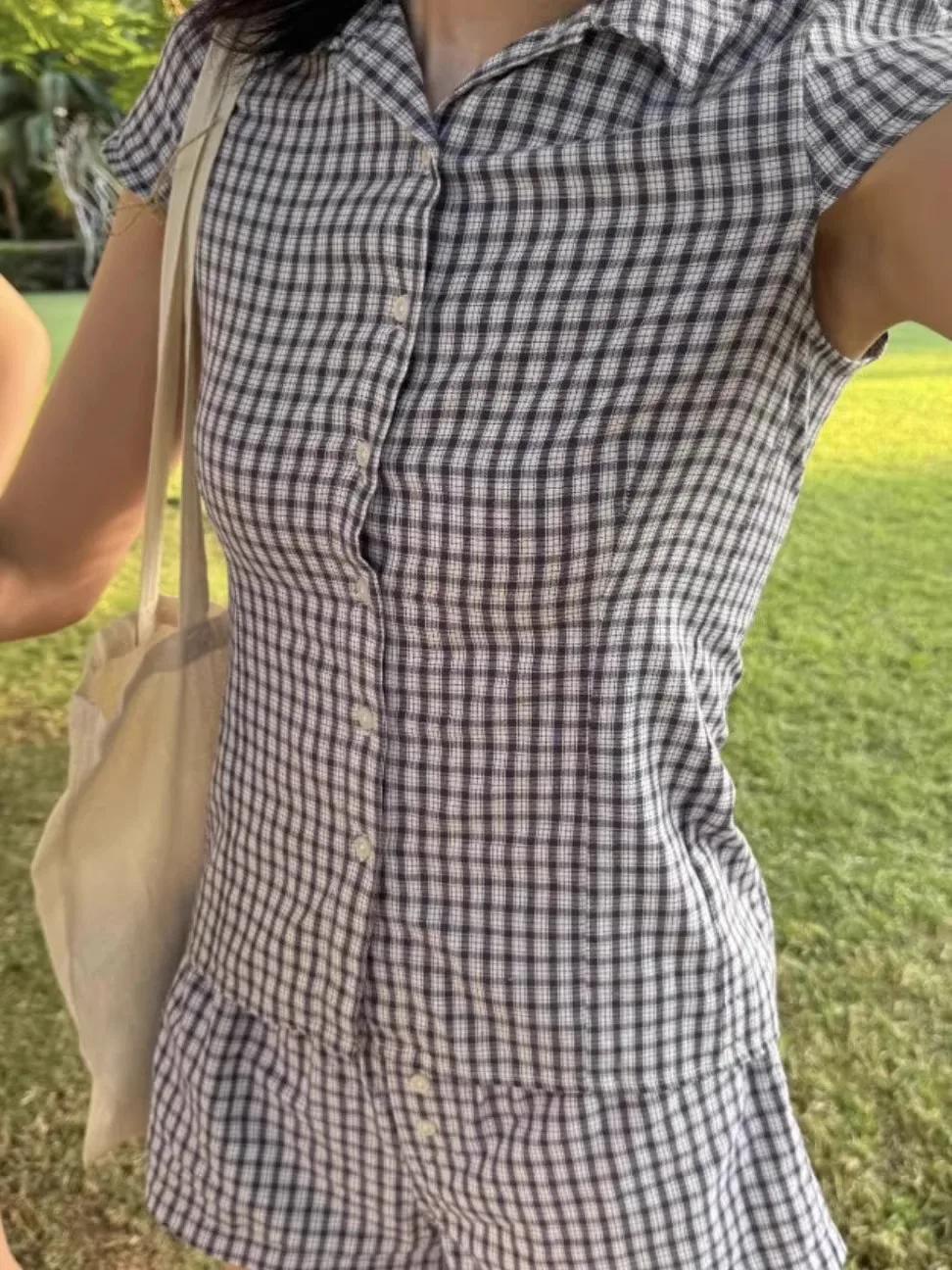 Cyflymder Slim Fit American Retro irt for Women with Collar ort Sve Purple Plaid Waist-Cinching Casual Sle Korean Faion