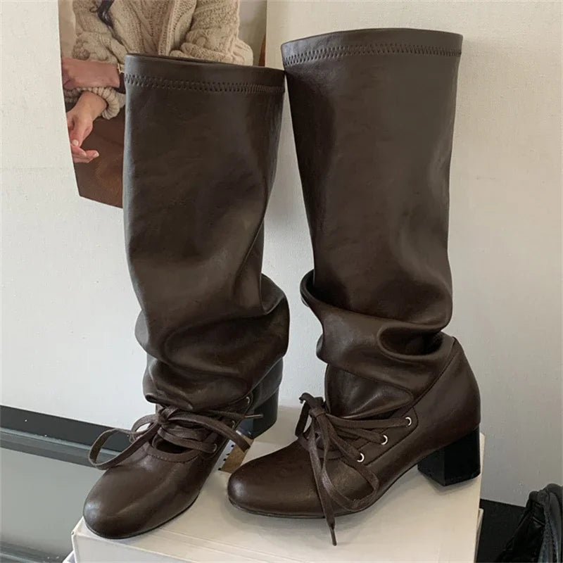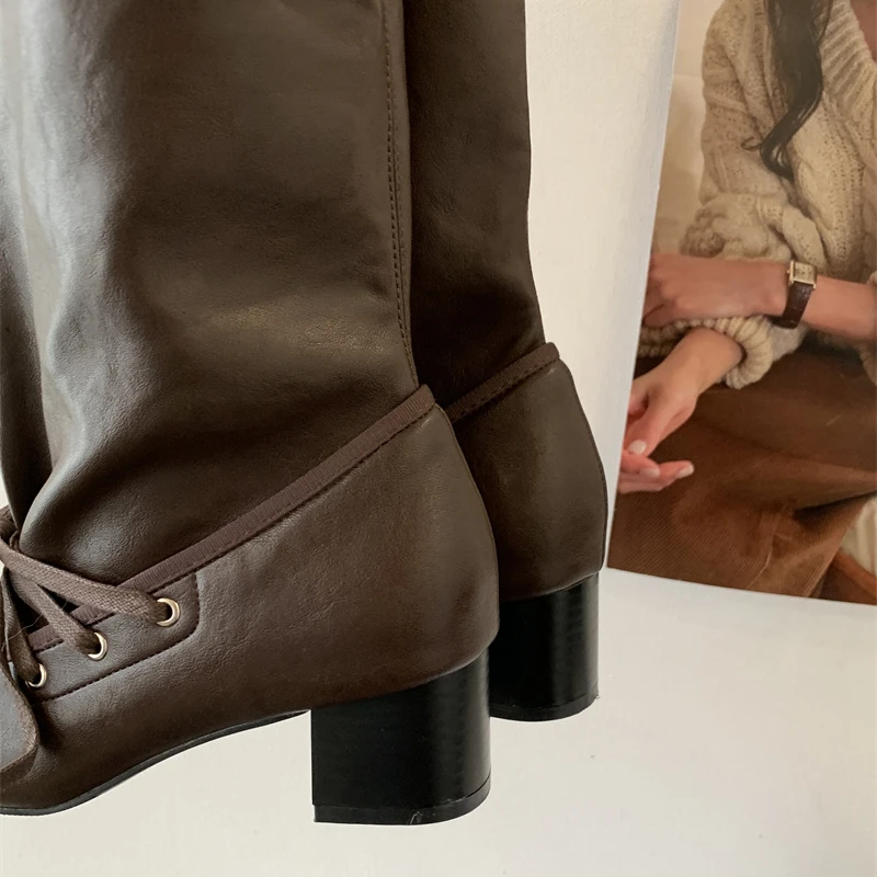 Cyflymder Soft Leather Lace Up Pleated Knee High Boots for Women Round Toe Square Low Heels Long Booties Ladies Autumn Winter Shoe Female