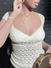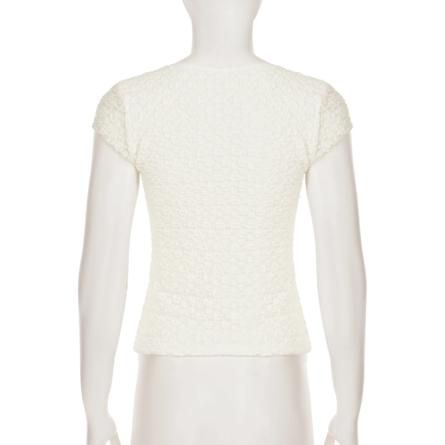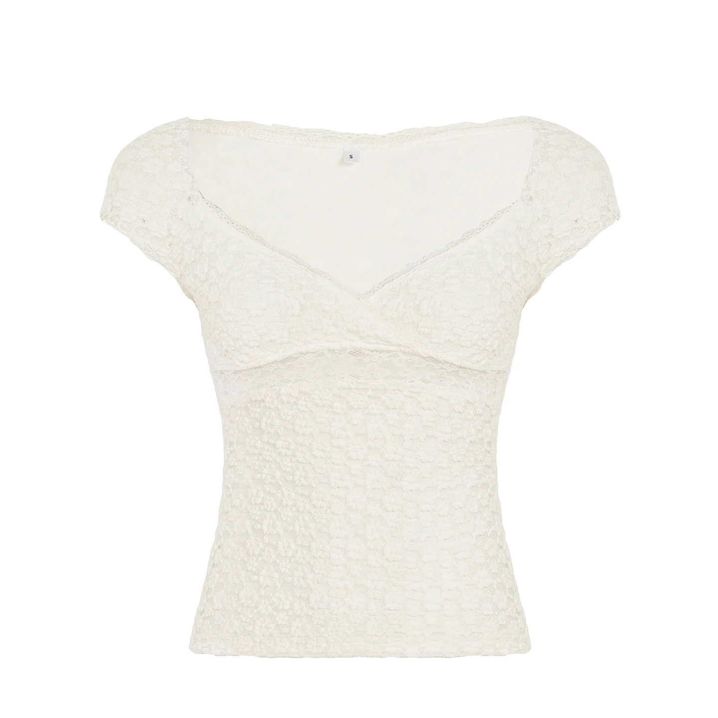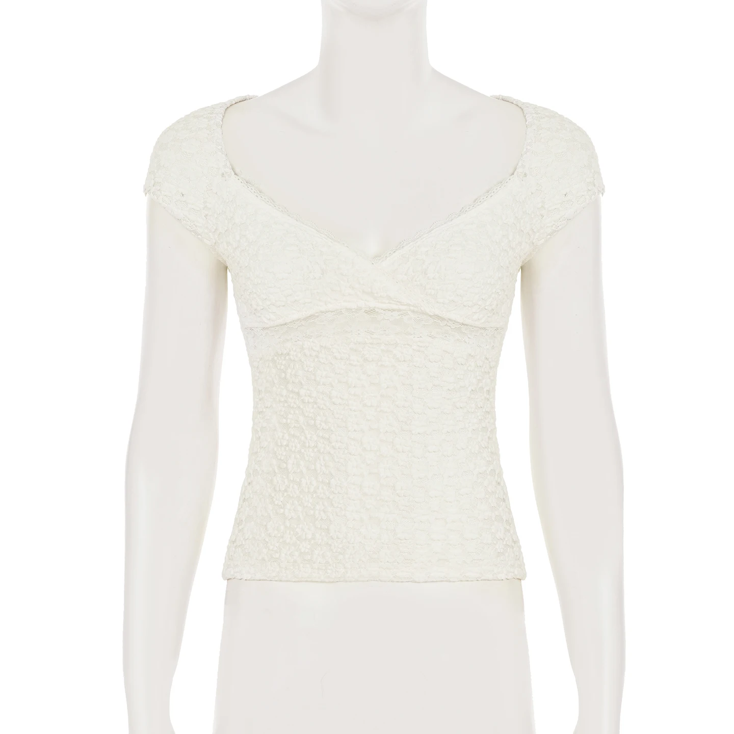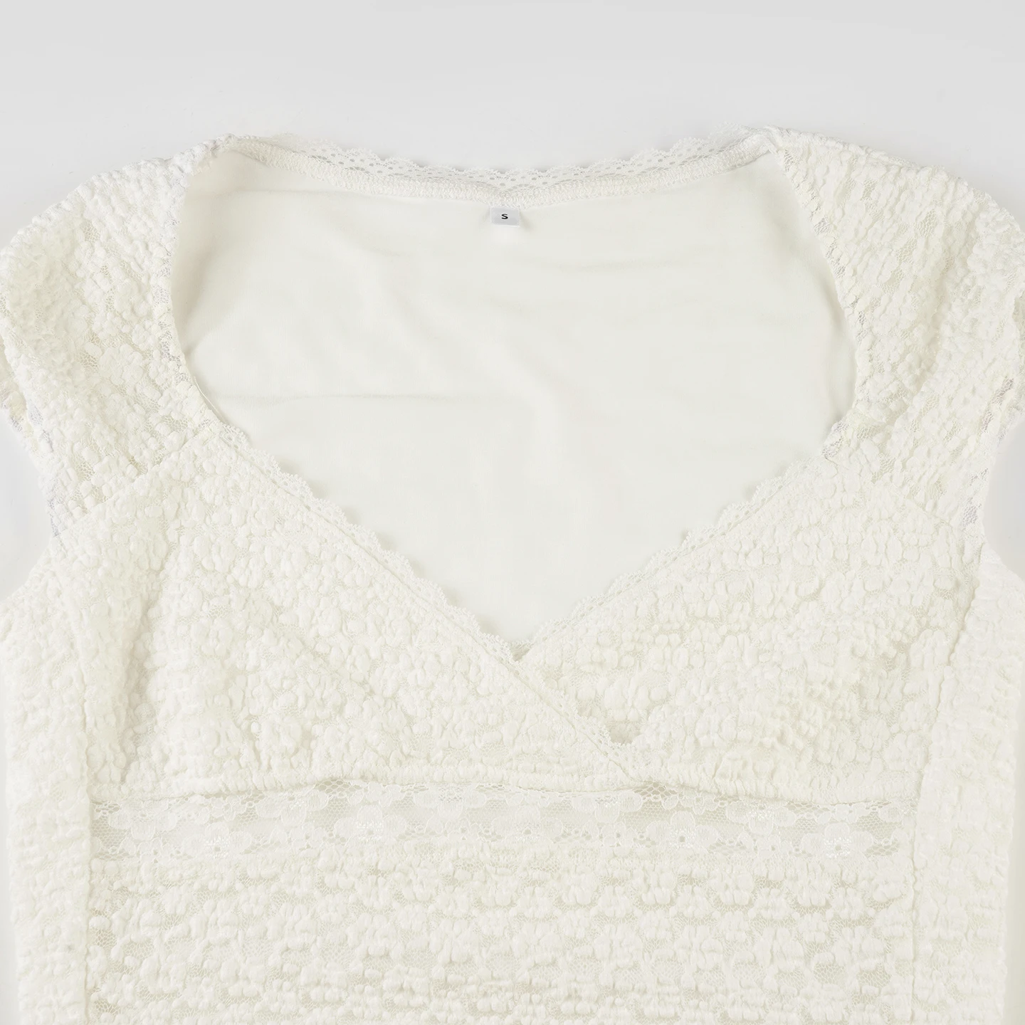 Cyflymder Solid Lace Crop Tops Cute Coquette Square Collar Short Sleeve Slim-fitting T-shirts for Women Summer Casual Skinny Tees