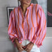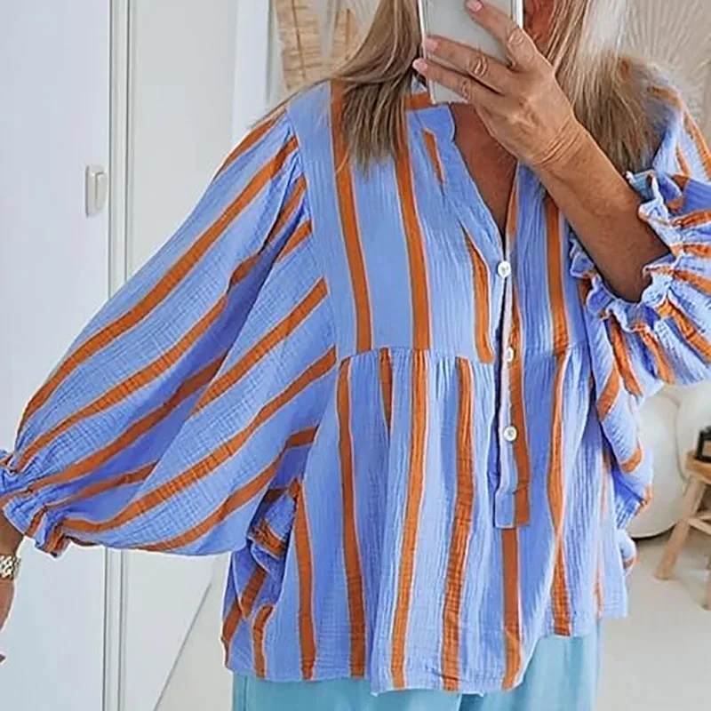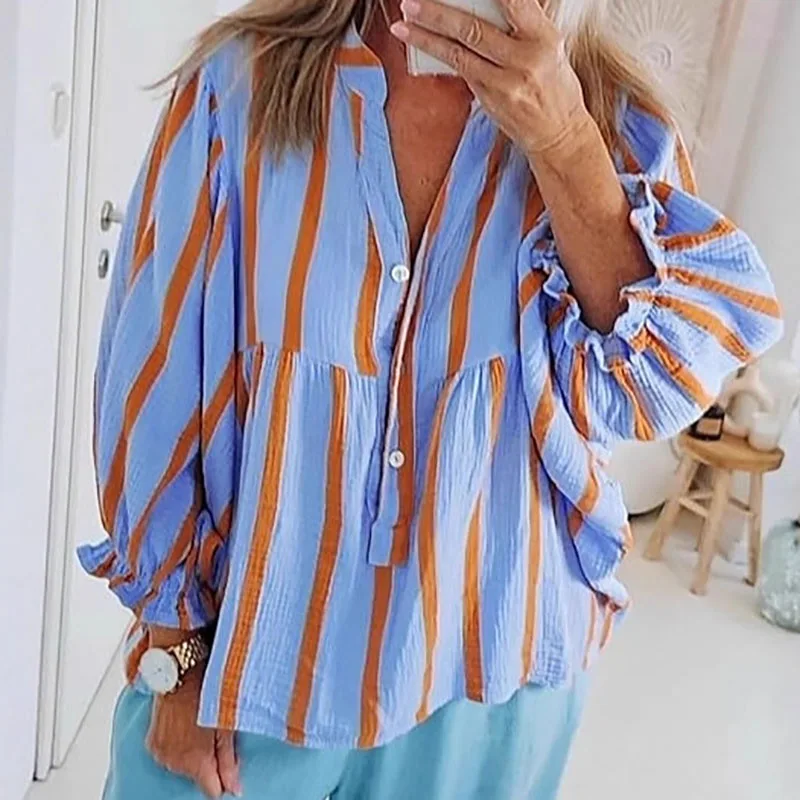 Cyflymder Streetwear Fashion Striped Print Women Blouses 2025 Spring V Neck Button Top Pullover Autumn Puff Long Sleeve Loose Shirt Blusas