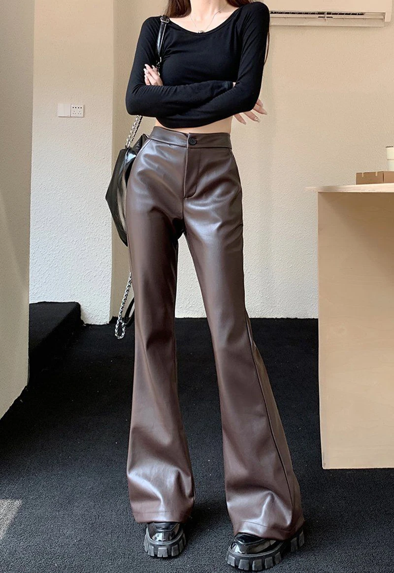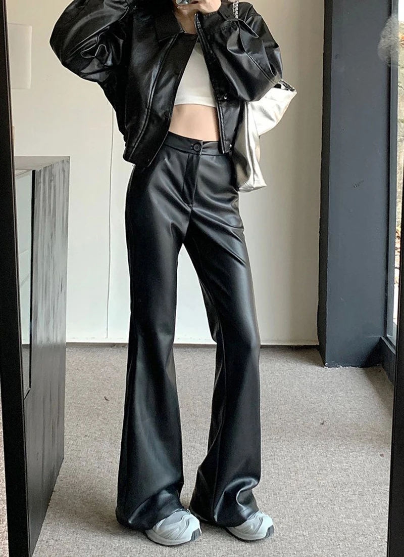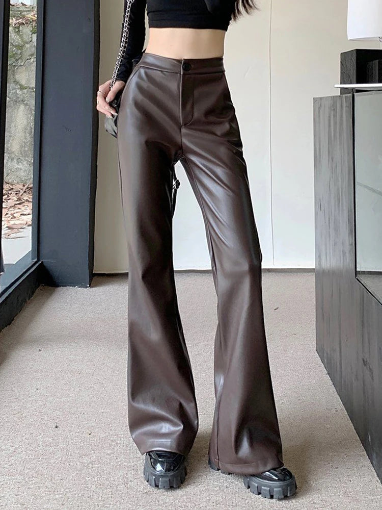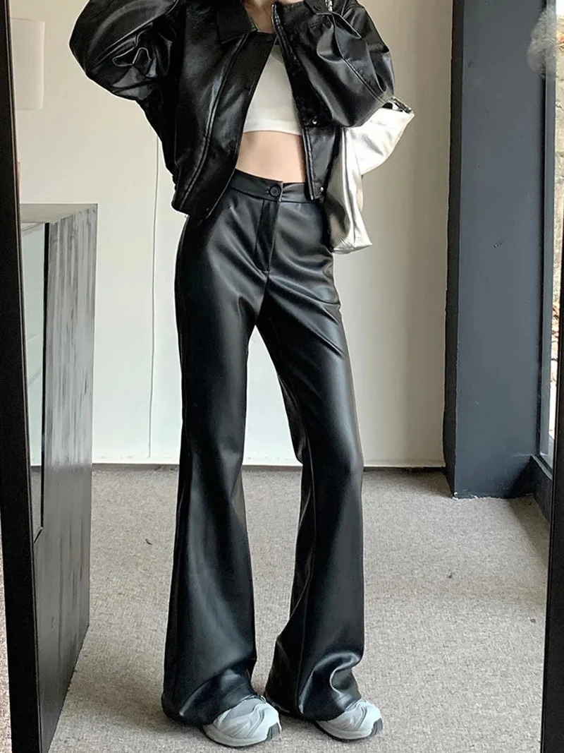 Cyflymder Streetwear Moto Pu Flare Pants Women High Waist Slim Vintage Trousers Harajuku Casual American Retro Female Autumn Pants