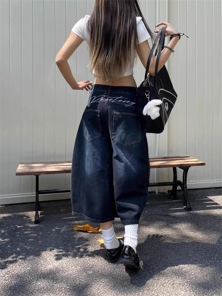 Cyflymder Summer Cool Girl Wide Leg Letter Embroidery Denim Cropped Pants Women's Calf-length Jeans Female High Waist Capris Pants