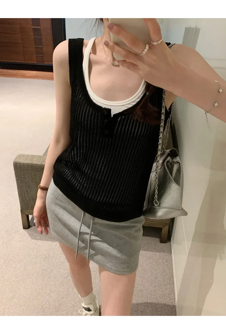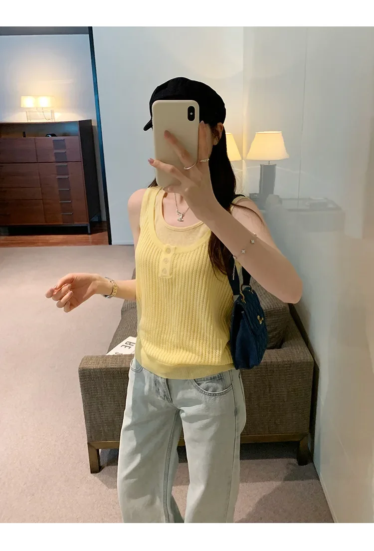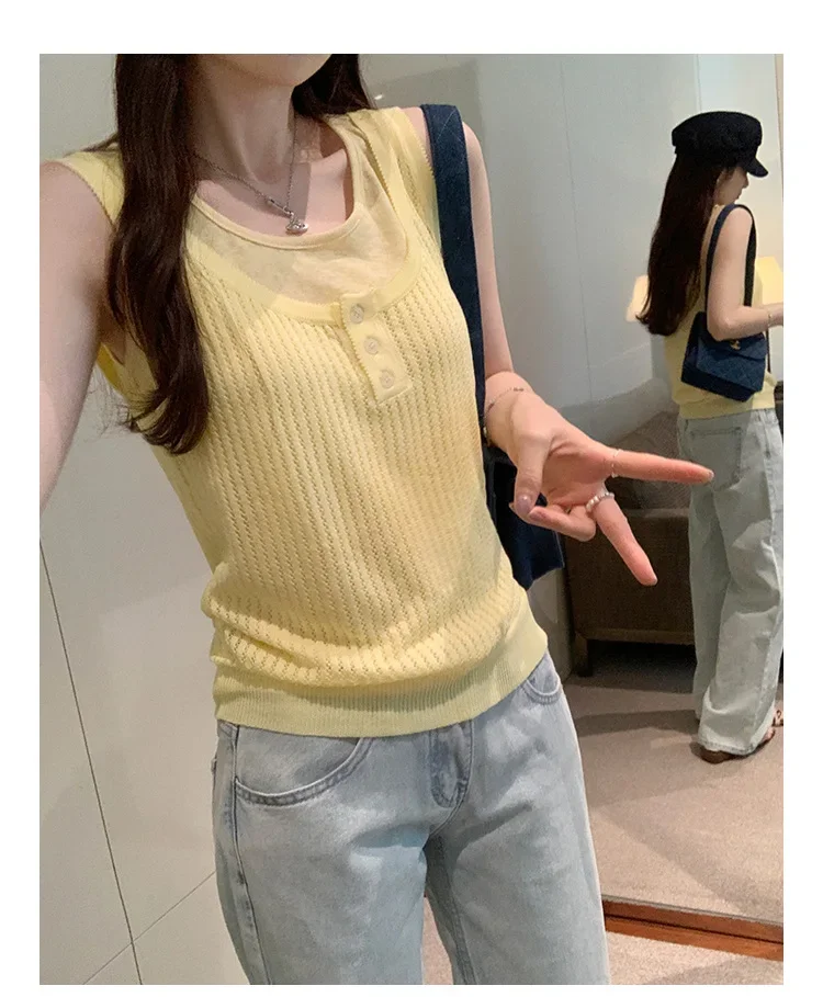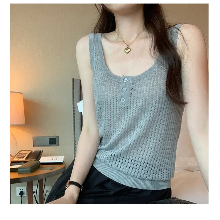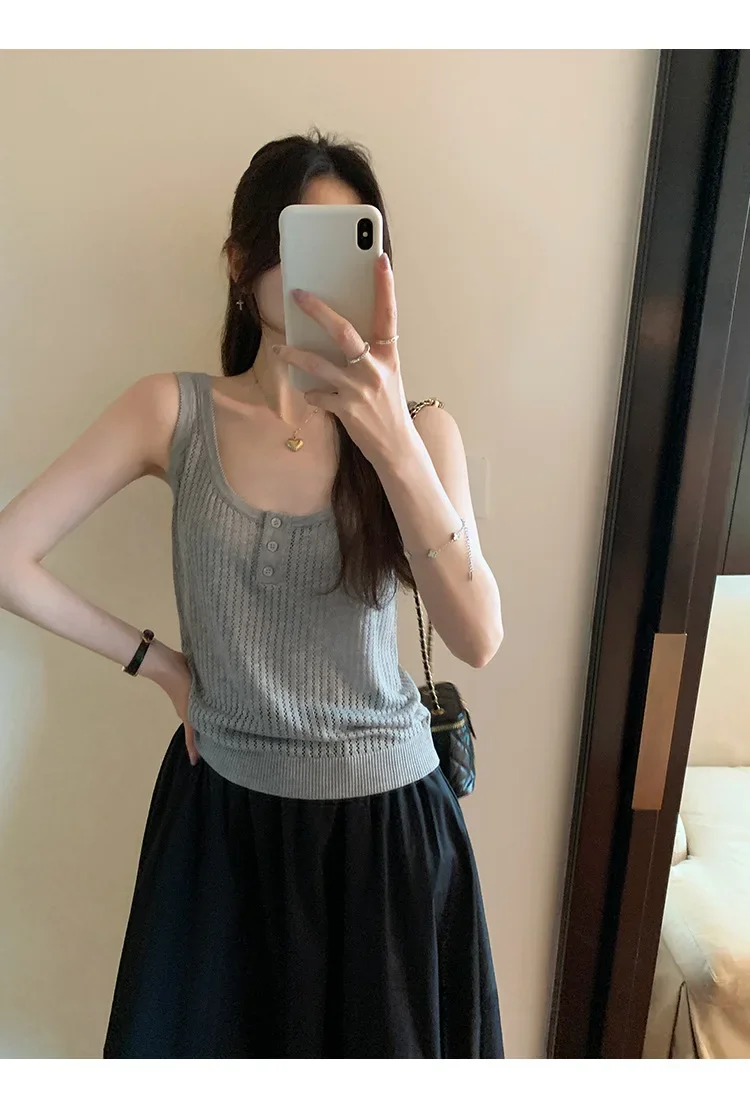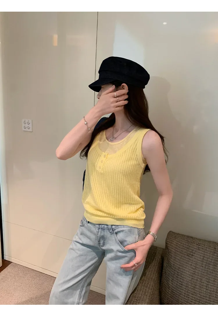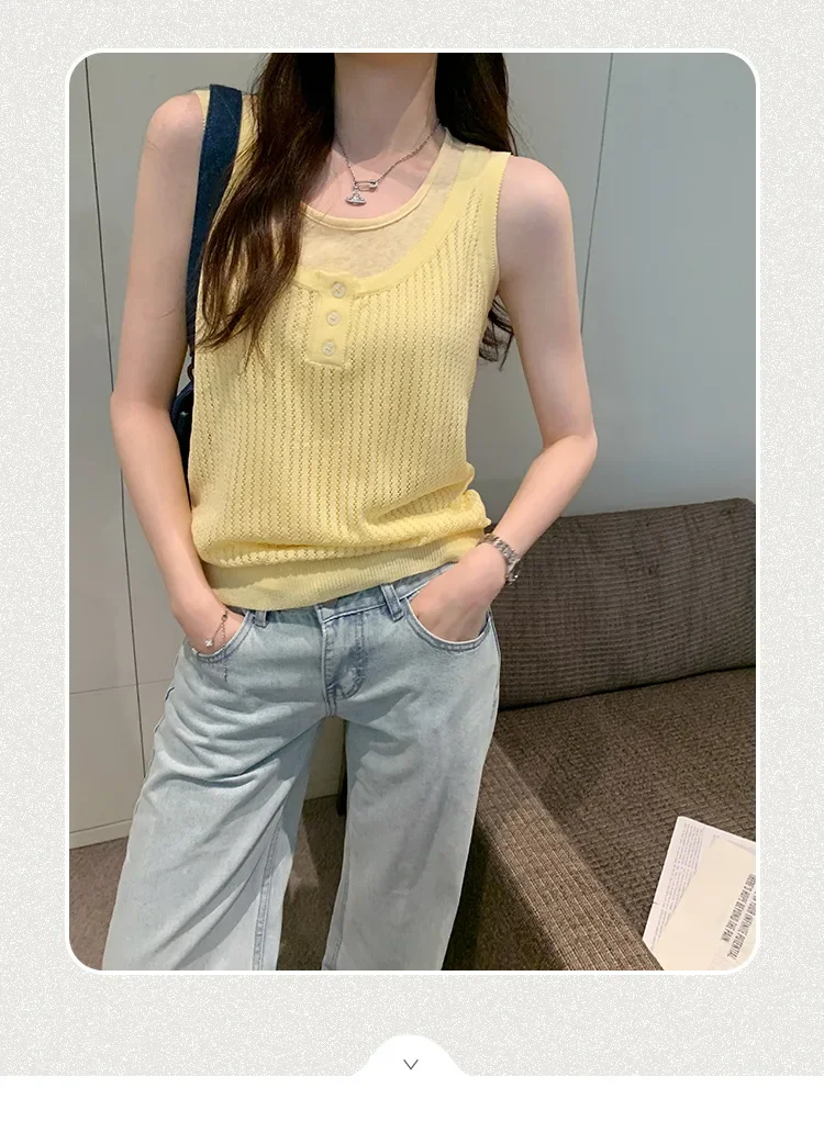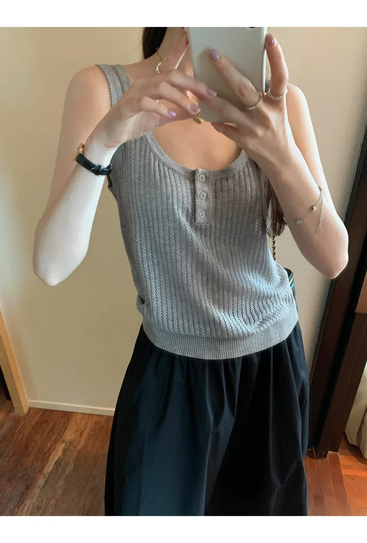 Cyflymder Summer Elegant Design Loose Knitted Vest Women's Thin Button up Top Outerwear Short Shirt Casual Fashion Minimalist Style