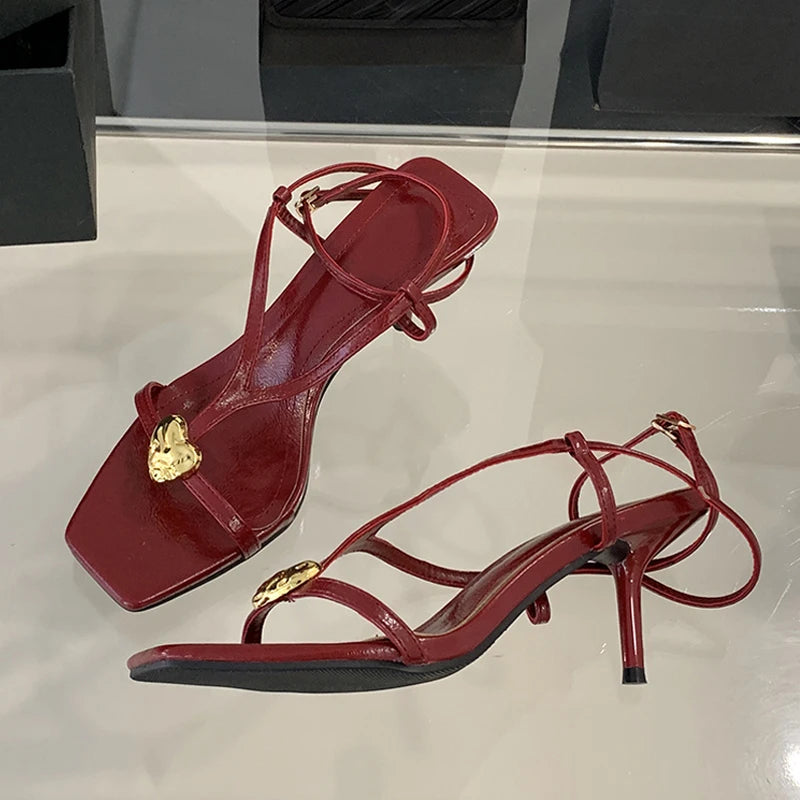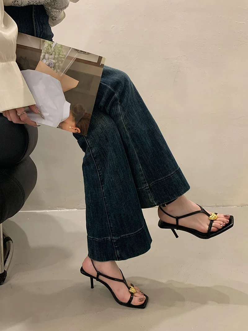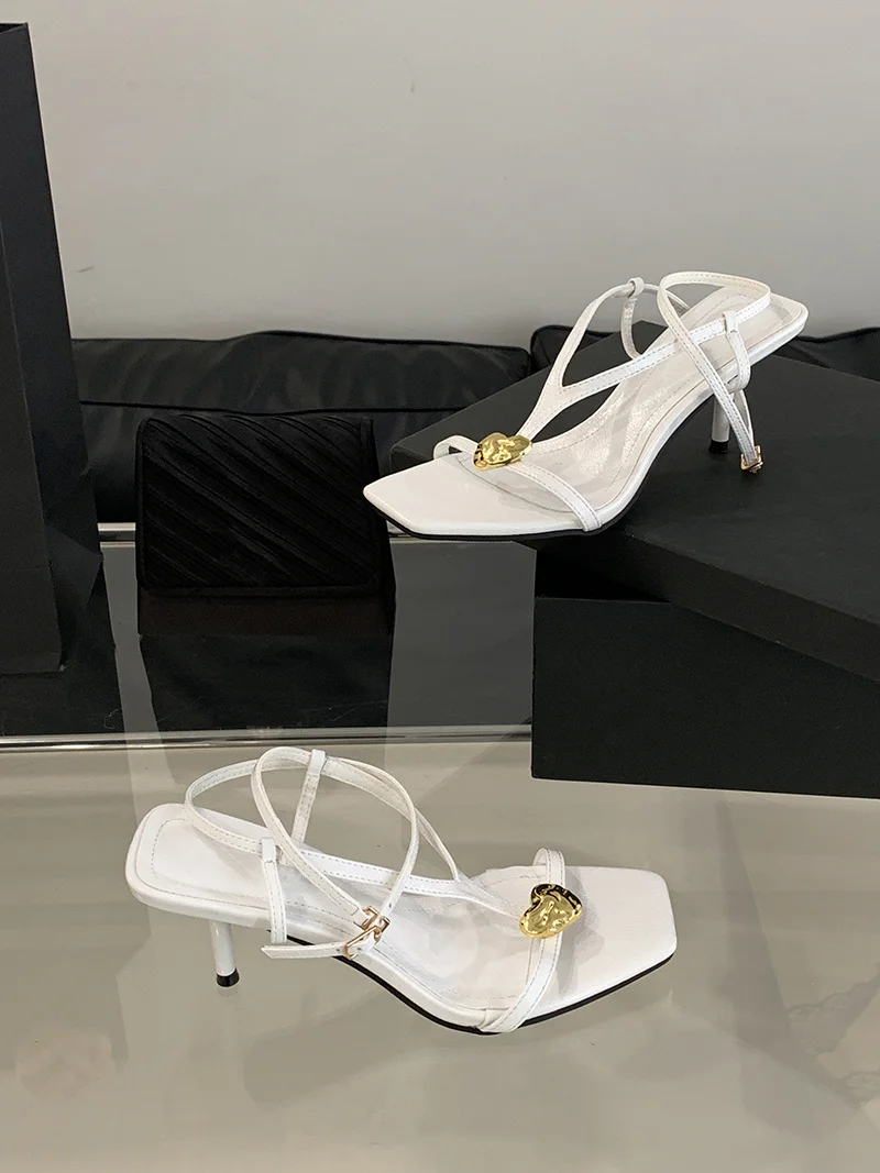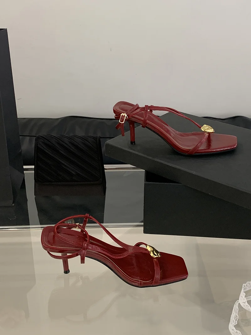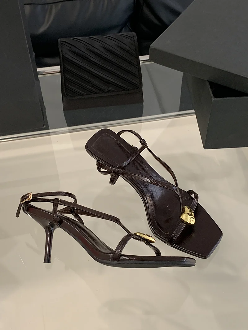 Cyflymder Summer Fashion Metal Buckle Decoration Narrow Band Gladiator Sandals Women Square Toe Low Thin Heels Party Dress Shoes