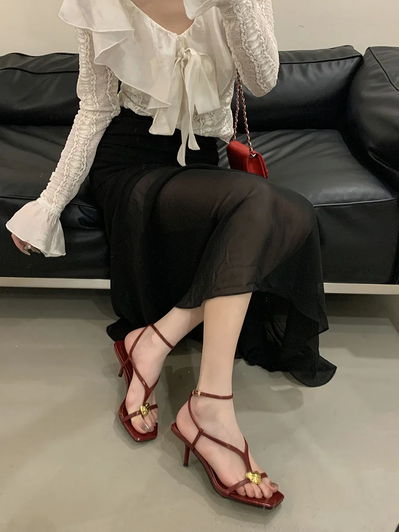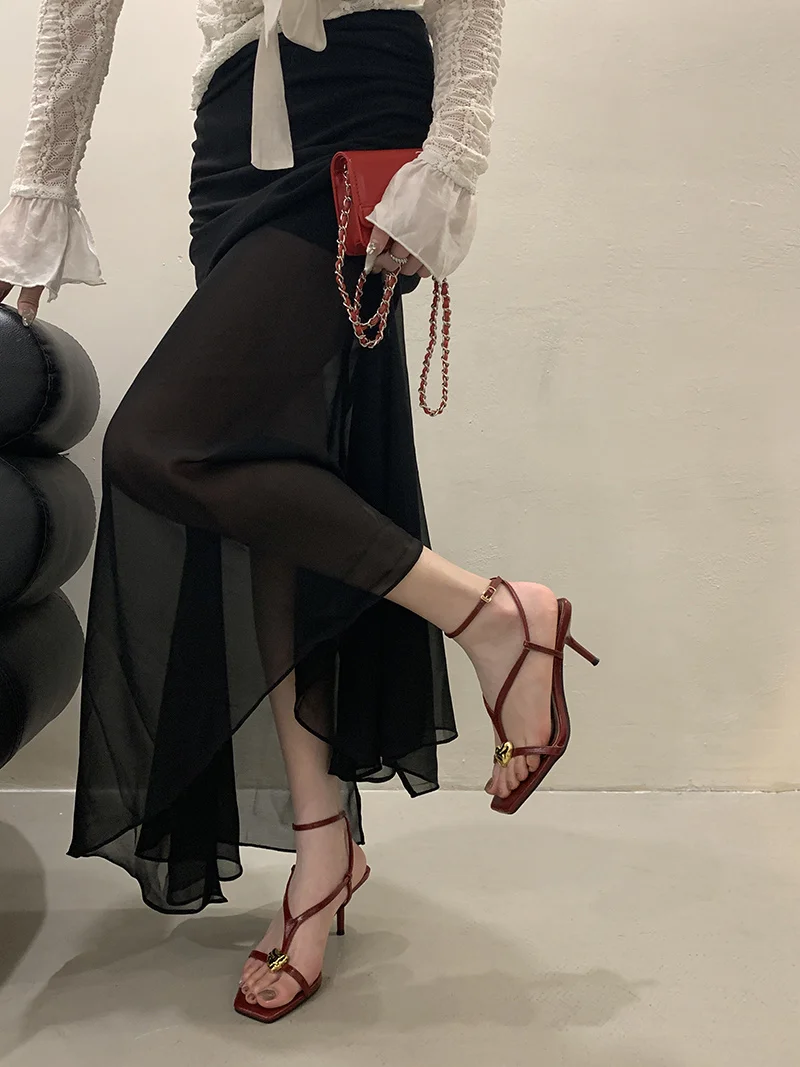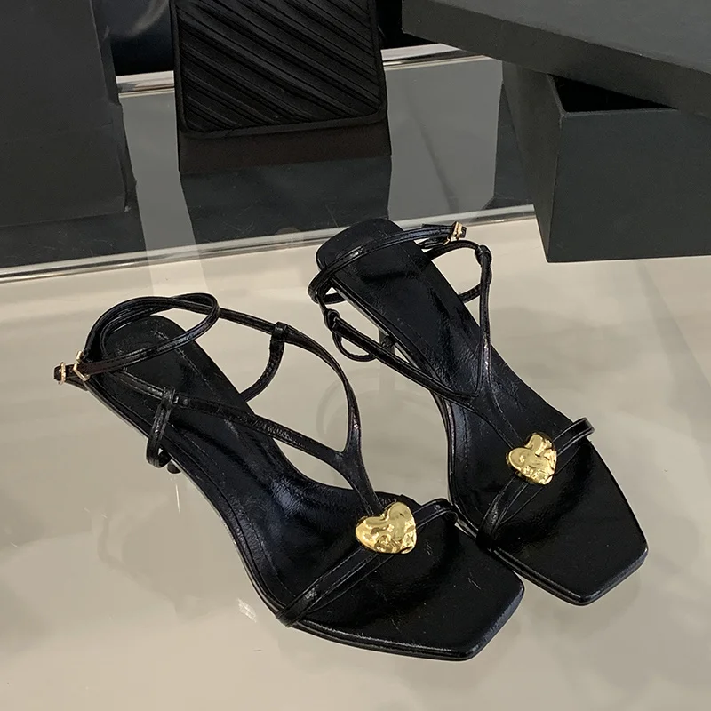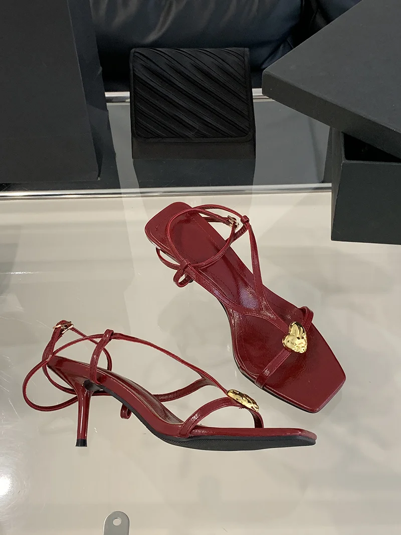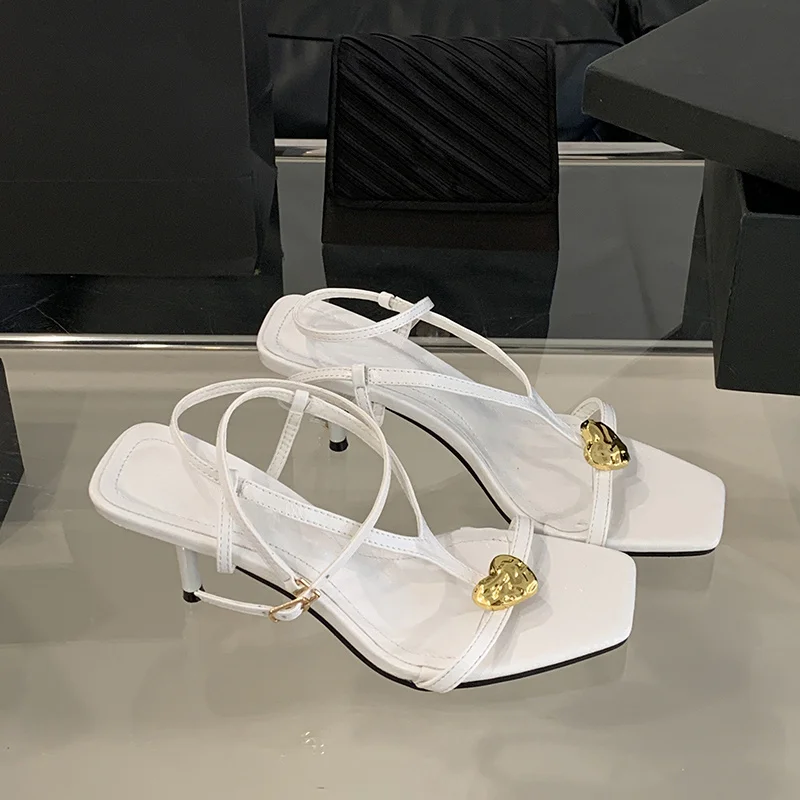 Cyflymder Summer Fashion Metal Buckle Decoration Narrow Band Gladiator Sandals Women Square Toe Low Thin Heels Party Dress Shoes