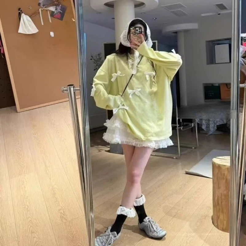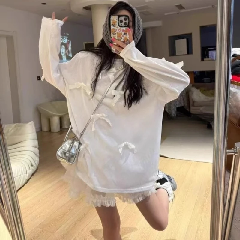 Cyflymder Summer Fashion O Neck Long Sleeve Loose T Shirts Sweet Bow Appliques Lazy High Street Clothes Y2k Have Shoulder Pads Thin Tops