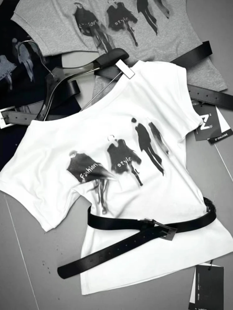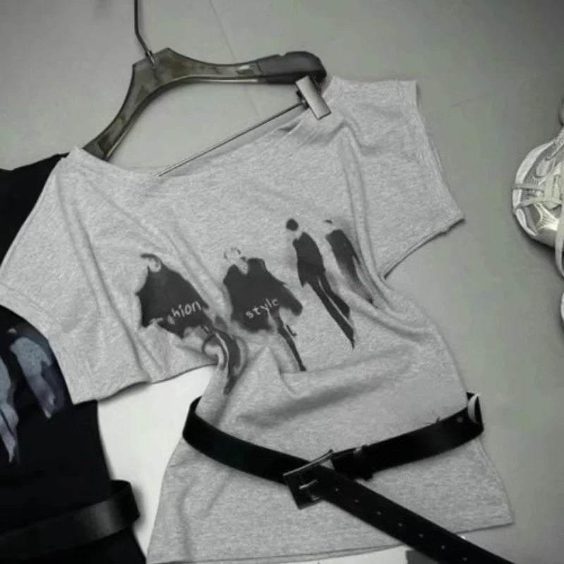 Cyflymder Summer Lazy Streetwears Skewn Collar Short Sleeve T Shirts Y2k Aesthetic Vintage Personality Women Clothes Punk with Belt Tops