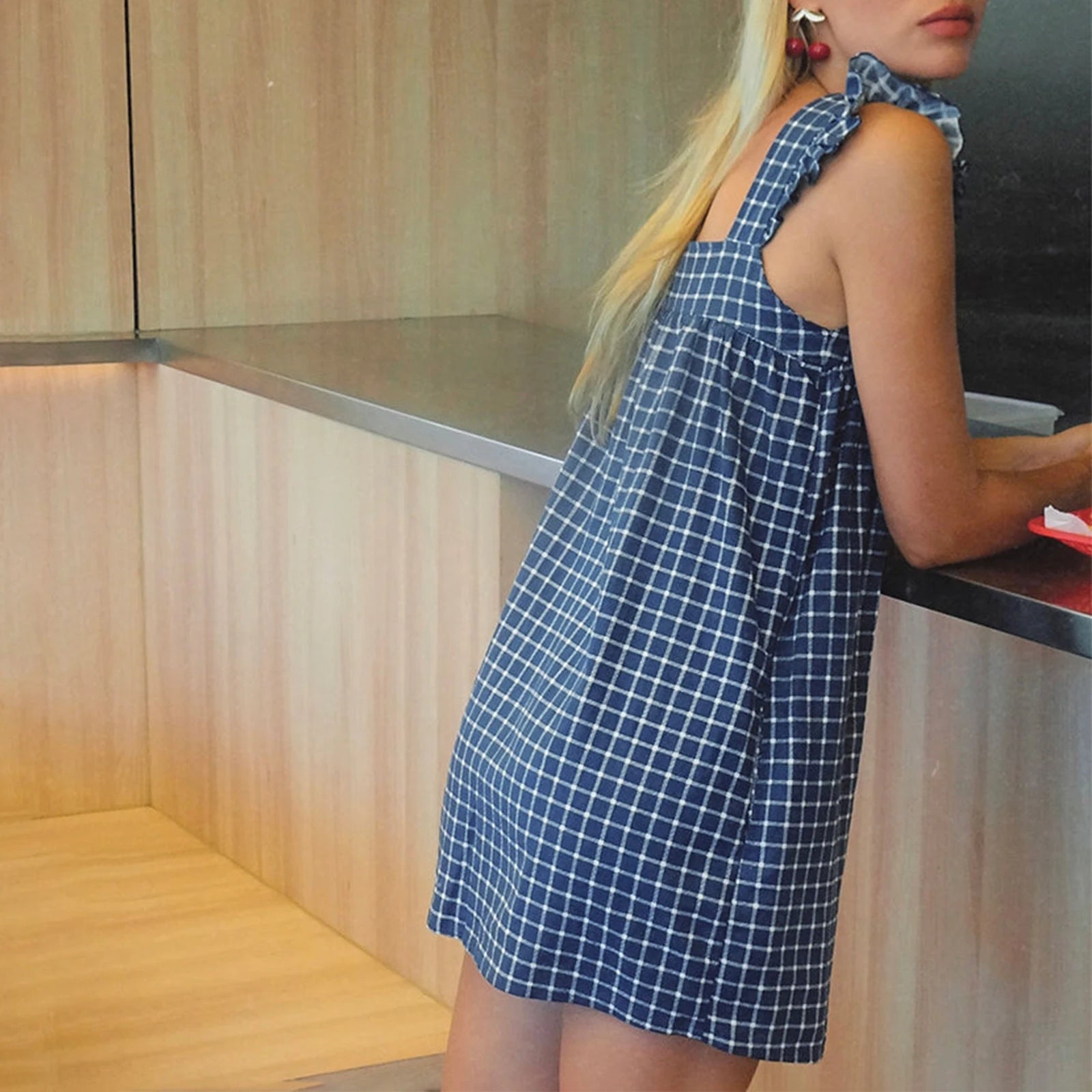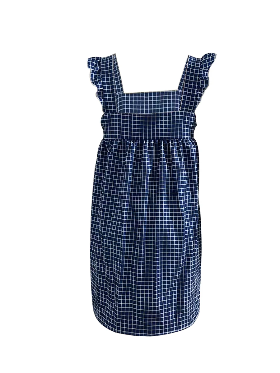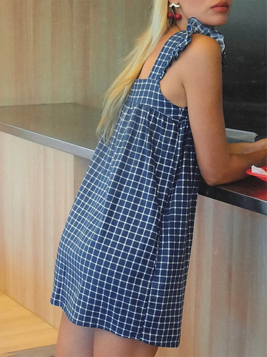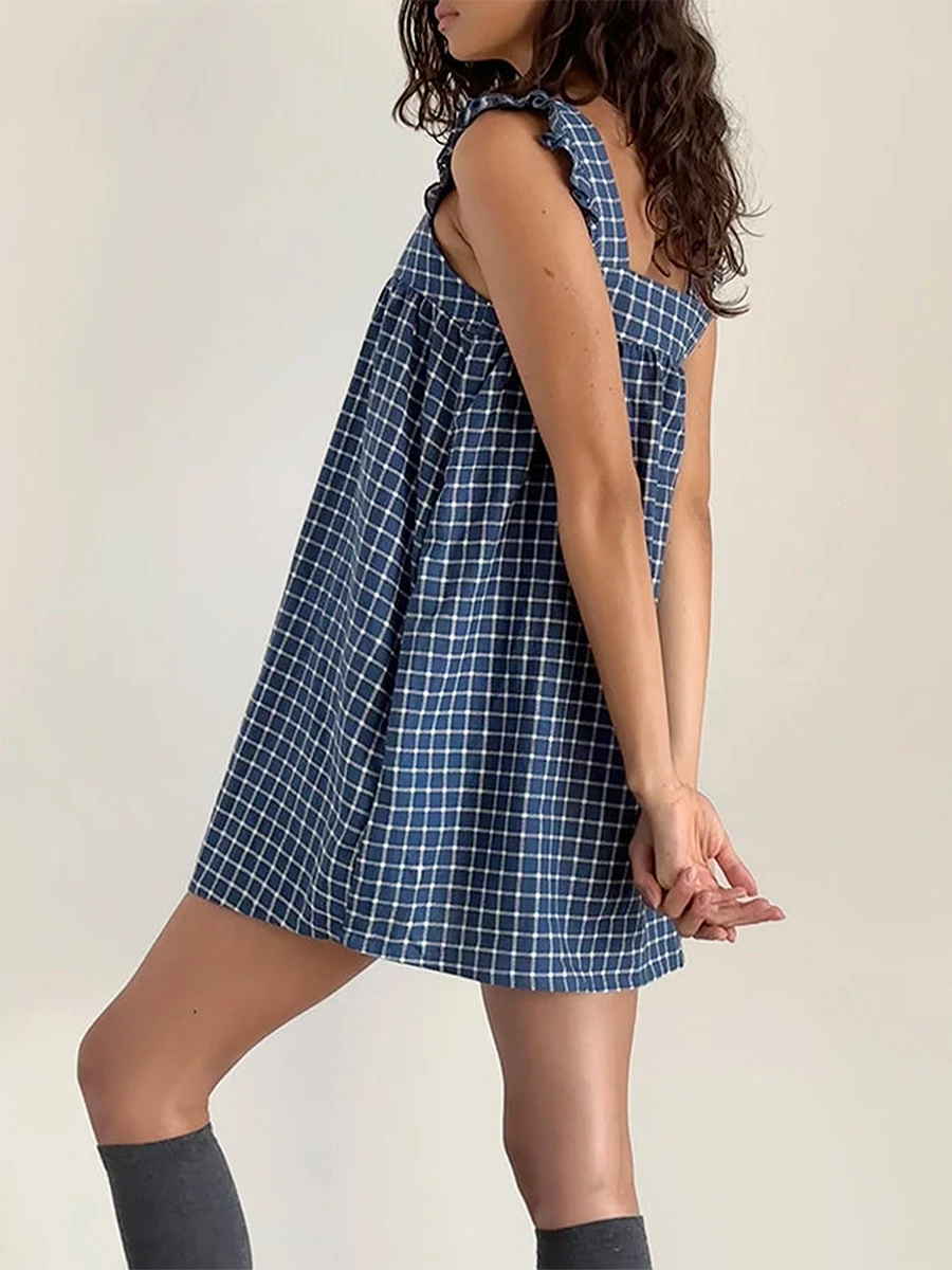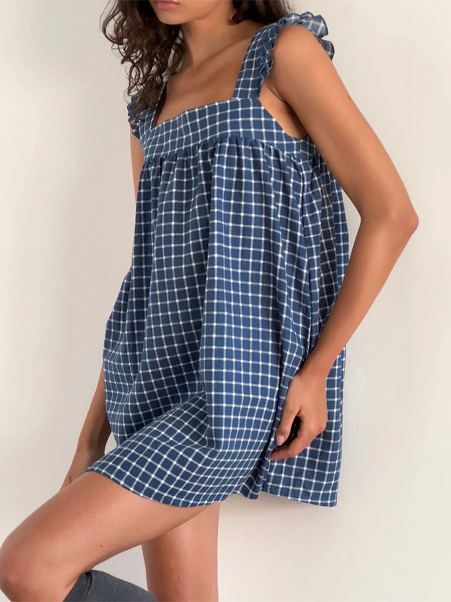 Cyflymder Summer Mini Plaid Print A line Dress for Women Sleeveless Ruffle Trim Square Neck Loose Fitting Cami Dress With Pocket