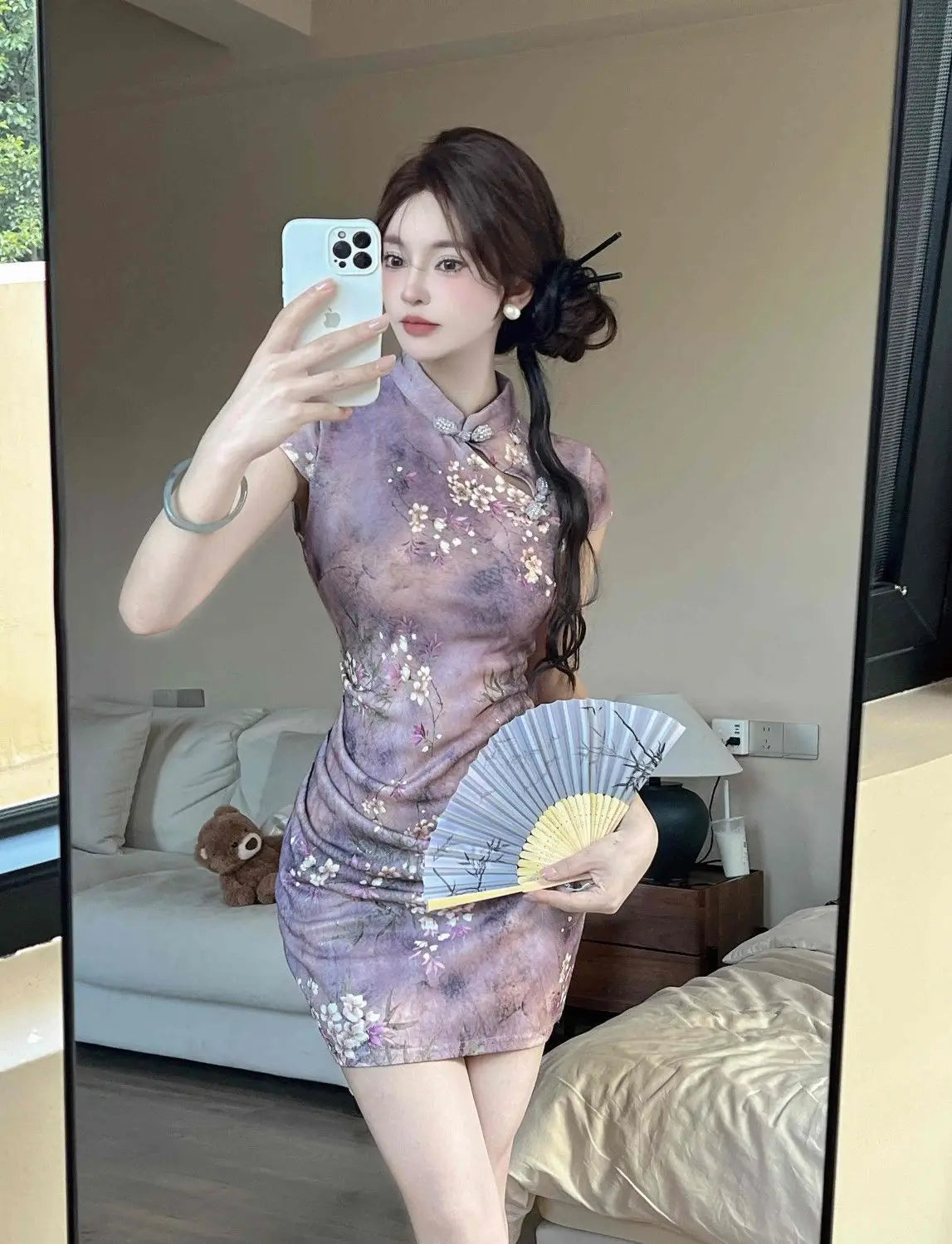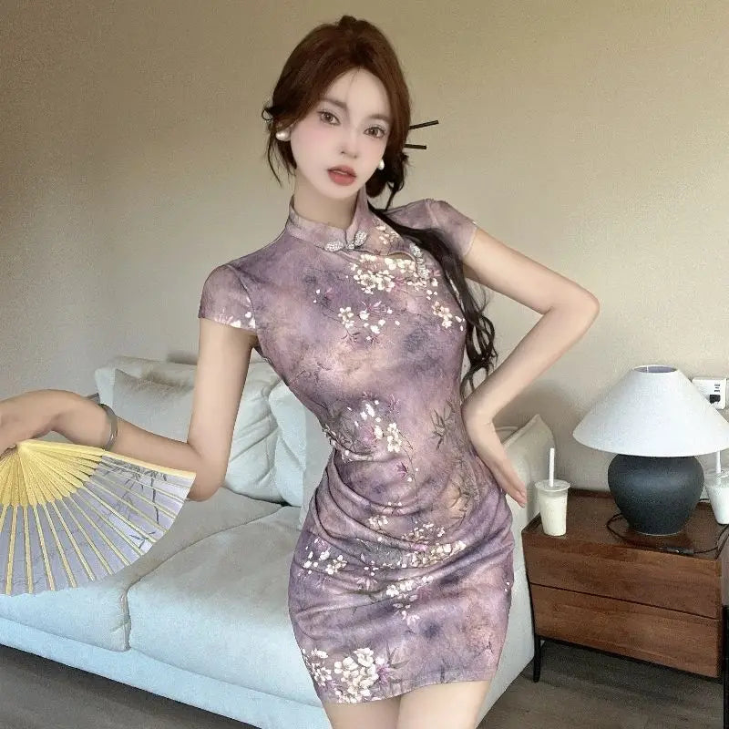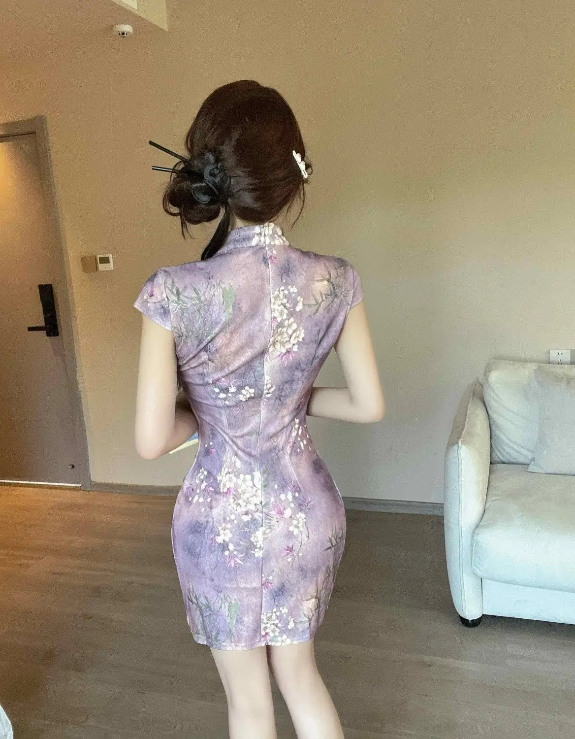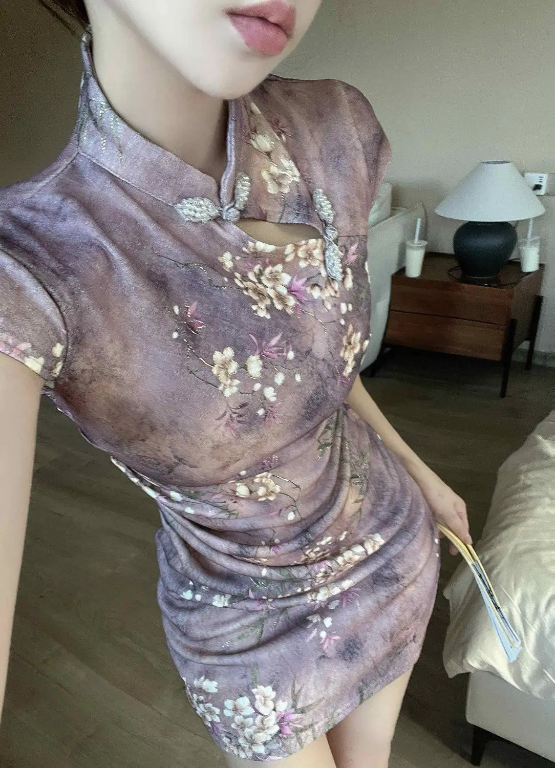 Cyflymder Summer New Chinese Style Improved Cheongsam Women Dress Retro Purple Print Slim Fit Wrap Hip Sexy Mini Dress for Women