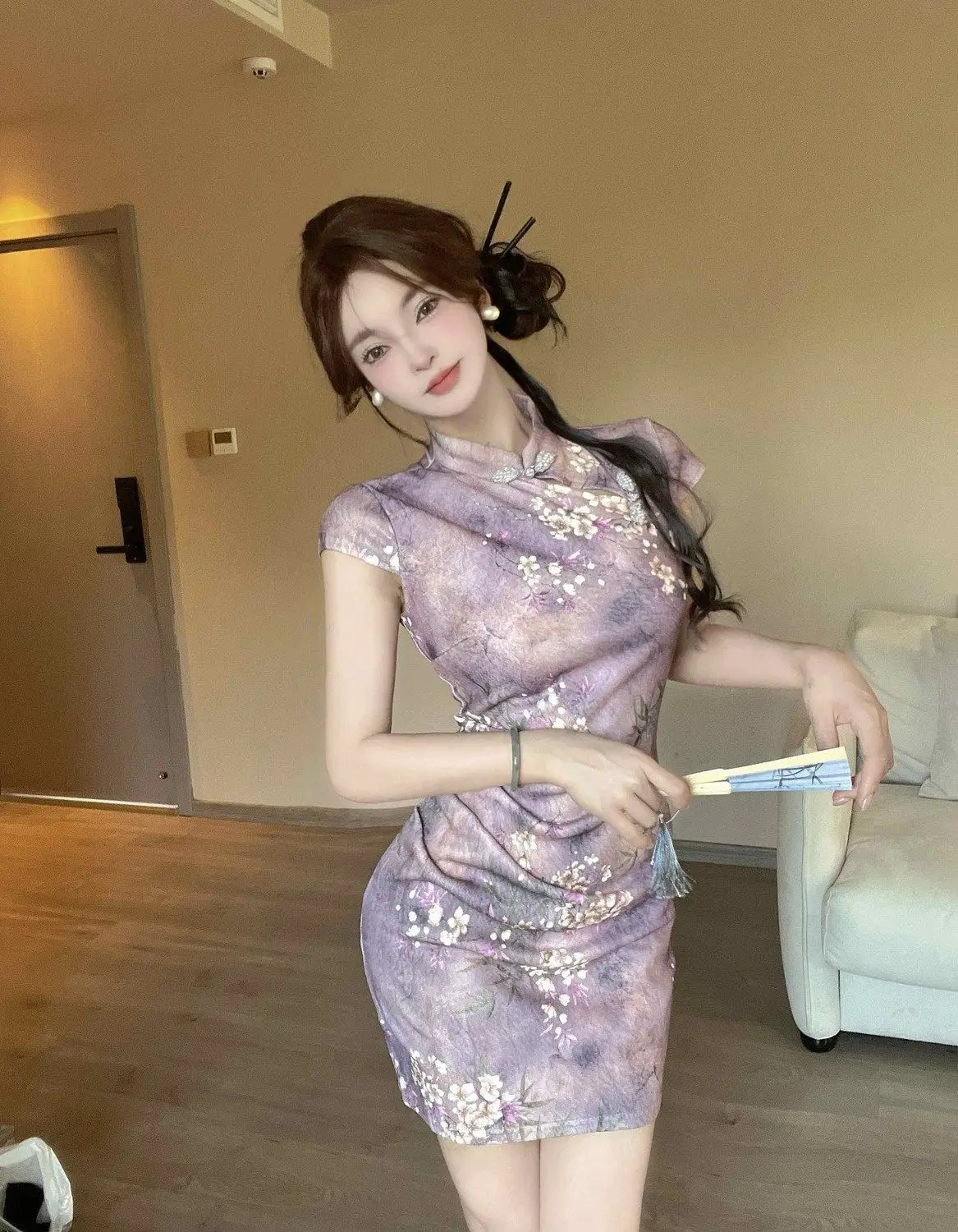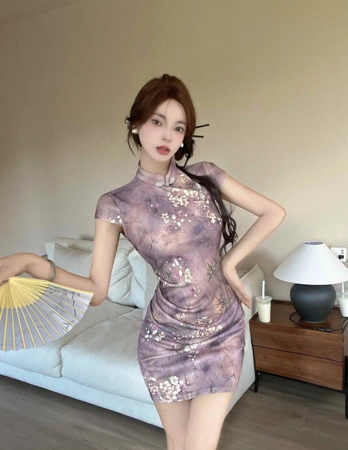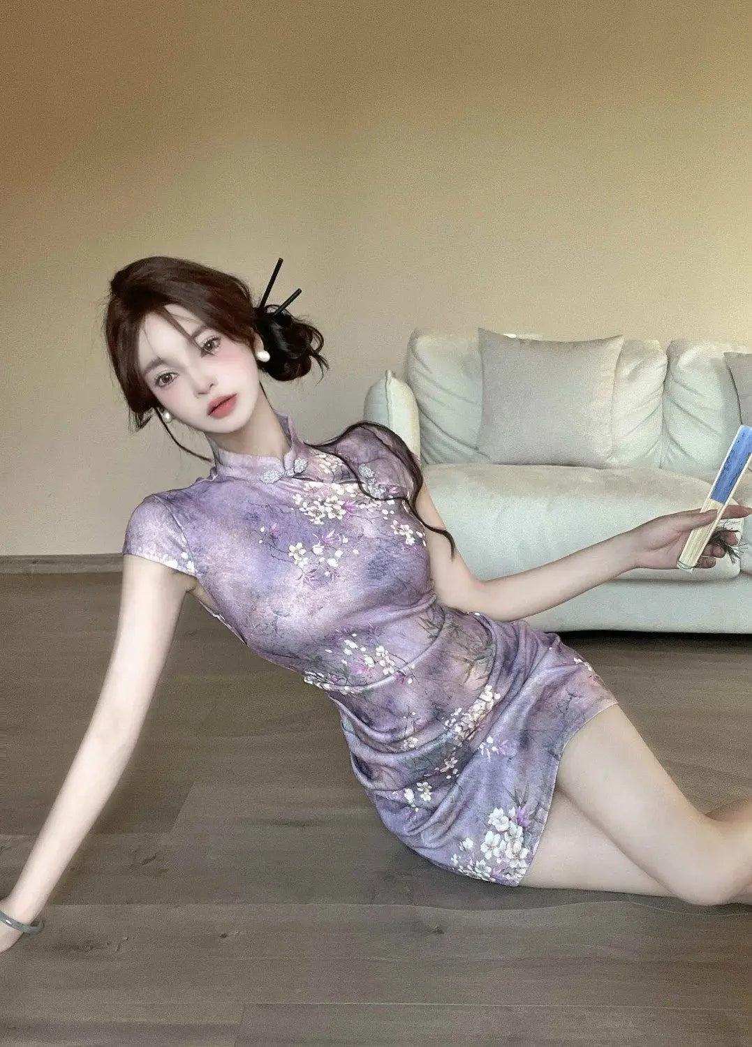 Cyflymder Summer New Chinese Style Improved Cheongsam Women Dress Retro Purple Print Slim Fit Wrap Hip Sexy Mini Dress for Women